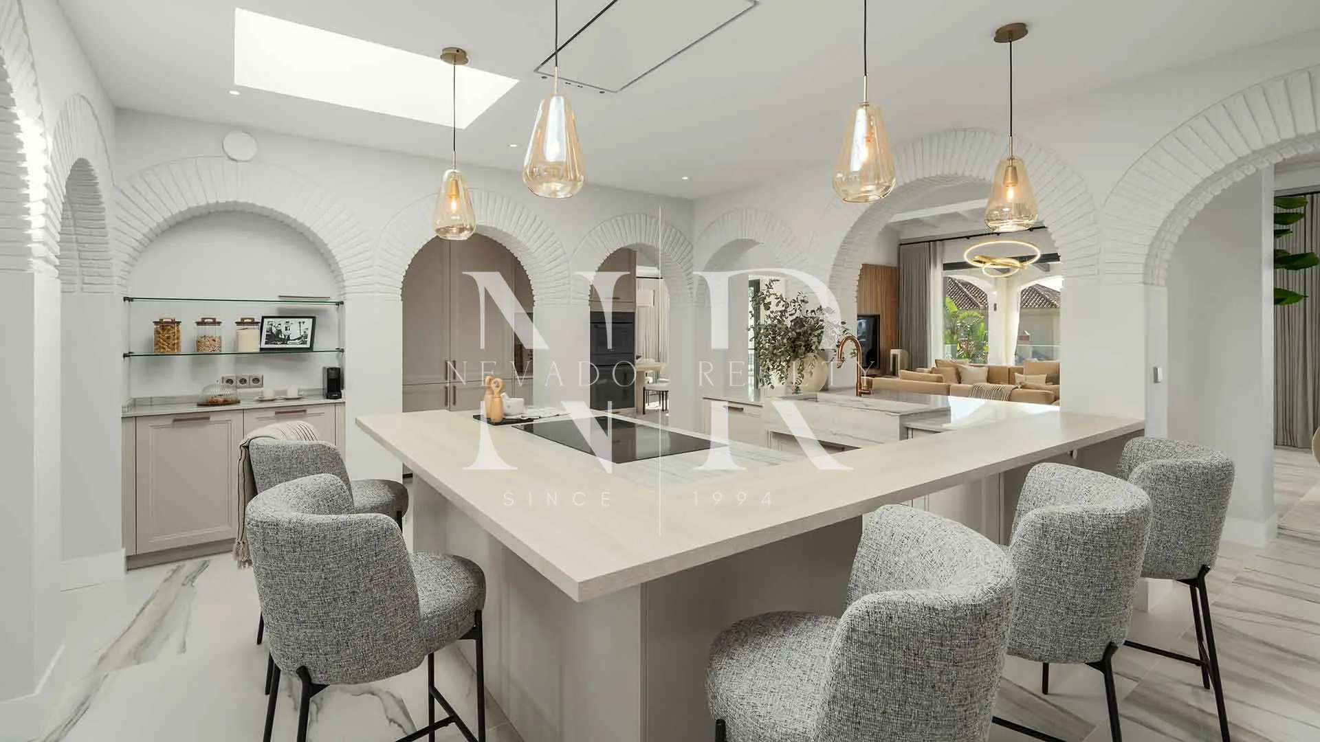 En el interior, la villa ofrece un ambiente cálido y agradable, con un diseño de líneas simples, colores suaves y materiales de calidad. Los arcos, los techos altos con vigas de madera blanca y la luz natural crean espacios abiertos y confortables. La cocina combina estilo y funcionalidad, equipada con electrodomésticos modernos y una gran isla central perfecta para cocinar o disfrutar en compañía.