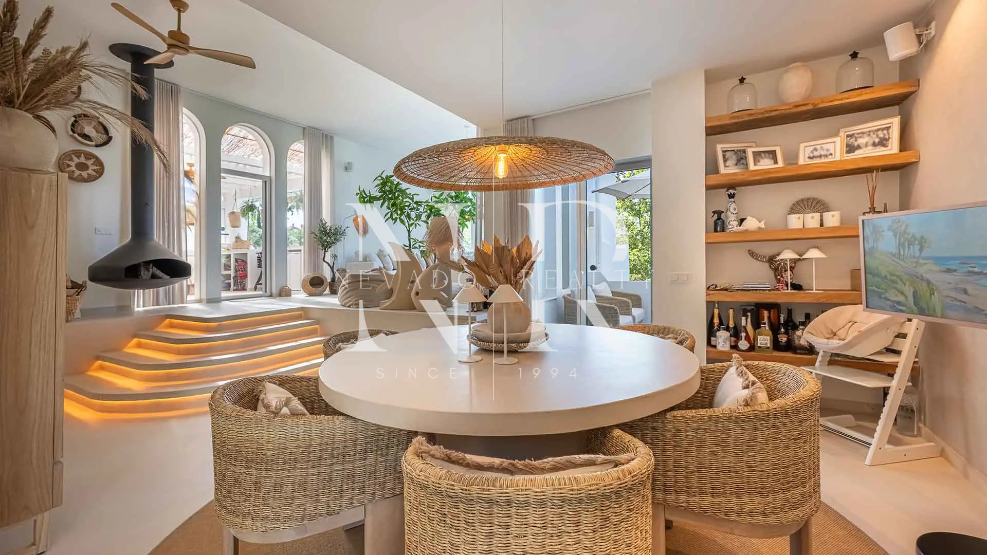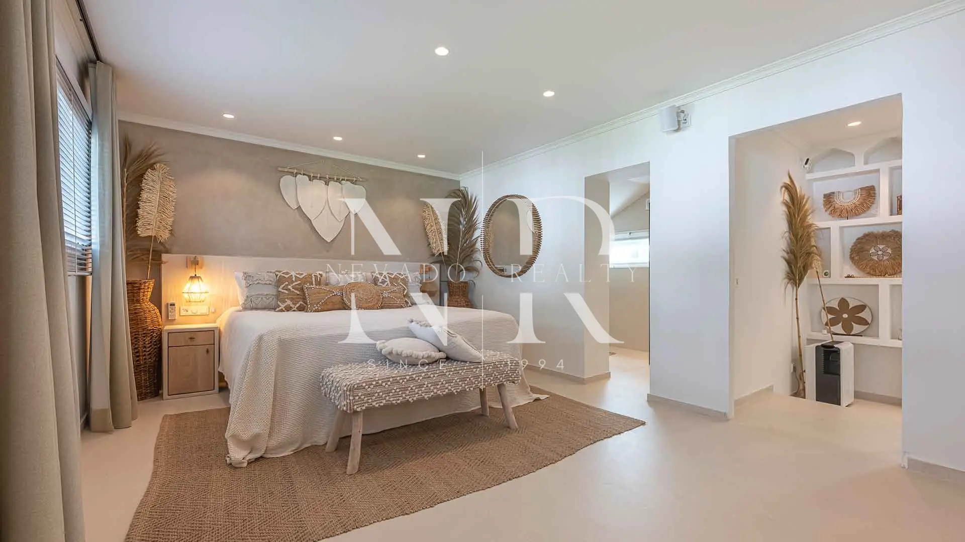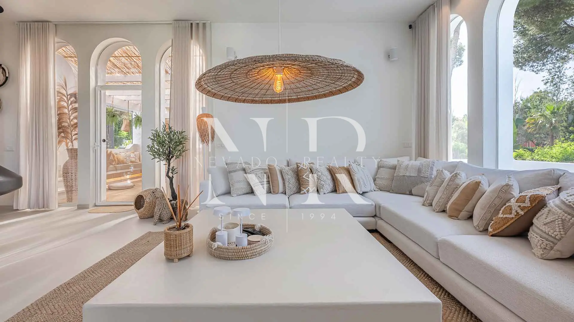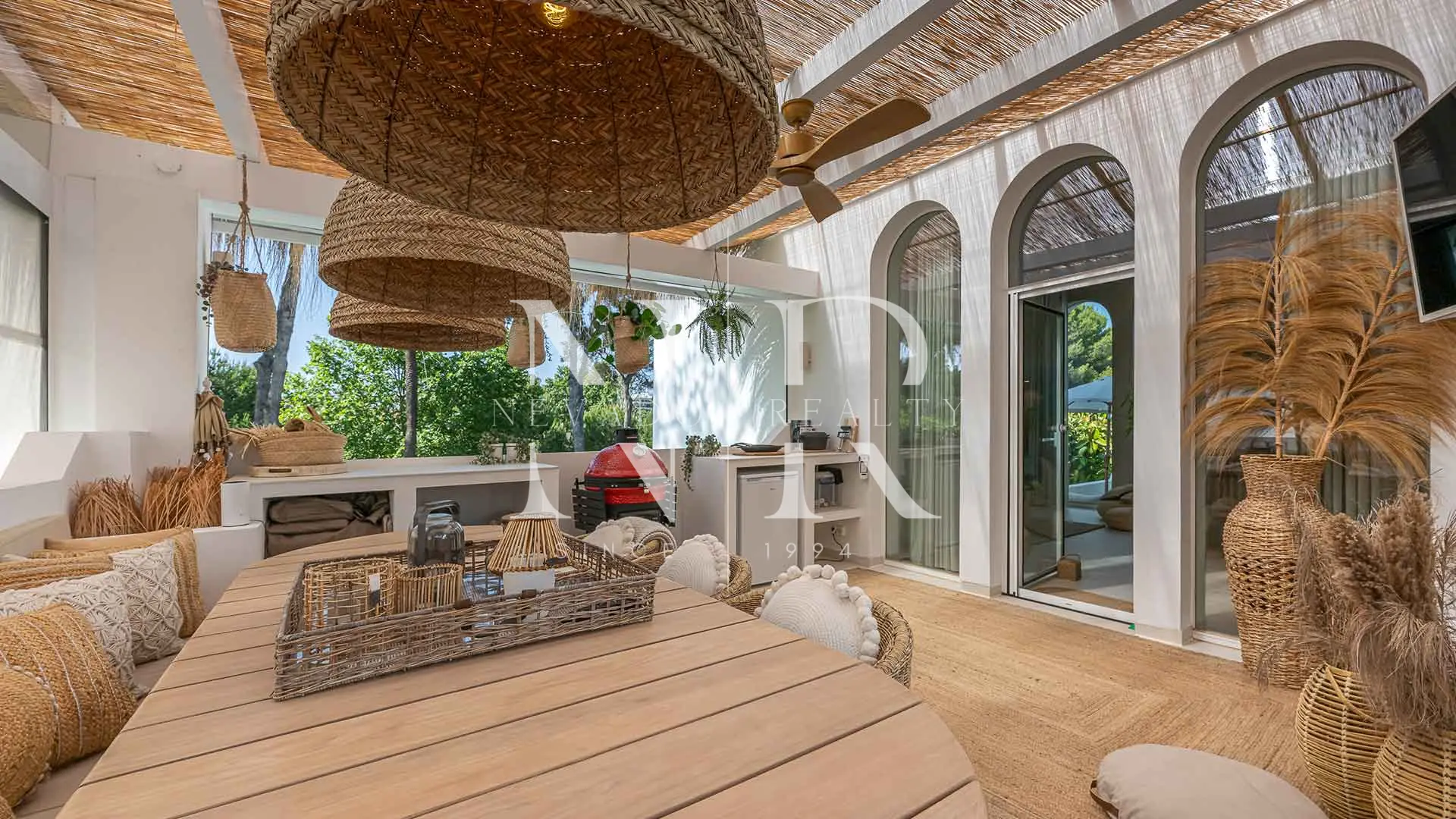 La villa, completamente renovada en 2023 destaca por su arquitectura mediterránea reinterpretada con un sofisticado estilo boho. El interior de la vivienda se ha diseñado para ofrecer amplitud, comodidad y un estilo acogedor a la vez que elegante. La zona de estar de concepto abierto se conecta perfectamente con la moderna cocina. Cada detalle ha sido cuidadosamente seleccionado, combinando elementos naturales como la madera y la cerámica con acabados contemporáneos.
