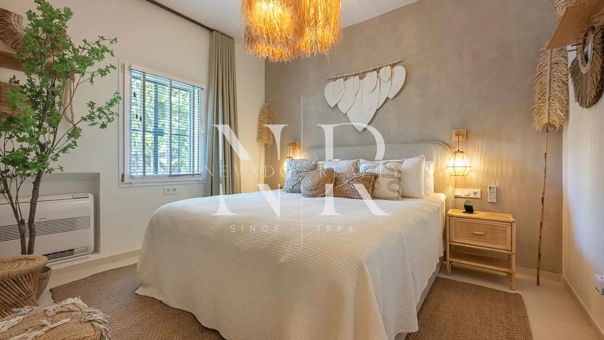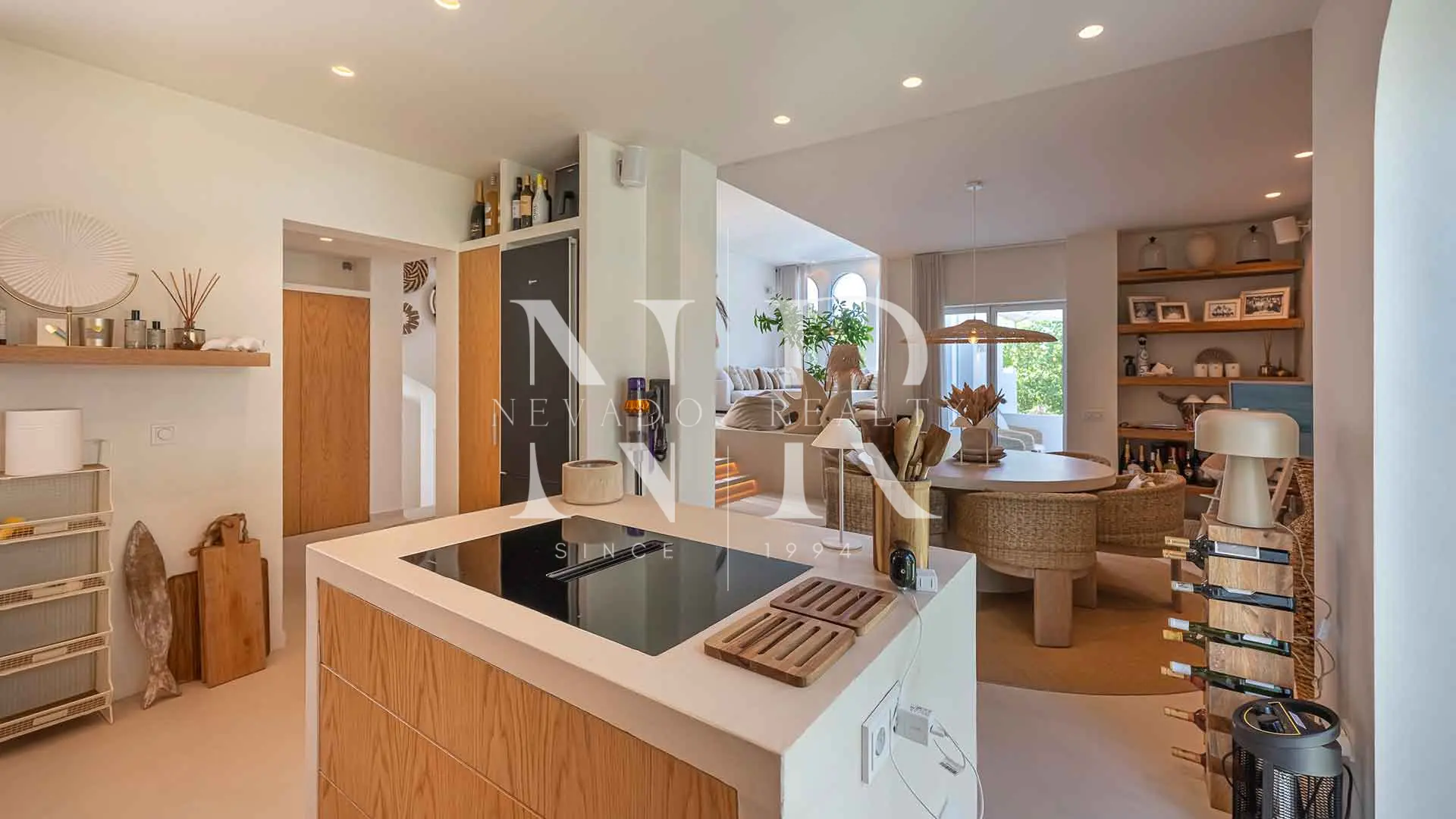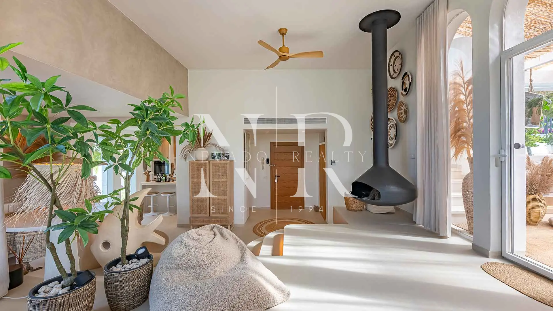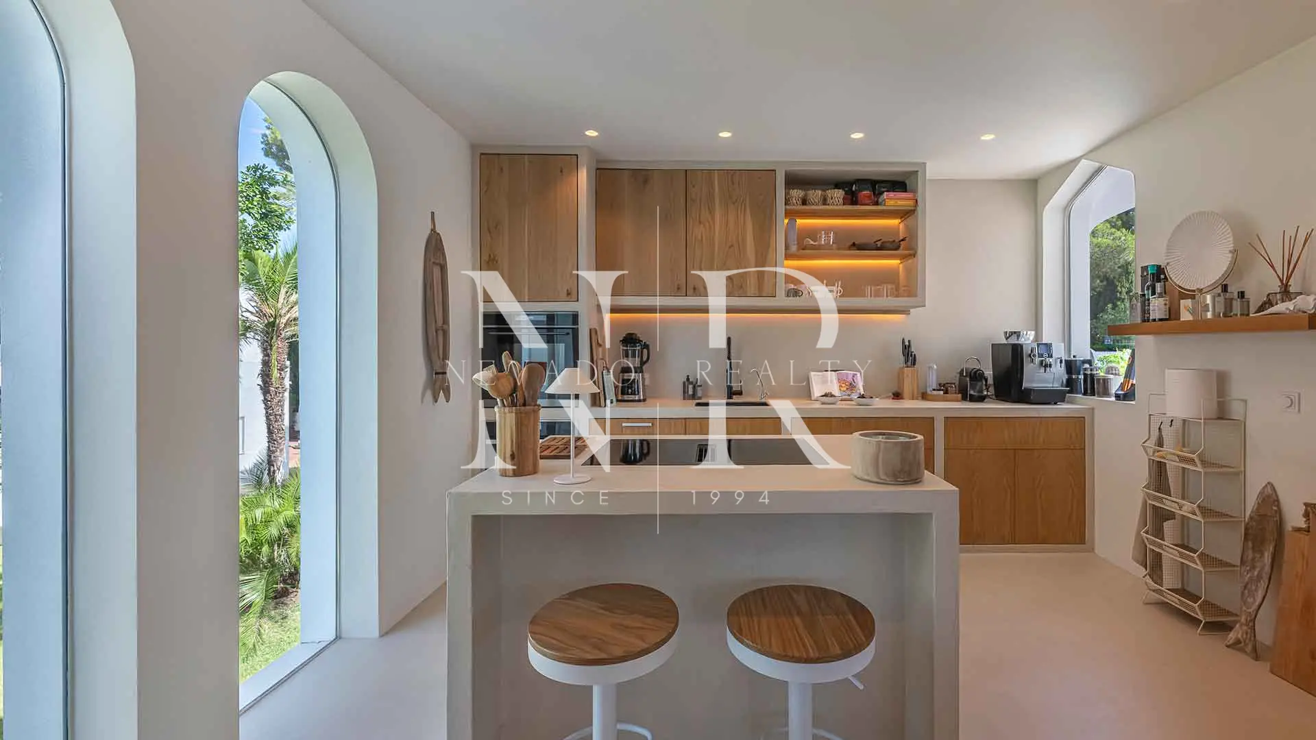 La villa, completamente renovada en 2023 destaca por su arquitectura mediterránea reinterpretada con un sofisticado estilo boho. El interior de la vivienda se ha diseñado para ofrecer amplitud, comodidad y un estilo acogedor a la vez que elegante. La zona de estar de concepto abierto se conecta perfectamente con la moderna cocina. Cada detalle ha sido cuidadosamente seleccionado, combinando elementos naturales como la madera y la cerámica con acabados contemporáneos.