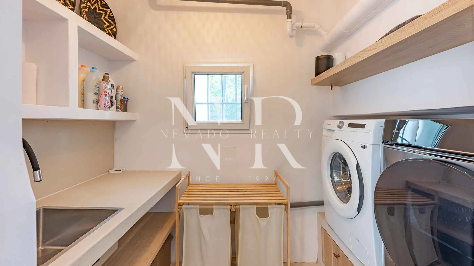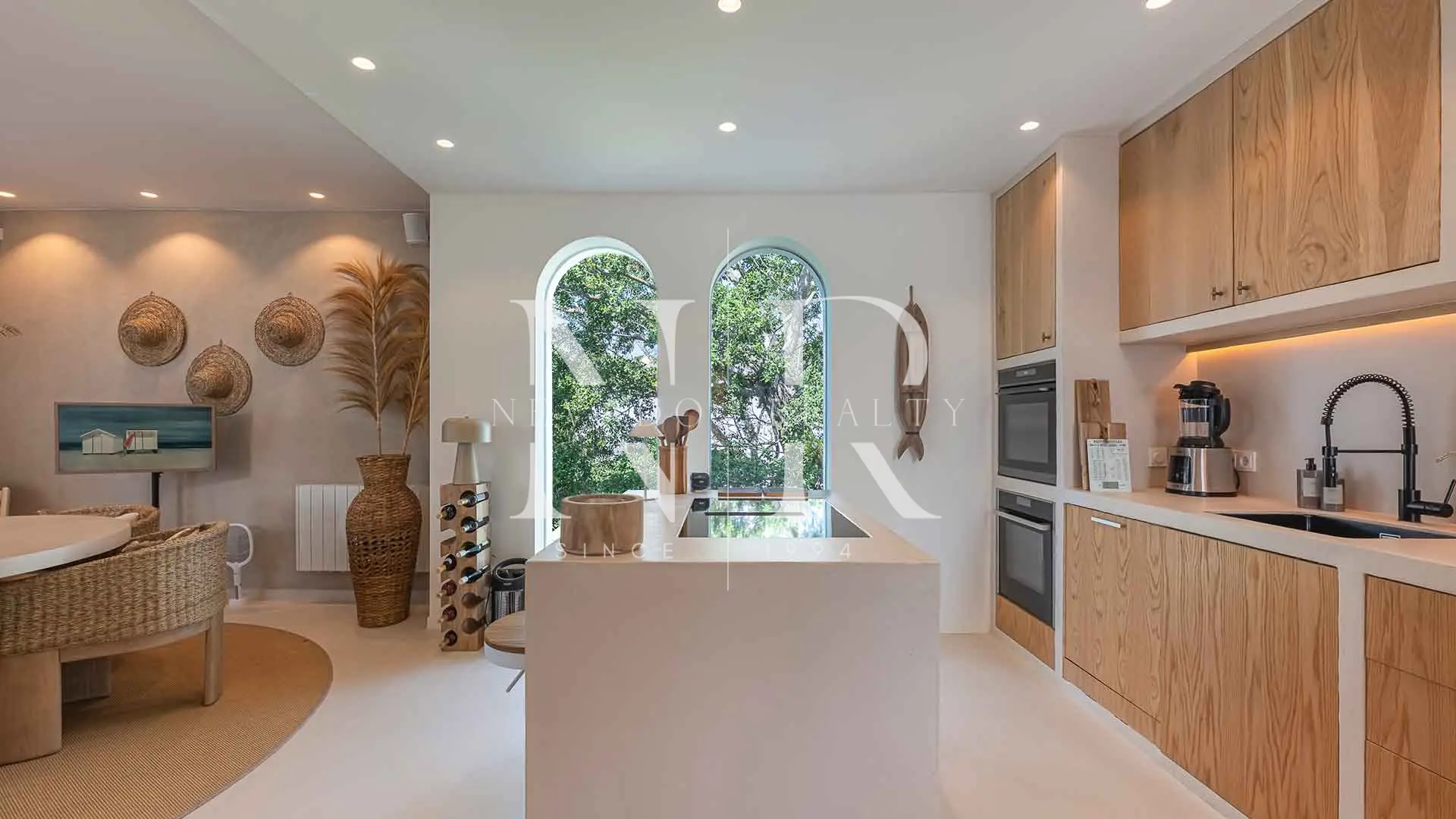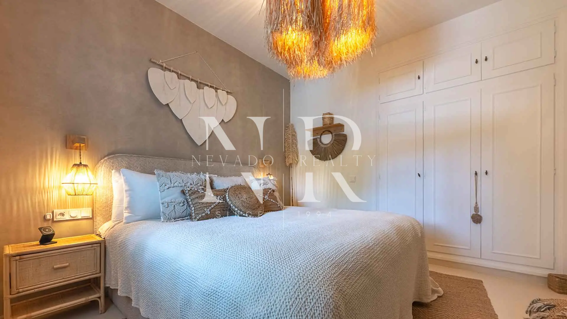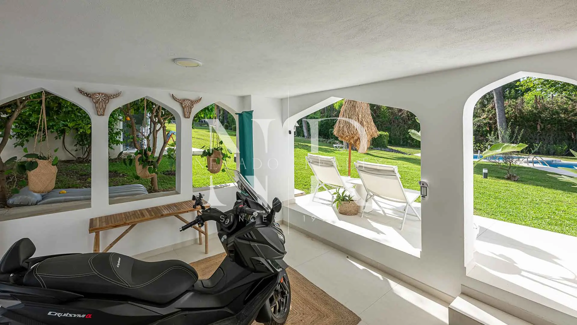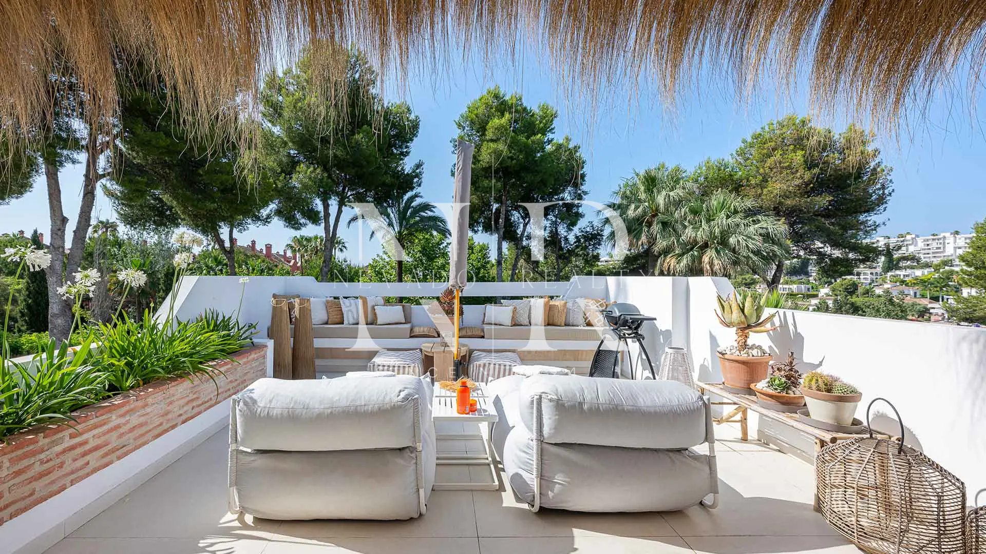 La villa, completamente renovada en 2023 destaca por su arquitectura mediterránea reinterpretada con un sofisticado estilo boho. El interior de la vivienda se ha diseñado para ofrecer amplitud, comodidad y un estilo acogedor a la vez que elegante. La zona de estar de concepto abierto se conecta perfectamente con la moderna cocina. Cada detalle ha sido cuidadosamente seleccionado, combinando elementos naturales como la madera y la cerámica con acabados contemporáneos.