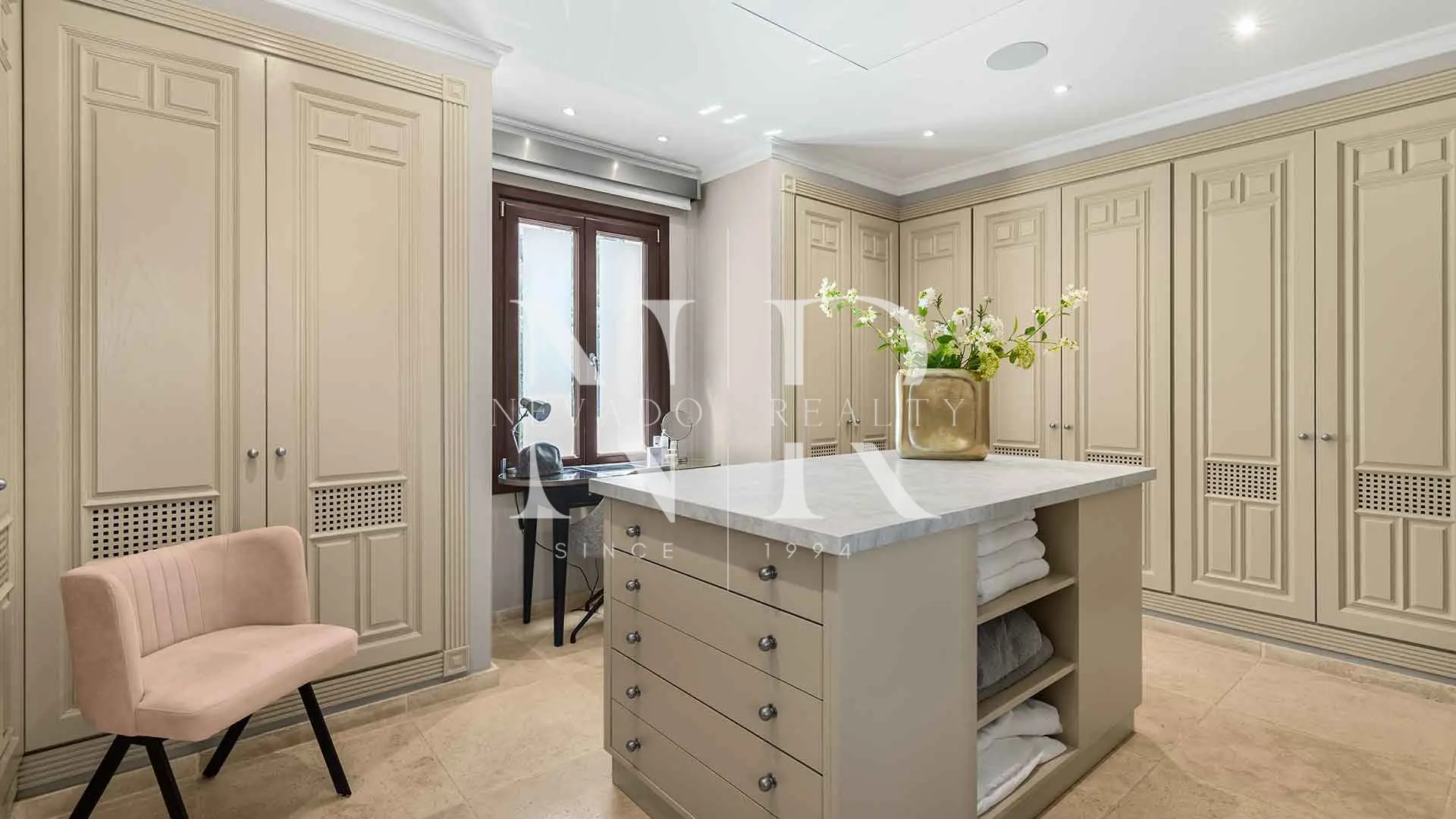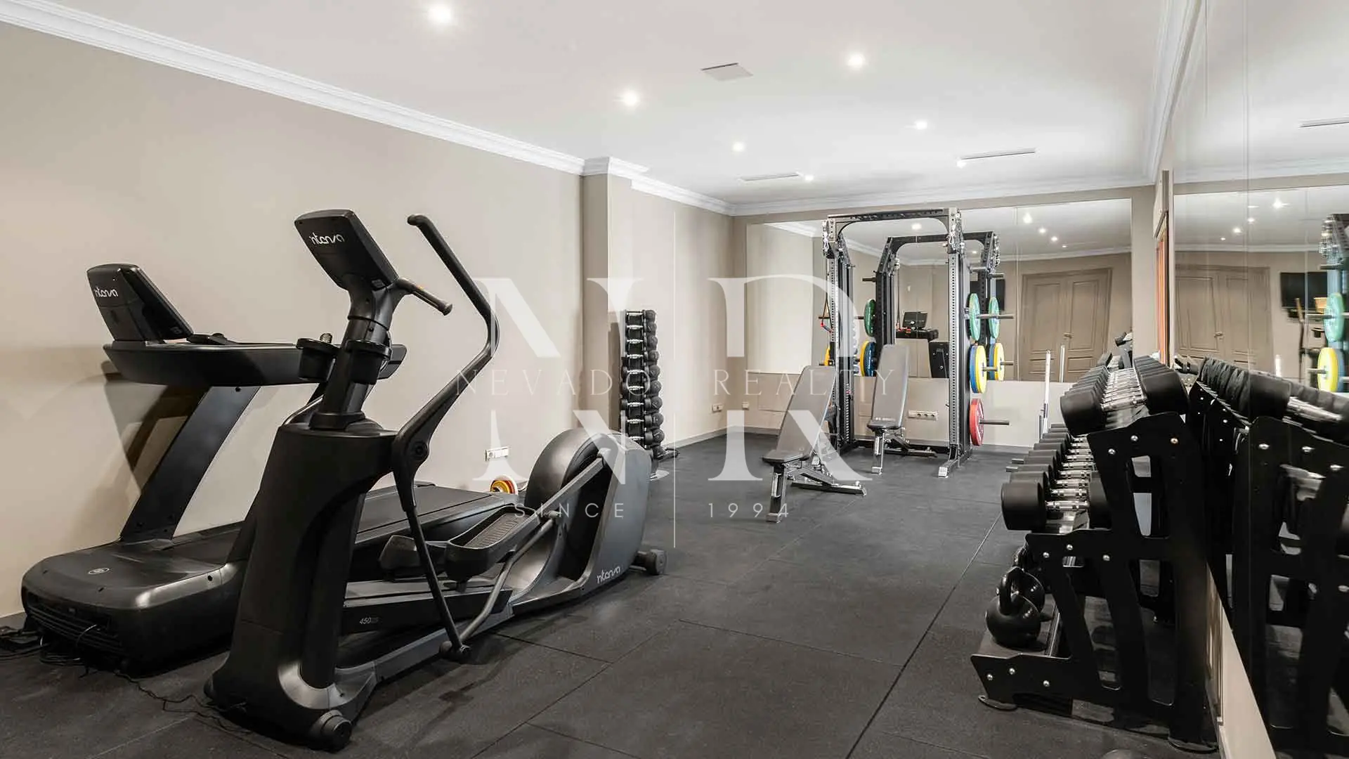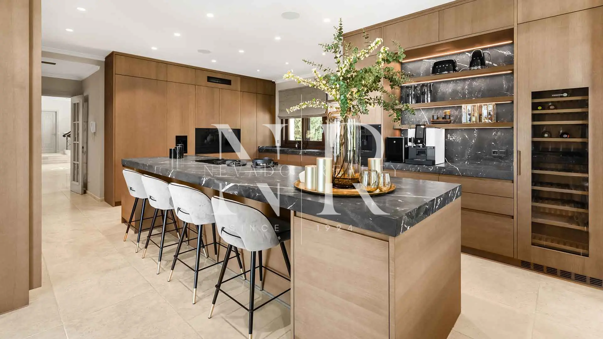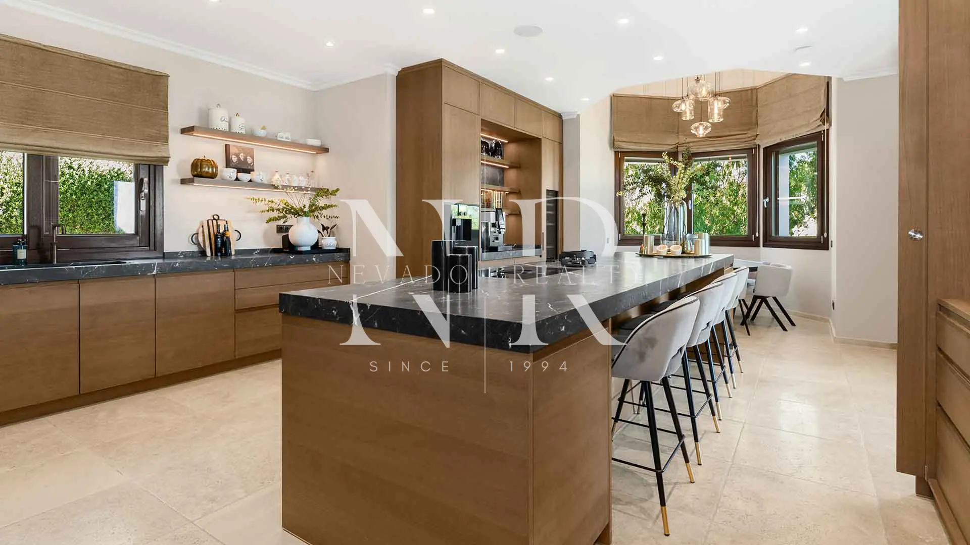 La moderna cocina a medida, equipada con electrodomésticos Gaggenau de alta gama, está diseñada para ofrecer funcionalidad y estilo. En el exterior, la gran piscina climatizada invita a disfrutar todo el año, mientras que los jardines con olivos maduros proporcionan un entorno sereno para la relajación. La orientación sur asegura abundante luz natural durante todo el día, haciendo de cada rincón de esta casa una escapada tranquila.