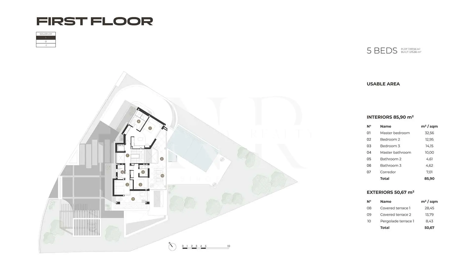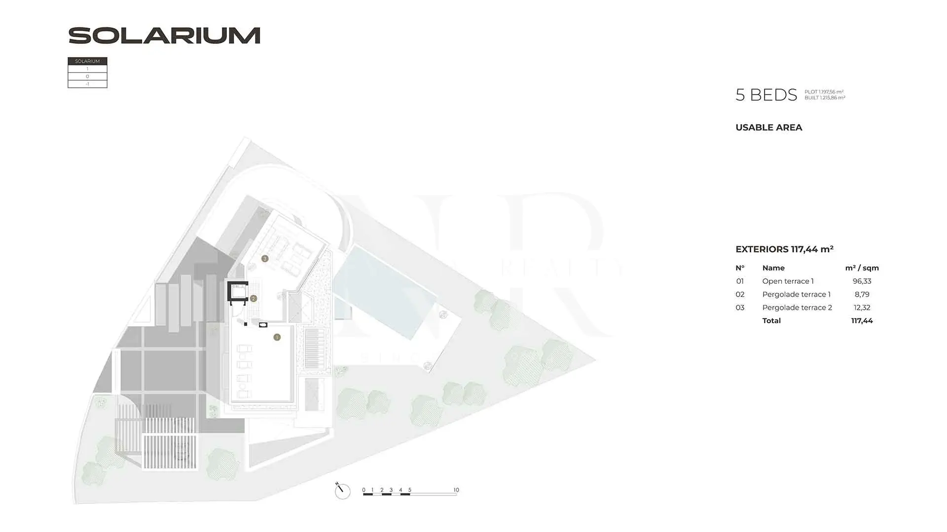 En la planta superior, la distribución está dedicada al descanso y la tranquilidad. La suite principal y las dos habitaciones adicionales incluyen cada una un cuarto de baño privado, vestidores y acceso a terrazas soleadas que se abren al entorno natural. La villa se corona con un solárium, con pérgolas, zona de barbacoa y preinstalación para un jacuzzi.