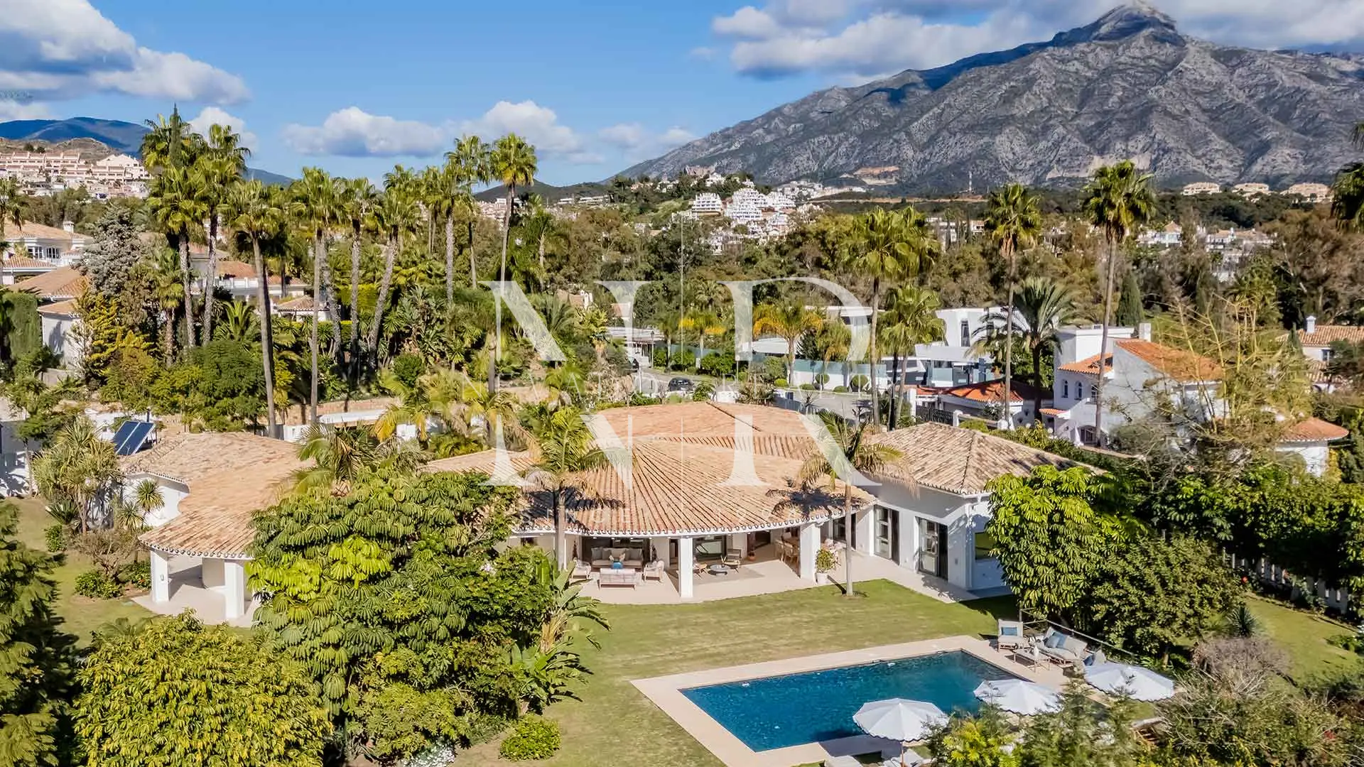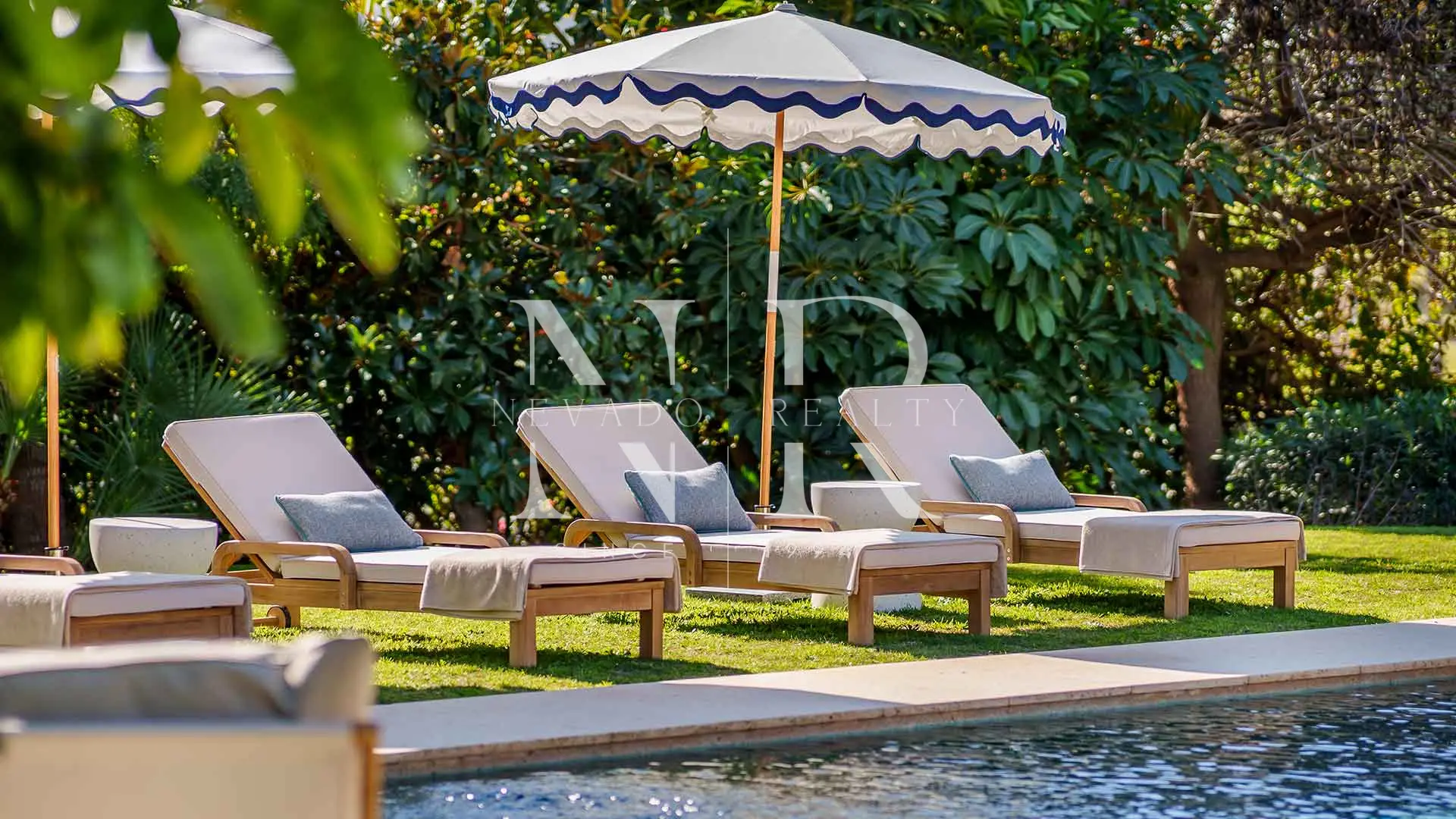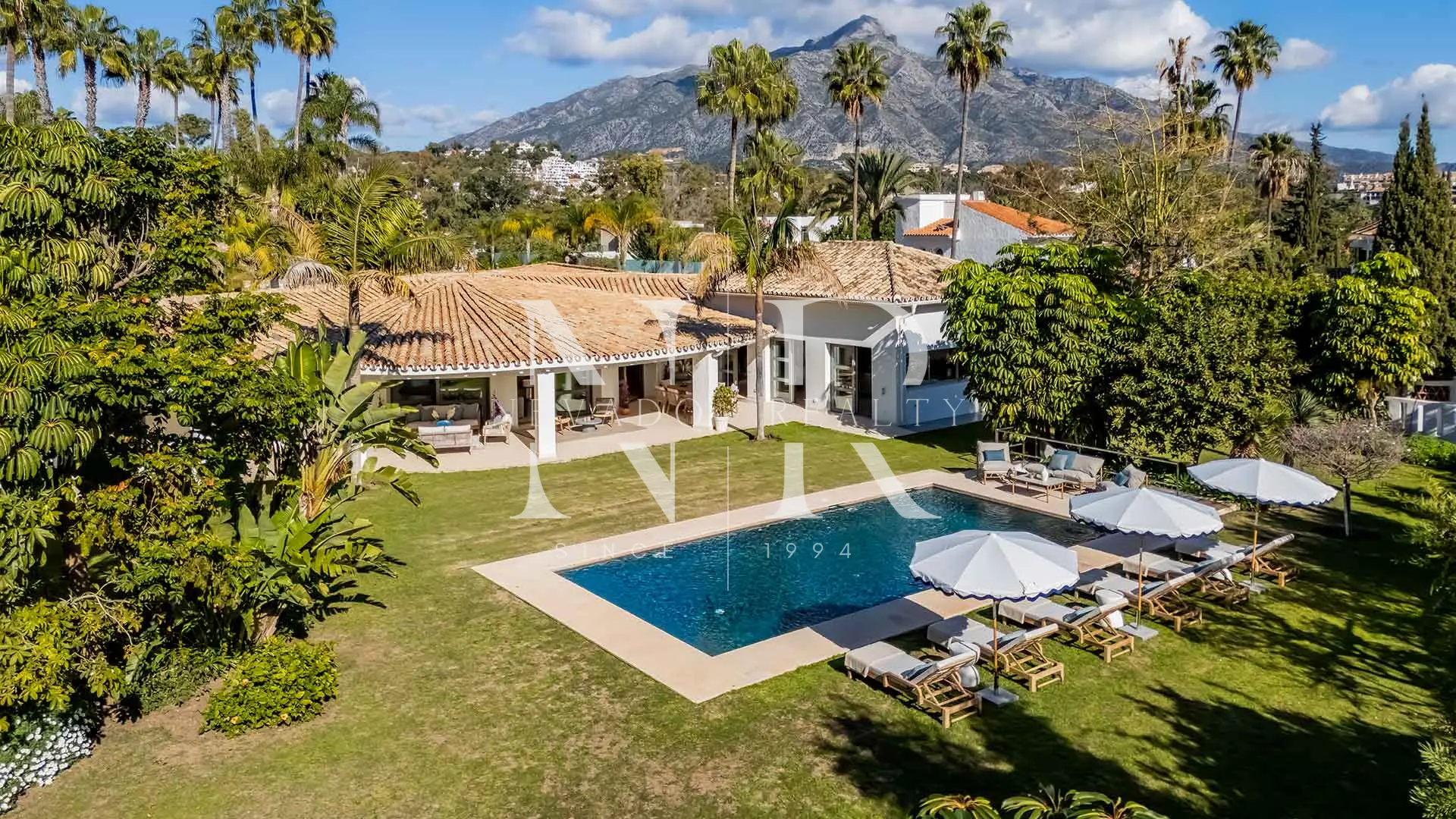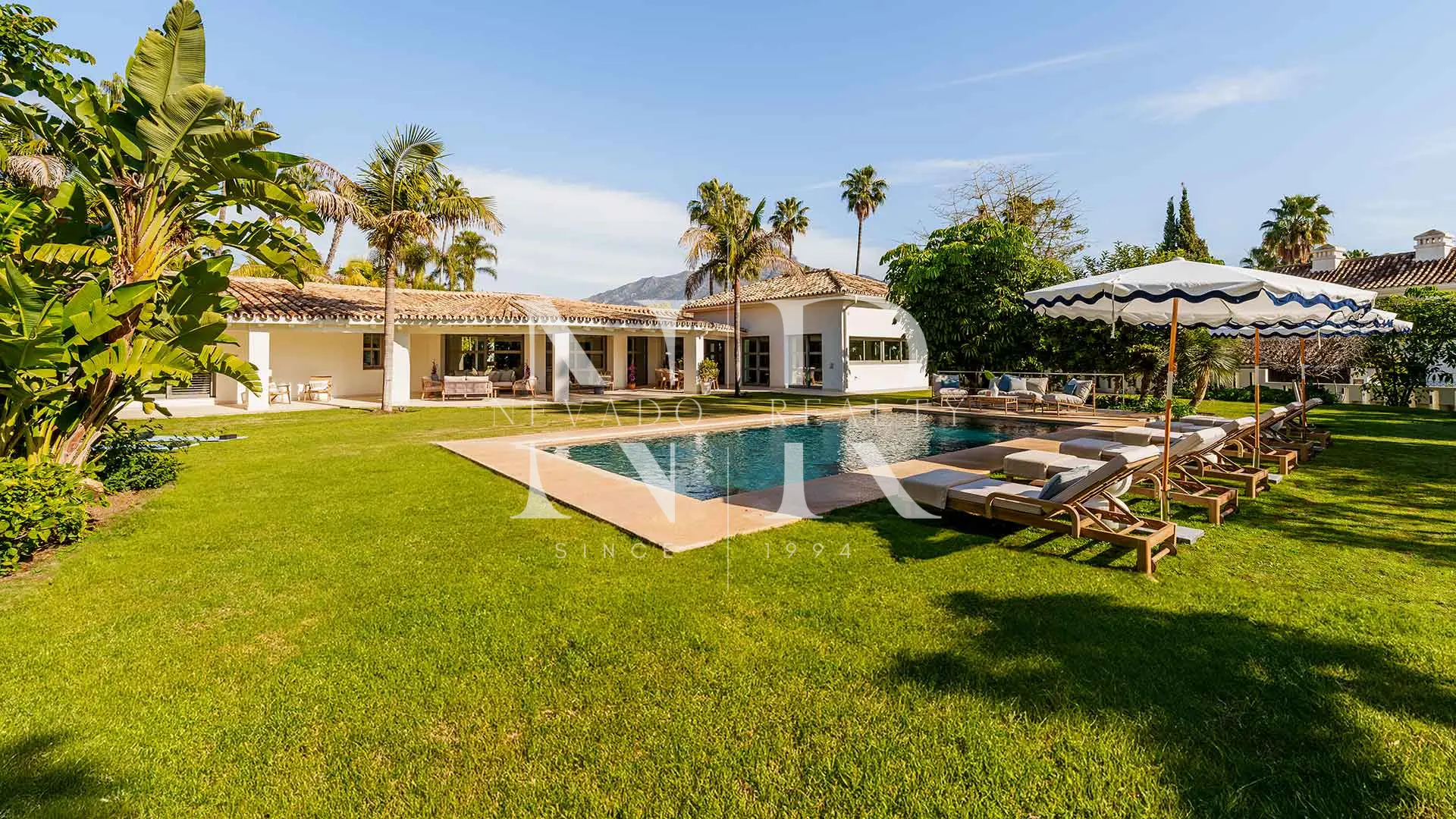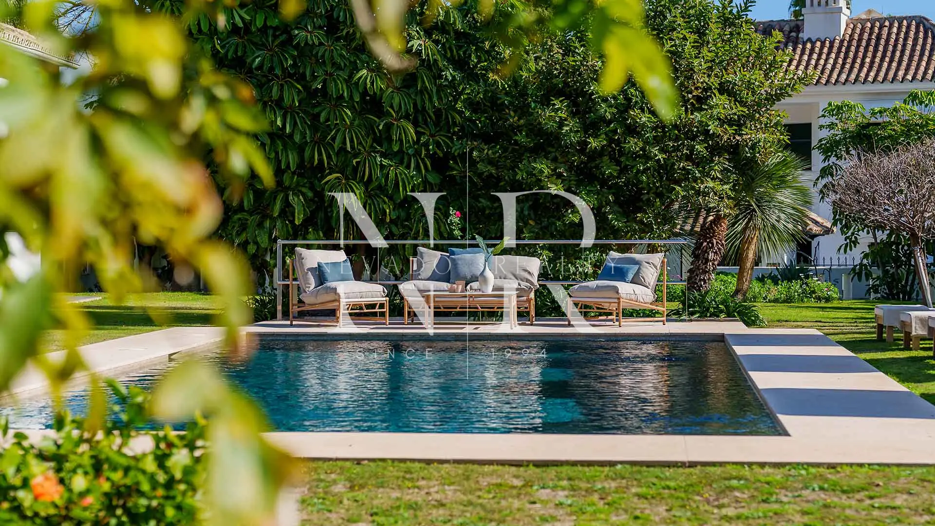 Villa en Urbanización La Cerquilla completamente renovada en venta. Ubicada en este prestigioso enclave de Nueva Andalucía, esta exquisita villa de un solo nivel ofrece una rara mezcla de sofisticación y tranquilidad. Ubicada en una generosa parcela llana de 3.062 m², la propiedad está rodeada por un jardín meticulosamente cuidado, con ficus maduros, altísimas palmeras, vibrantes jacarandas y exóticas especies tropicales.