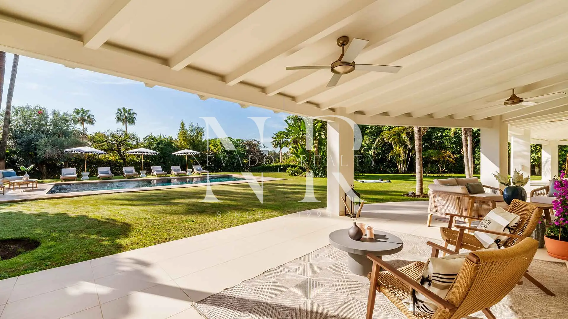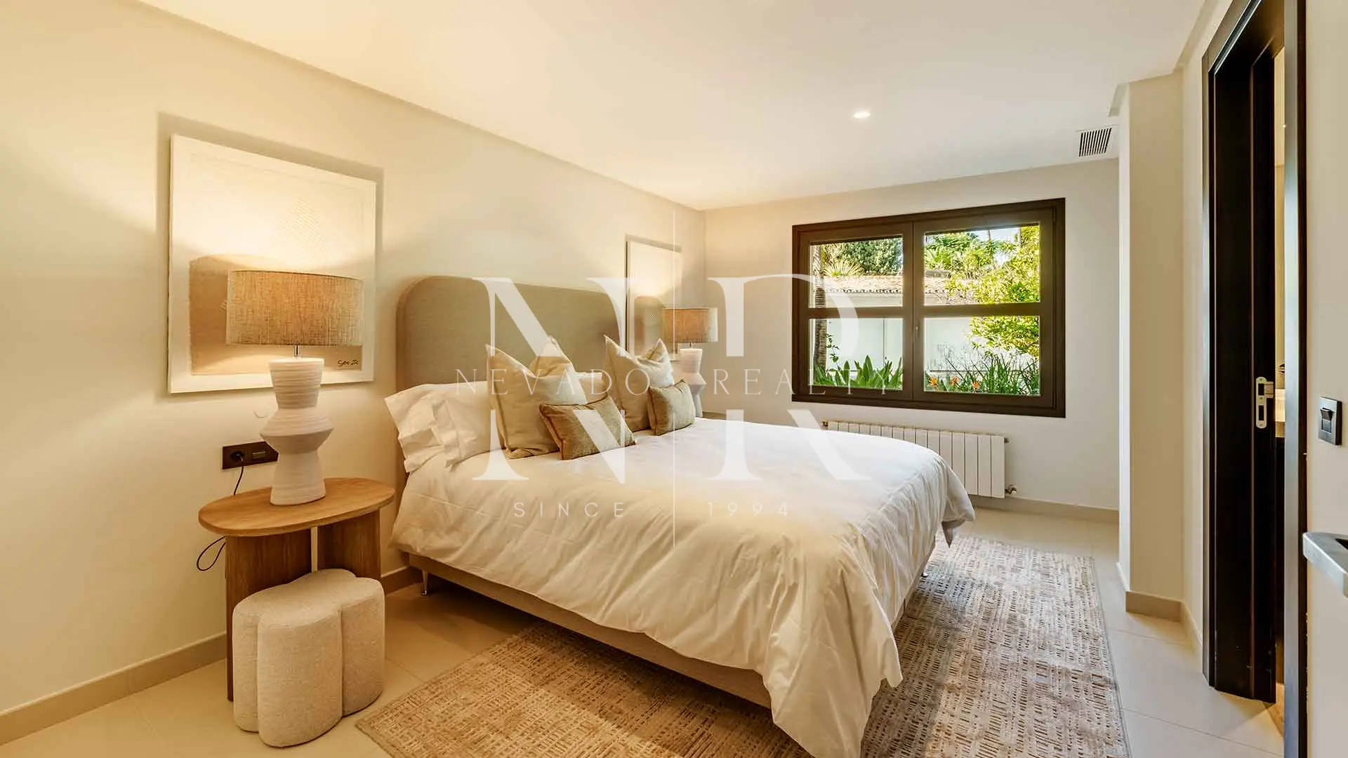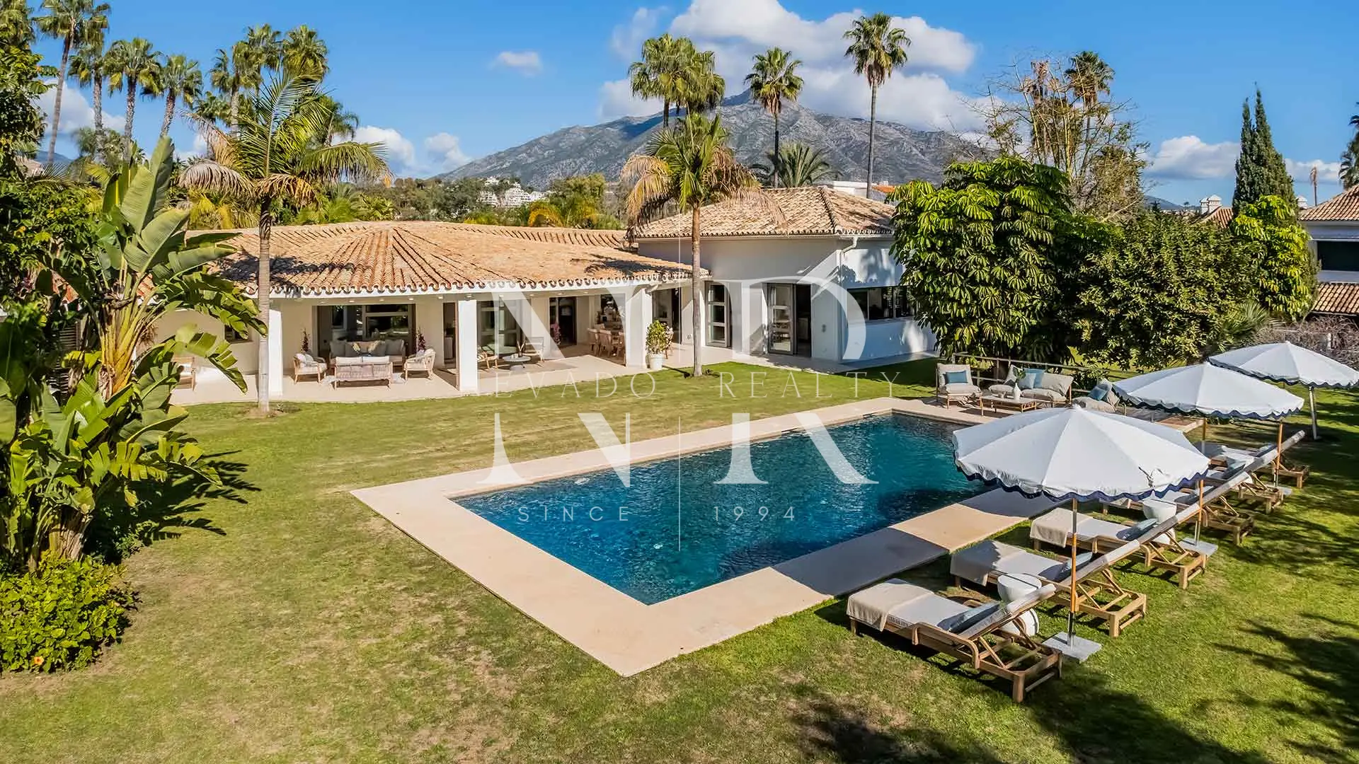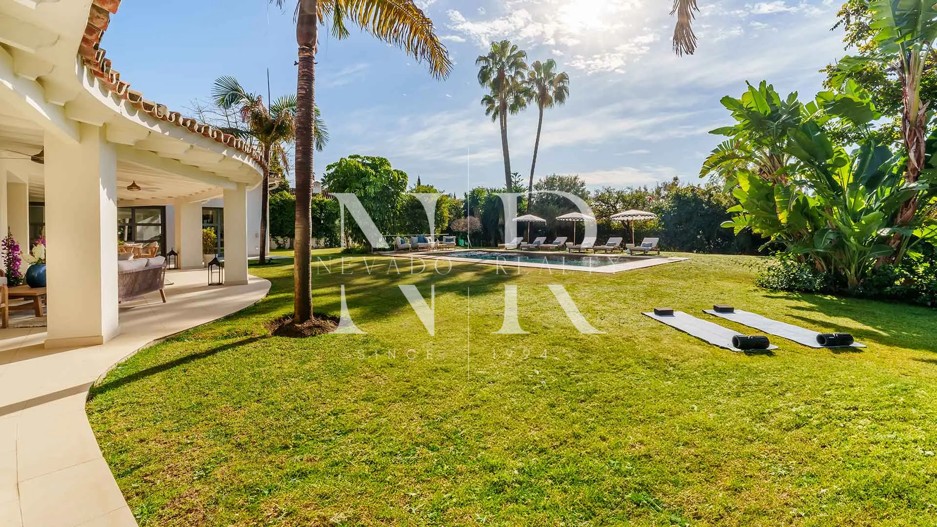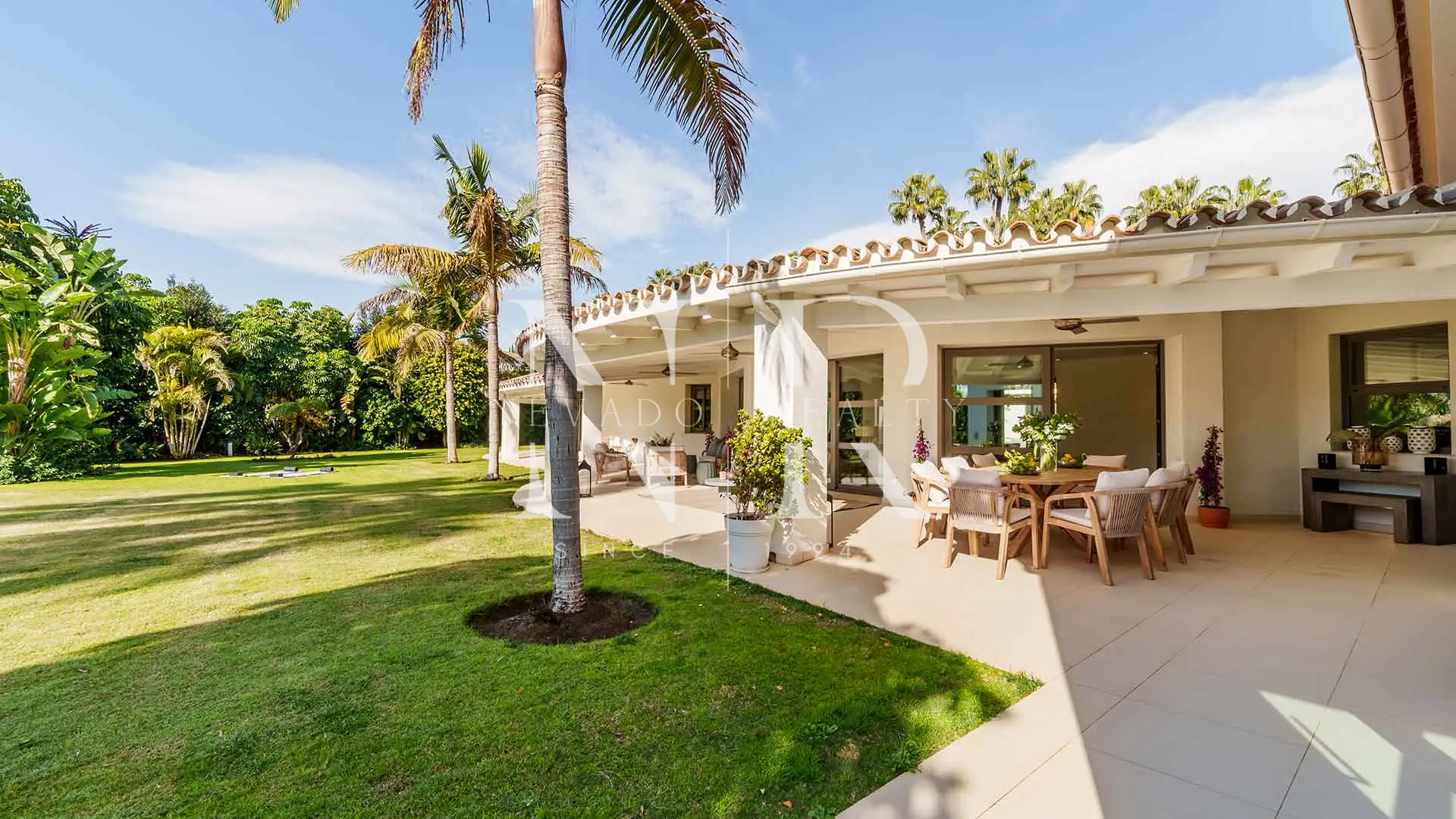 Villa en Urbanización La Cerquilla completamente renovada en venta. Ubicada en este prestigioso enclave de Nueva Andalucía, esta exquisita villa de un solo nivel ofrece una rara mezcla de sofisticación y tranquilidad. Ubicada en una generosa parcela llana de 3.062 m², la propiedad está rodeada por un jardín meticulosamente cuidado, con ficus maduros, altísimas palmeras, vibrantes jacarandas y exóticas especies tropicales.