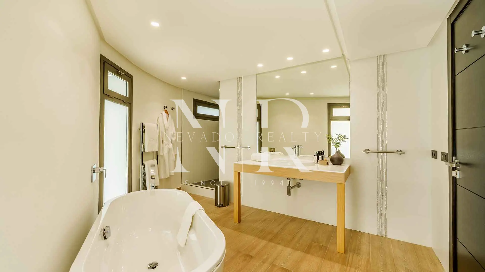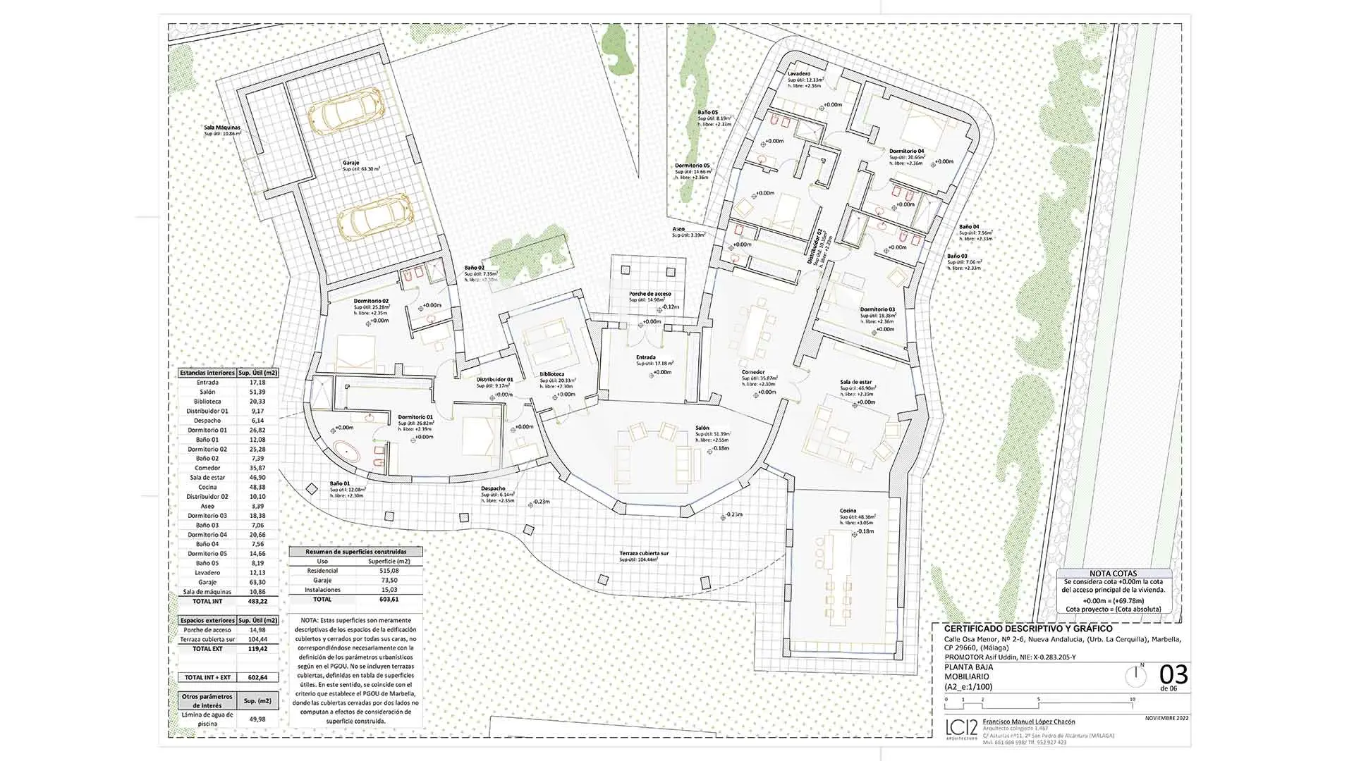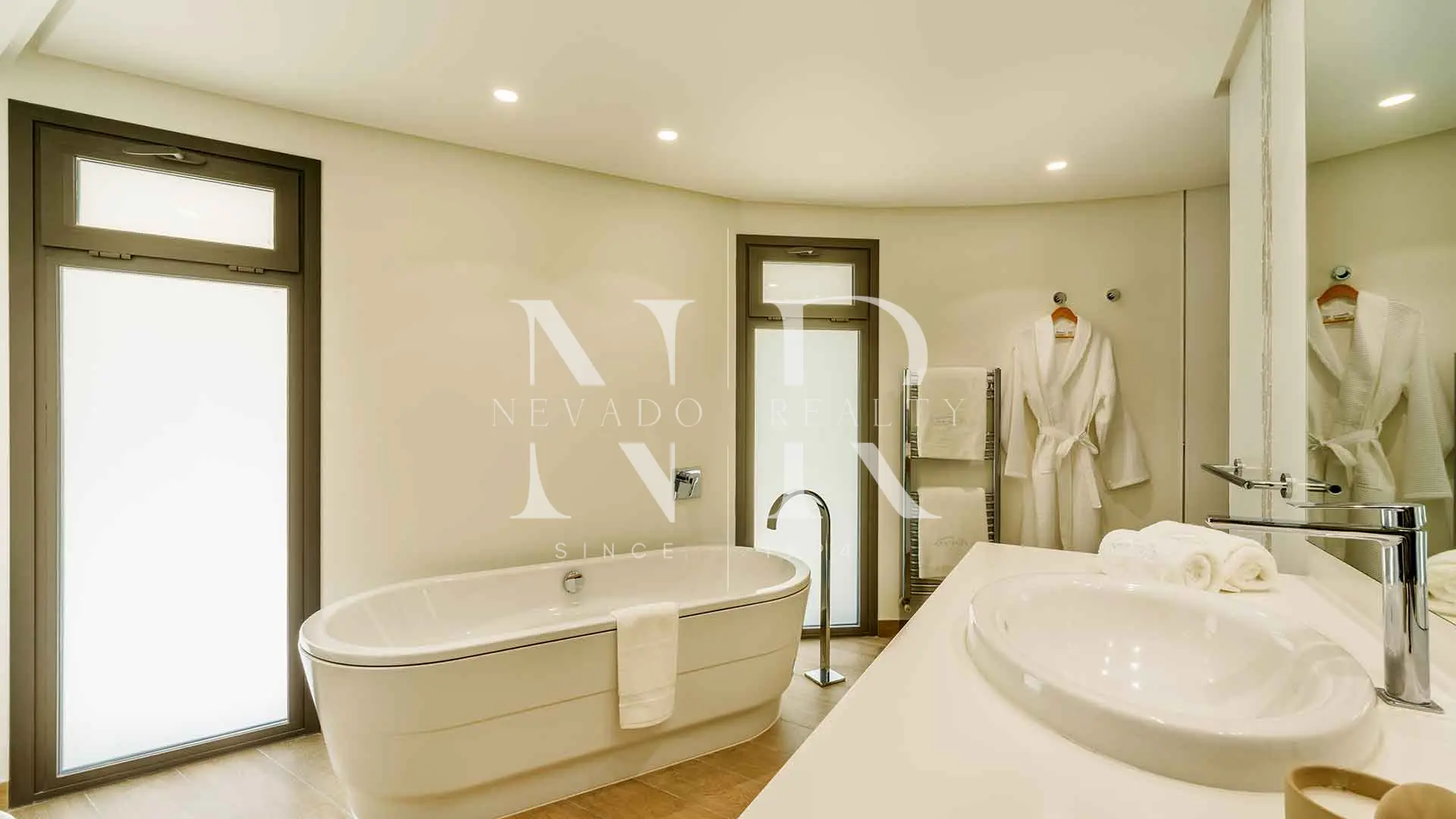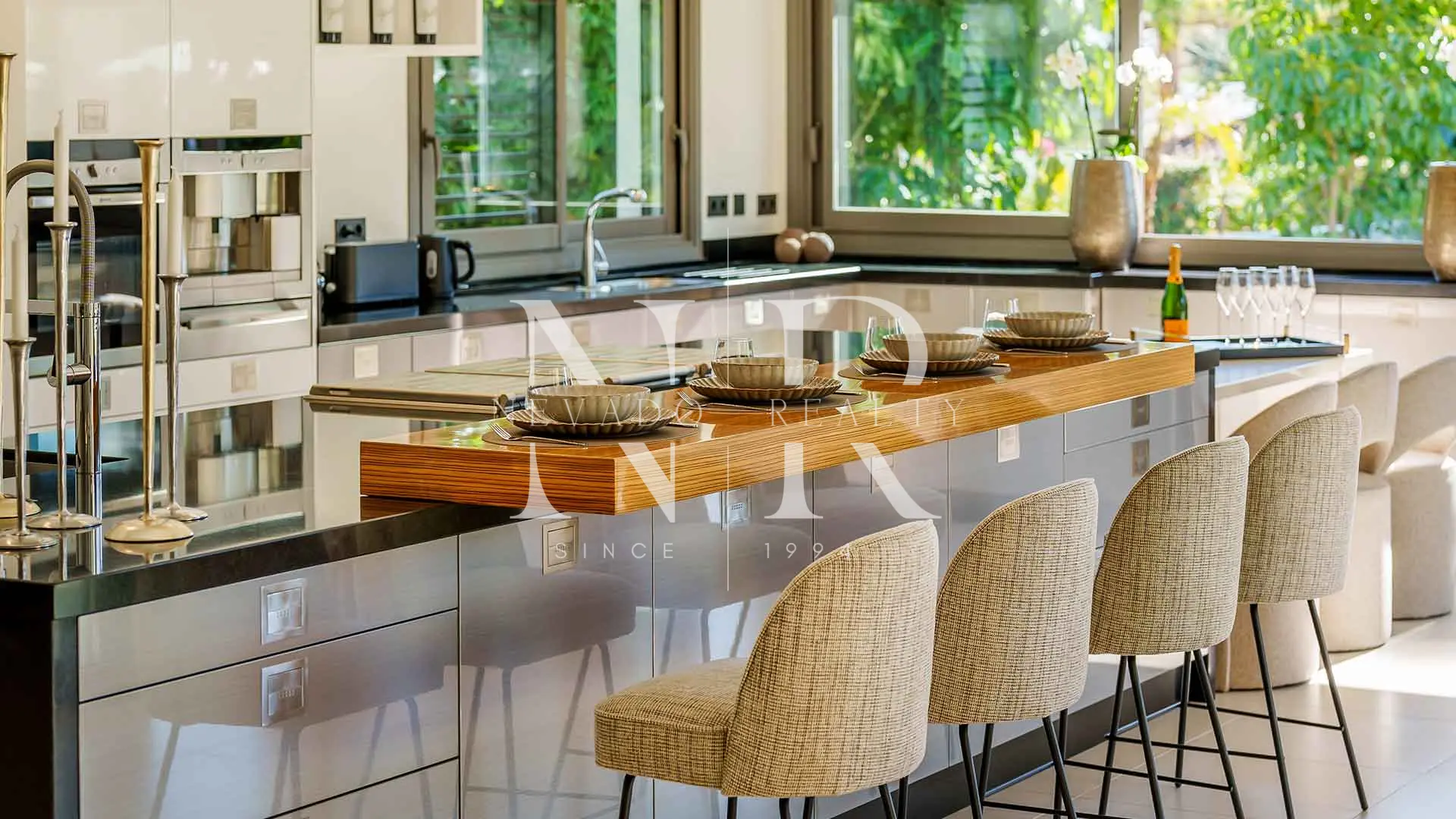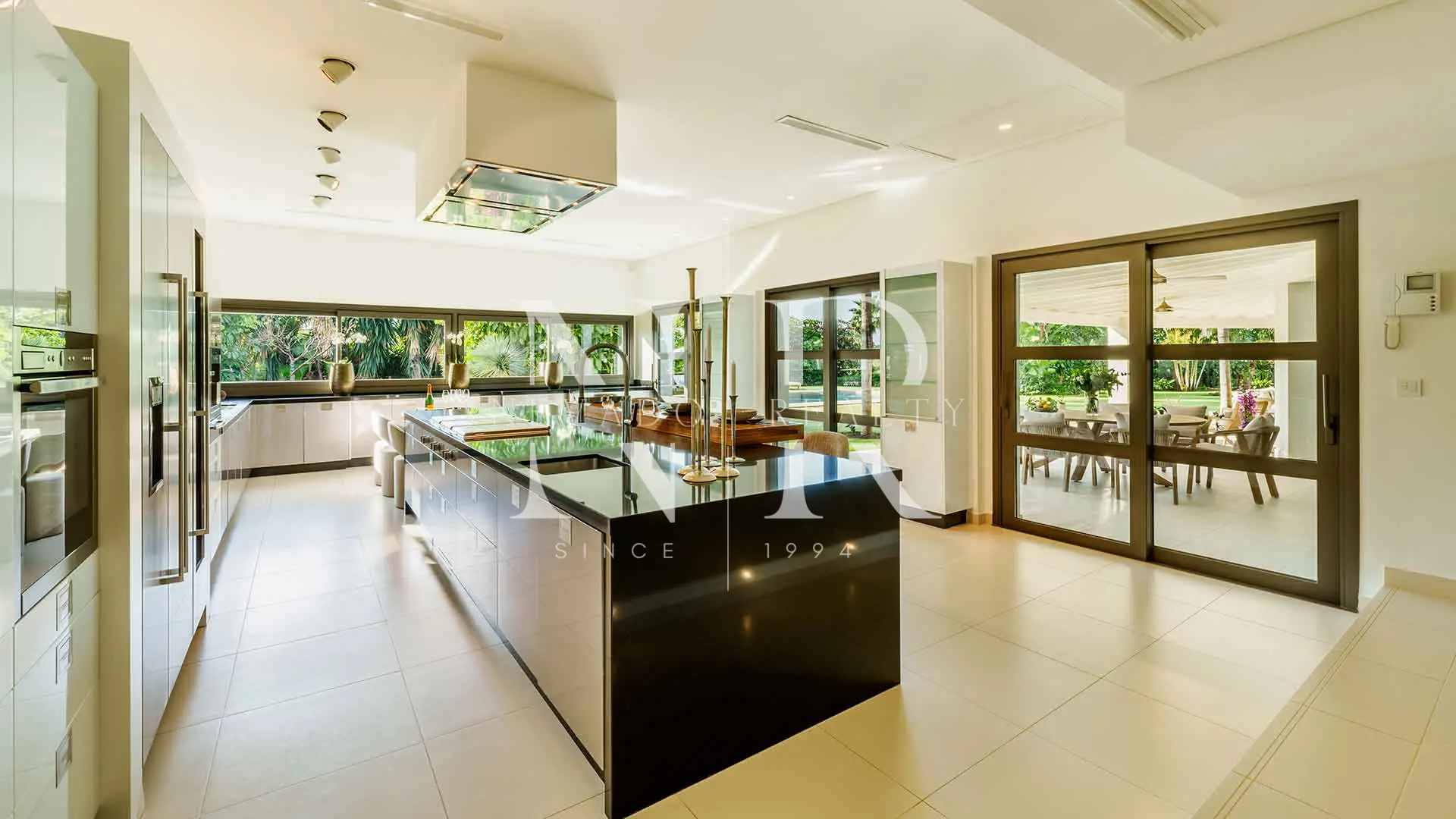 Con una superficie de 603 m², la distribución tipo bungalow de la villa favorece una vida interior y exterior sin esfuerzo, con acceso directo al jardín desde los cinco dormitorios. En el corazón de la casa, una amplia cocina Danespan de planta abierta cuenta con una gran isla central y dos comedores. Las elegantes salas de estar incluyen dos amplios salones, una biblioteca y un despacho, que proporcionan versatilidad y comodidad. Dos de los dormitorios son lujosos retiros en suite, que ofrecen privacidad y relajación. Los acabados de alta gama, las ventanas de seguridad Technal y la iluminación Lutron contribuyen a la excepcional artesanía y seguridad de la villa.