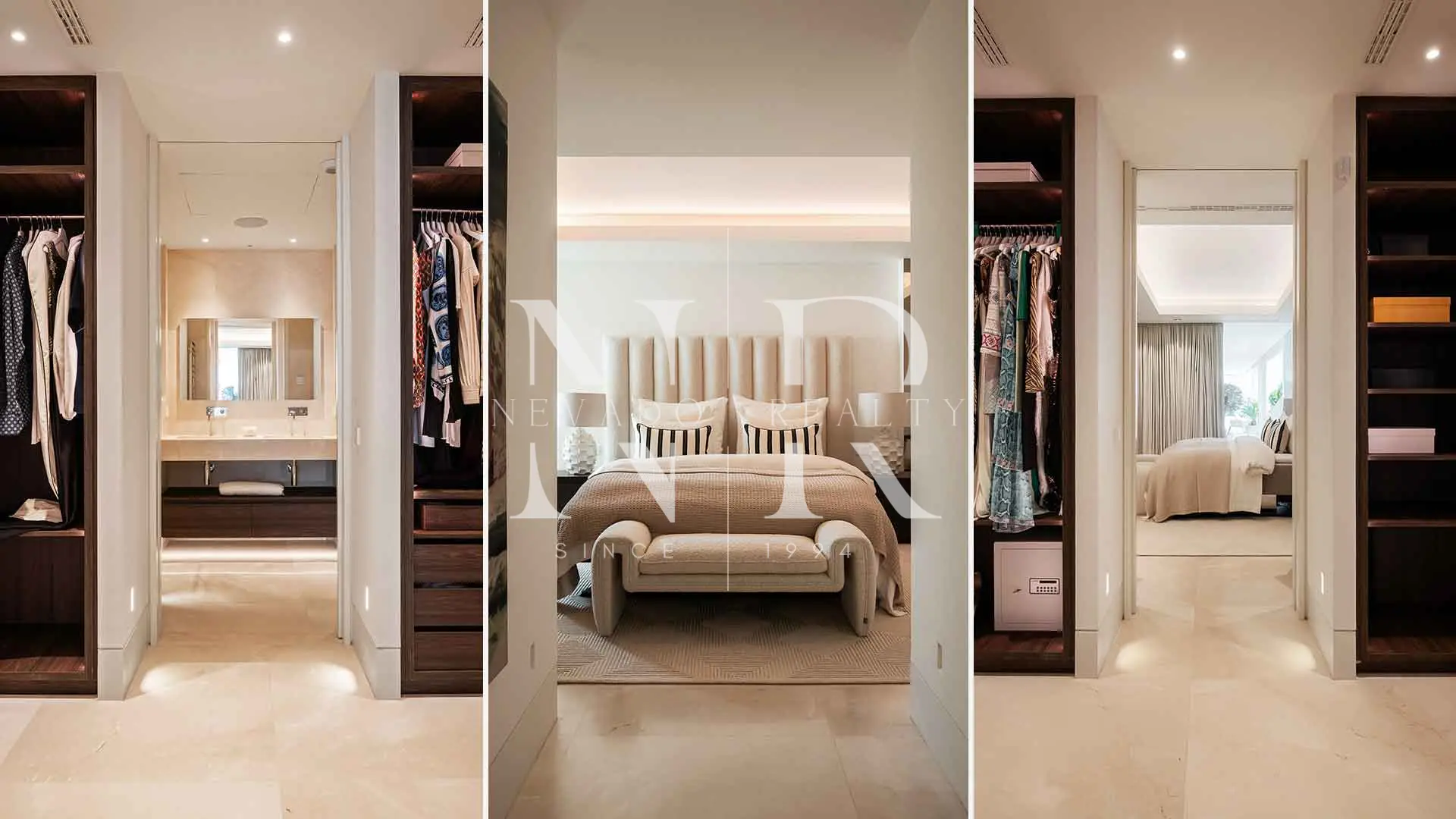Distribución pensada para la vida diaria: un hall central separa la zona social (salón-comedor integrado con la cocina premium y ventanas automatizadas que se abren por completo) de la zona privada con suite principal (vestidor y baño completo) y dos dormitorios en suite con vistas a la comunidad.