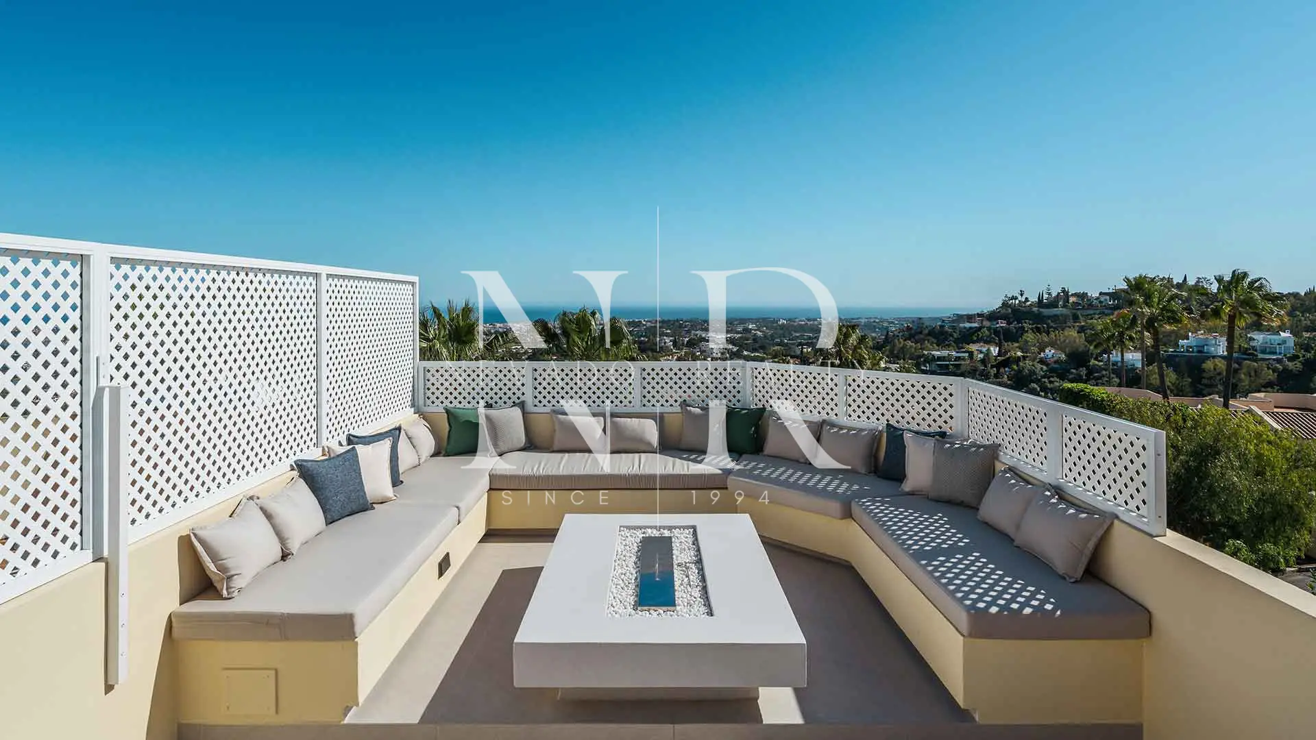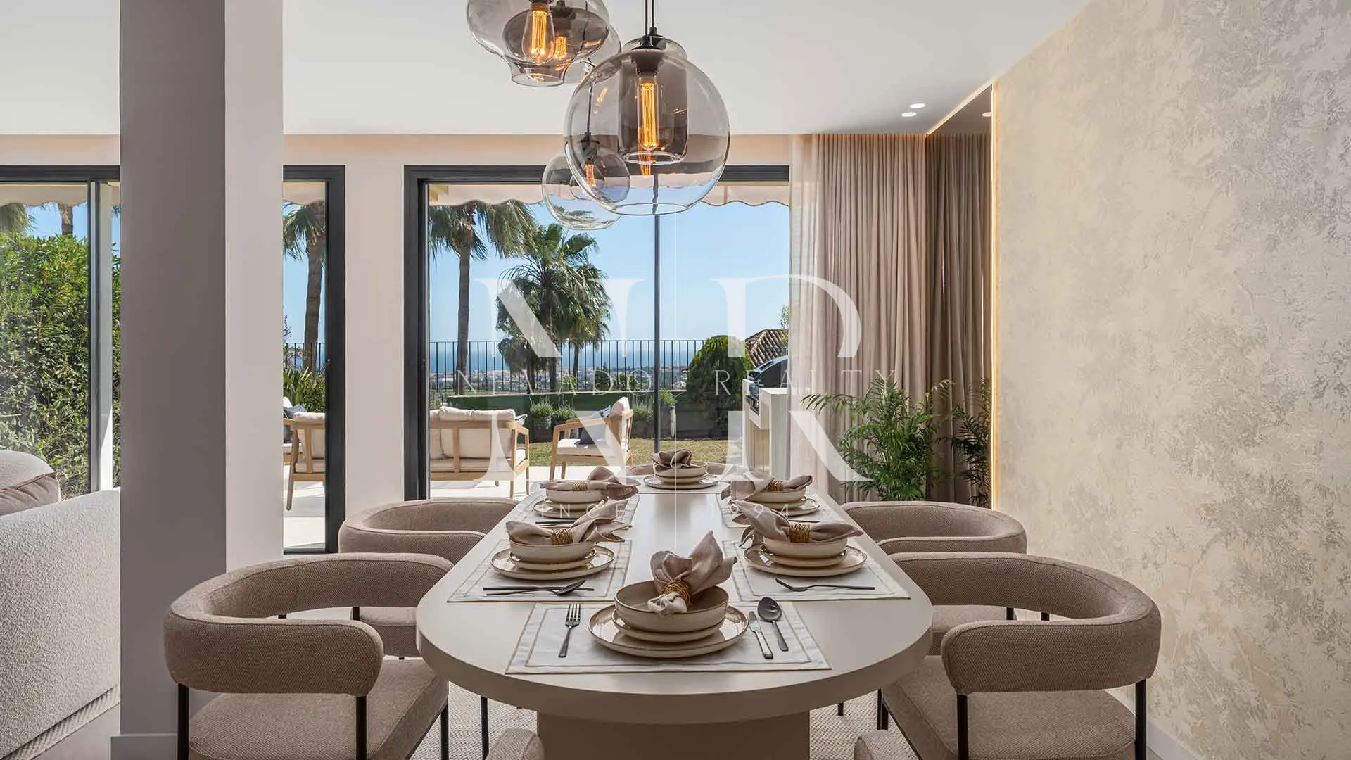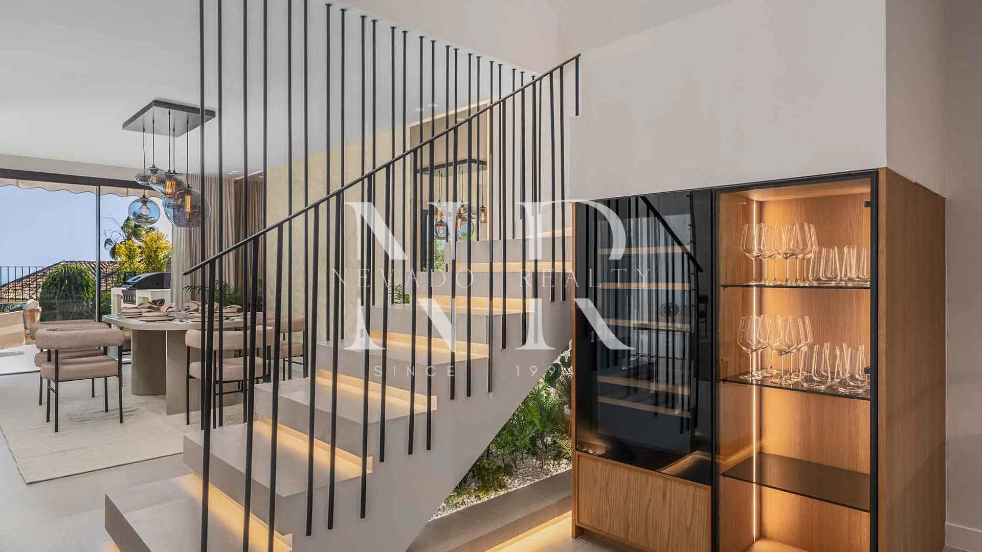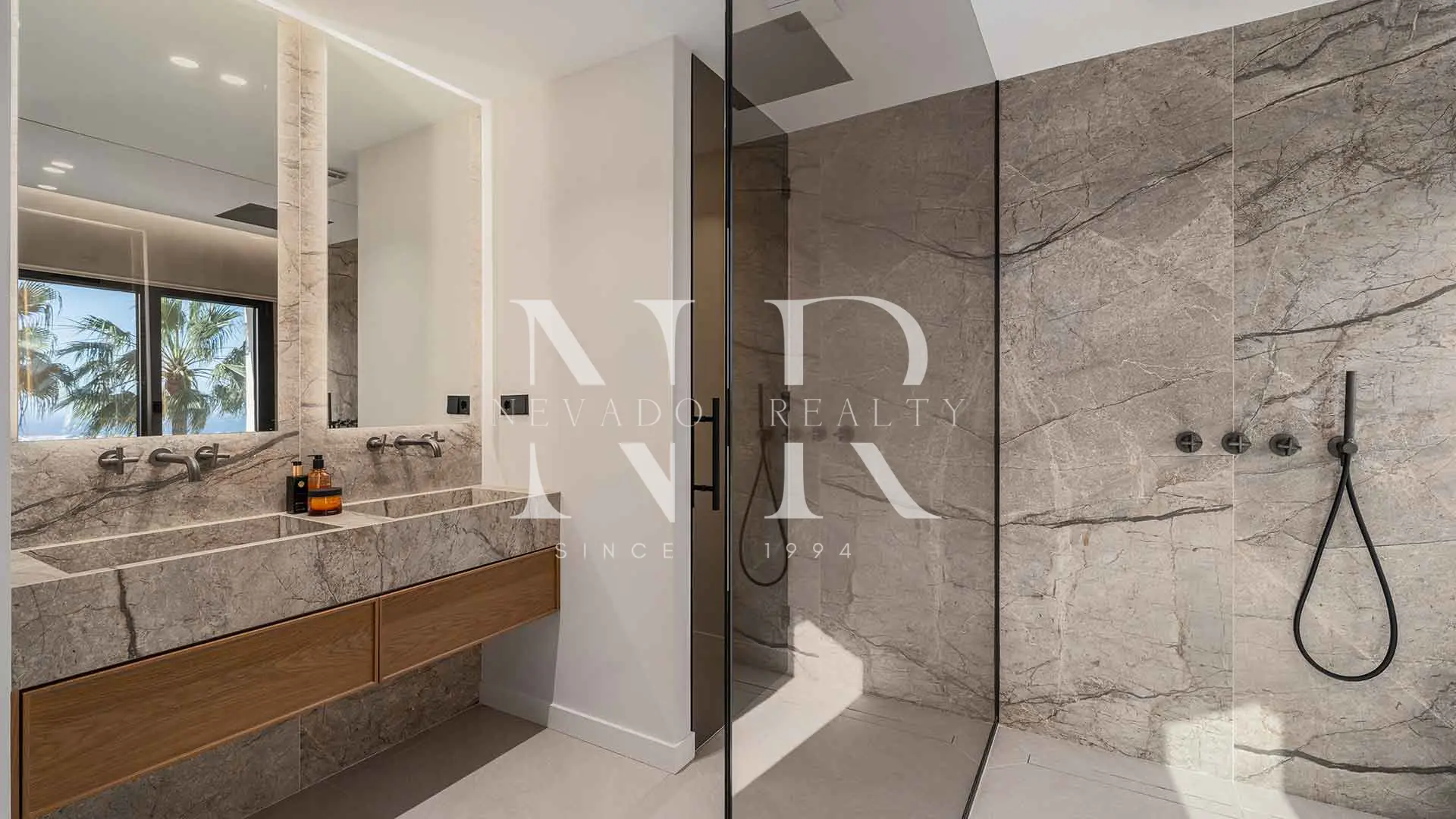 En la primera planta, el dormitorio principal ofrece vistas al mar, vestidor y baño en suite. Dos dormitorios adicionales pueden utilizarse como espacios para invitados o zonas de trabajo. El segundo baño incluye lavadora y secadora, inteligentemente ocultas para mantener la estética limpia. Sin embargo, el verdadero protagonista es el solárium con salón al aire libre, chimenea exterior, ducha, zona de bar y tumbonas, todo ello acompañado de vistas panorámicas al Mediterráneo y a la montaña de La Concha, ideal para disfrutar de atardeceres inolvidables.