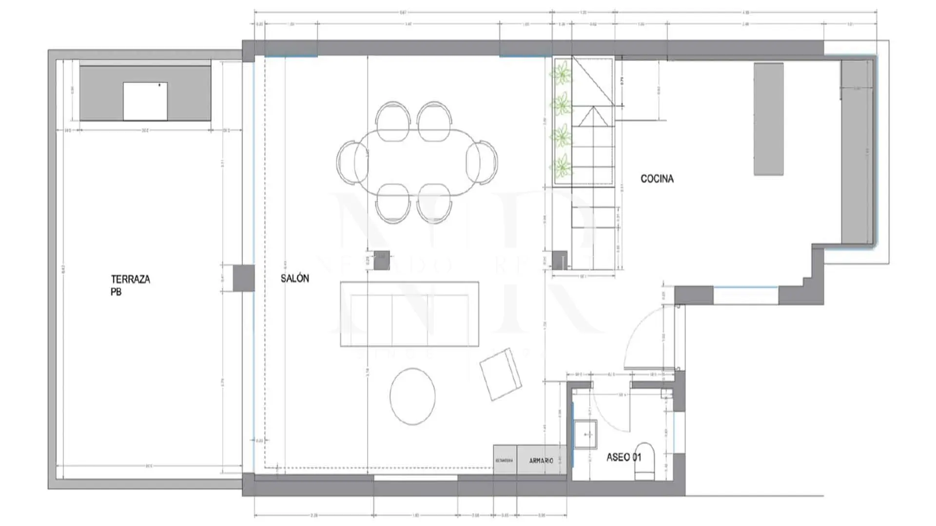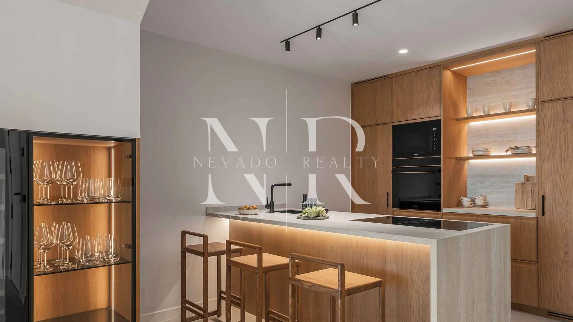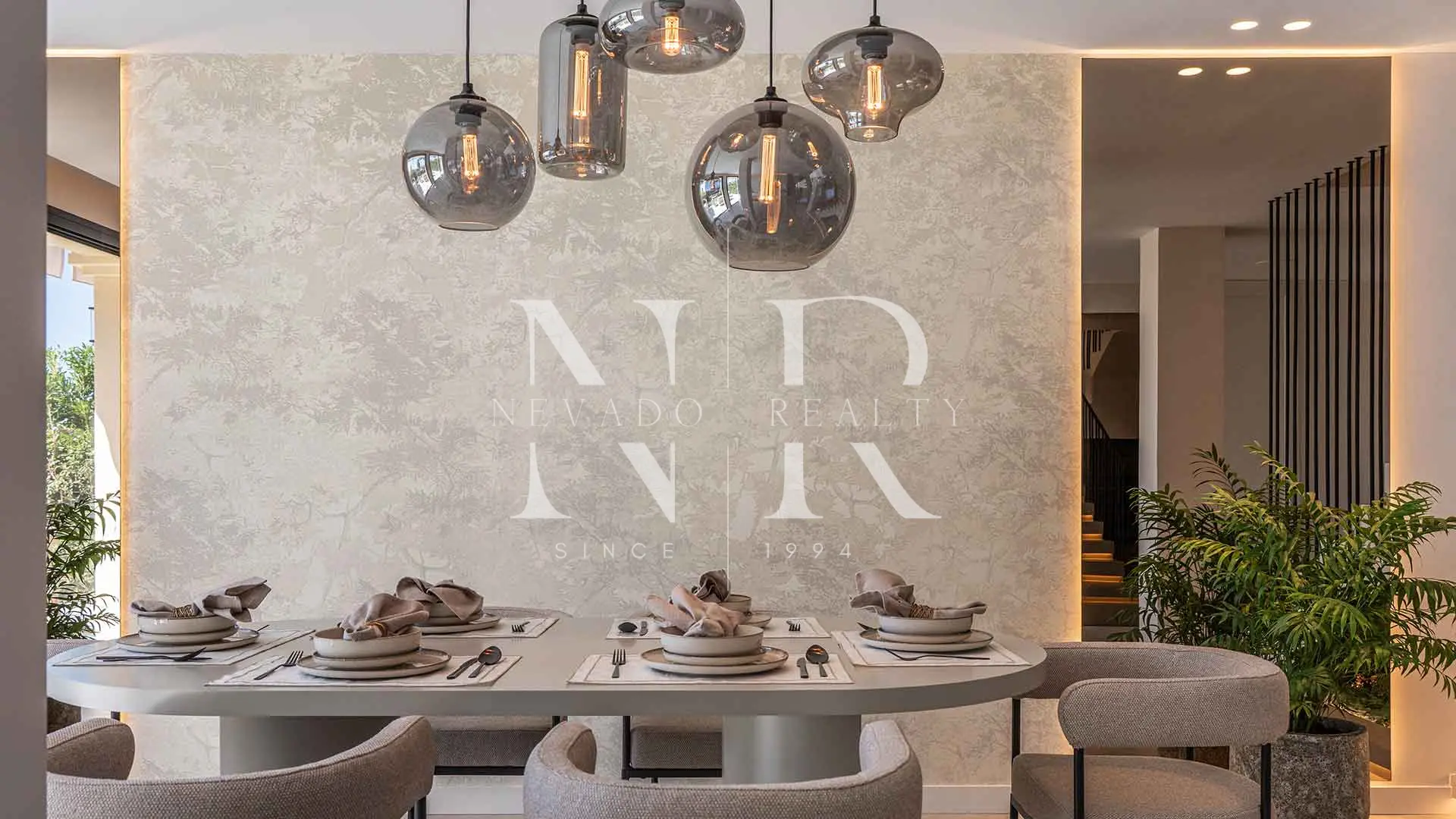 La planta baja ofrece una distribución abierta donde conviven el salón, comedor y cocina en un mismo ambiente elegante y acogedor. La cocina, diseñada por un estudio danés, está equipada con electrodomésticos Smeg, vinoteca integrada y una isla funcional que también hace de vitrina expositora. El salón cuenta con una chimenea de bioetanol Pureline, que aporta calidez y estilo. Las puertas correderas de cristal se abren a una terraza privada con barbacoa integrada, perfecta para cenas al aire libre o desayunos bajo el sol andaluz.