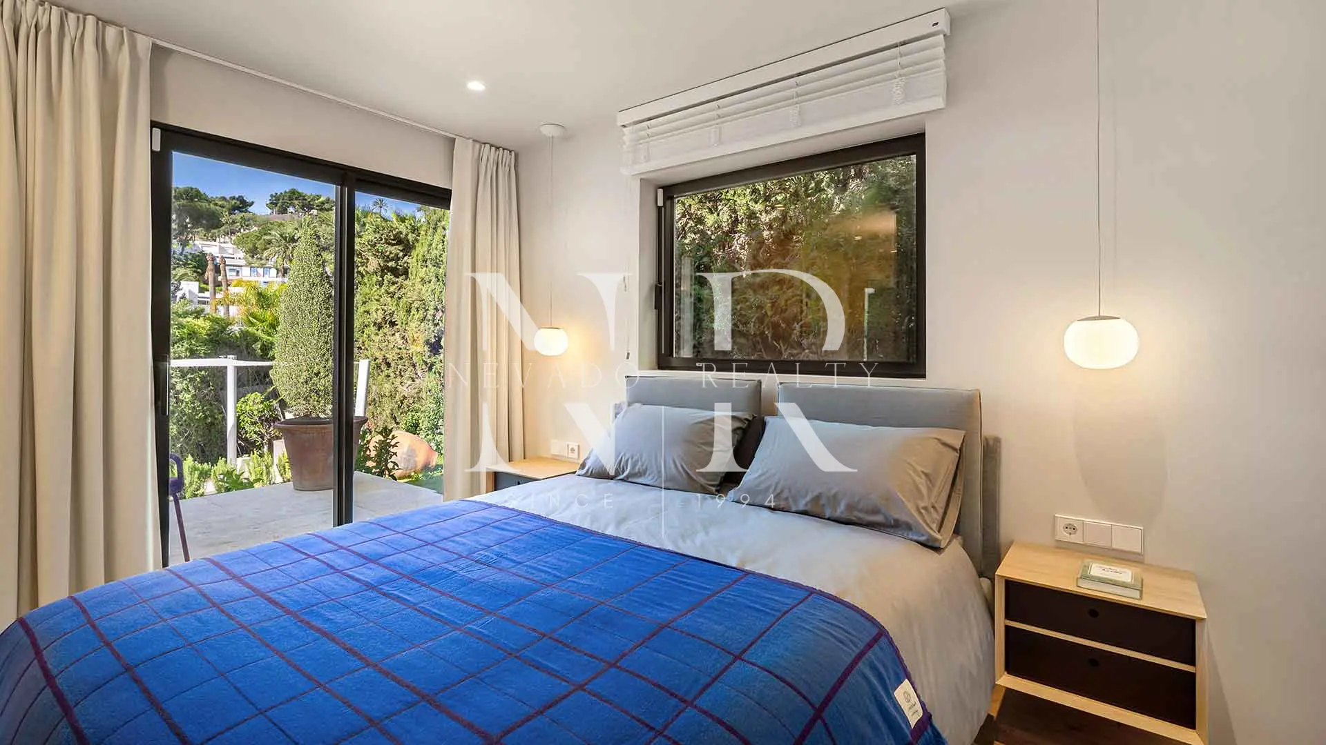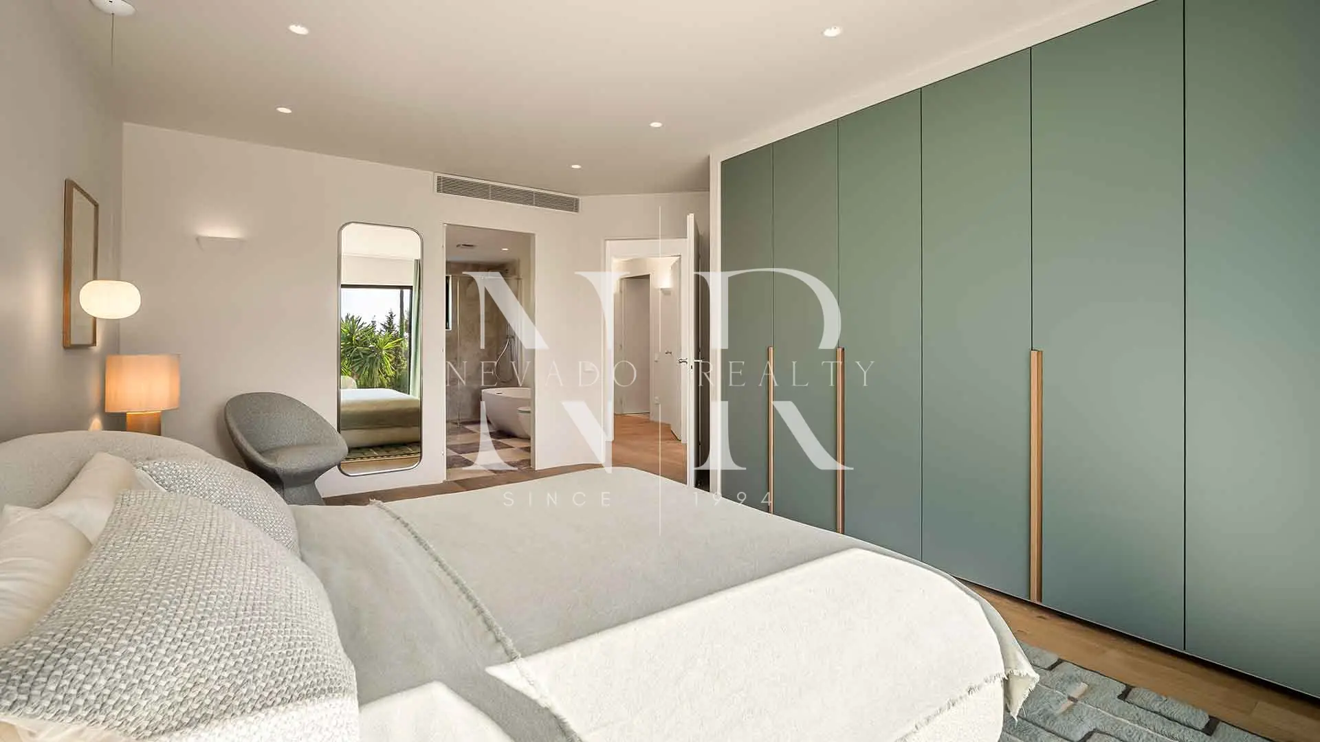 La casa cuenta con cuatro dormitorios en suite, tres baños completos adicionales y un aseo de invitados. La suite principal dispone de terraza privada con vistas a la montaña. El diseño interior ha priorizado la luz natural, el orden y la armonía visual, con armarios modulares italianos, acabados sostenibles y una cuidada iluminación técnica de firmas como Delta Light, Arkoslight o Artemide. La climatización, silenciosa y eficiente, incluye suelo radiante por agua en ambas plantas, bomba de calor aire-agua y aire acondicionado Fujitsu High Line.