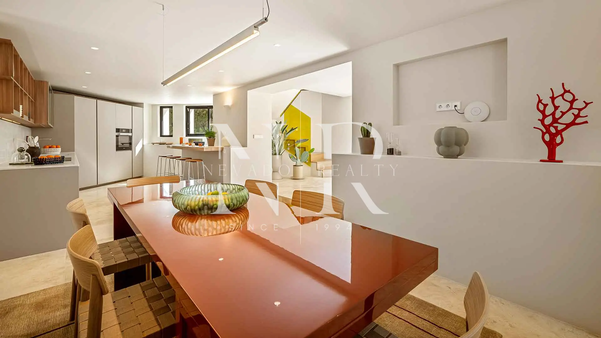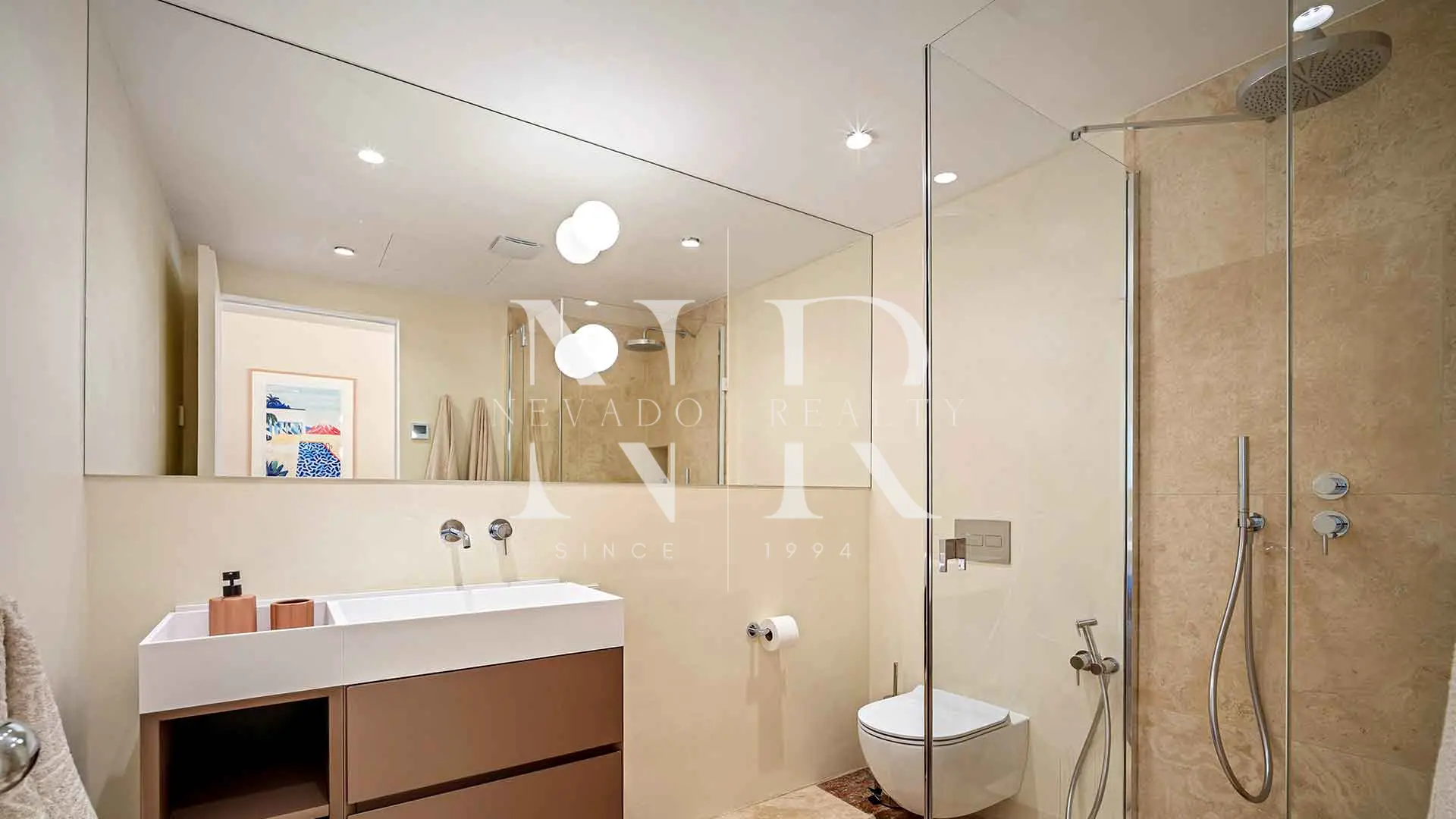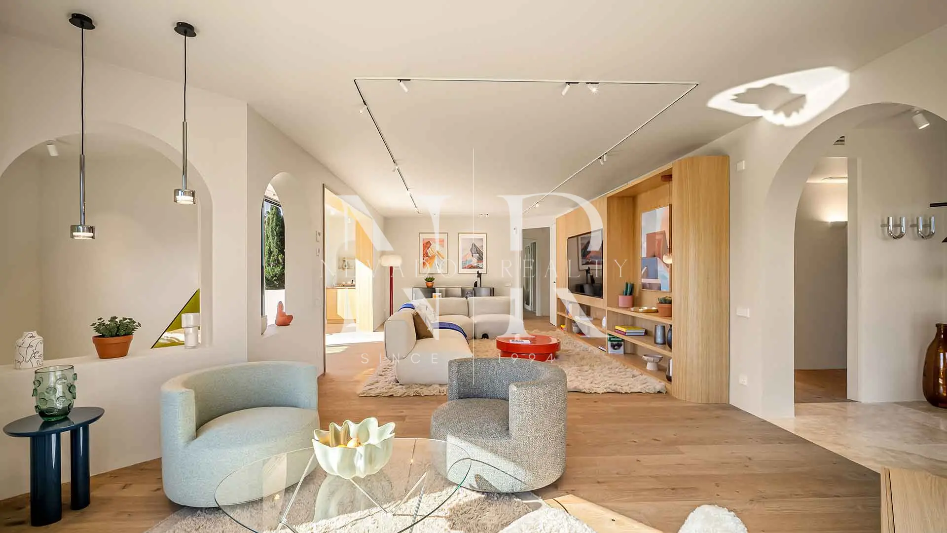 Esta vivienda ha sido diseñada para ofrecer equilibrio entre confort, estilo y funcionalidad. Los materiales cuidadosamente seleccionados, como el travertino en tonos crema y rojo, el parquet con certificación ecológica o la carpintería en madera ámbar, aportan calidez, elegancia y coherencia estética en cada estancia. El núcleo de la vivienda es una cocina de diseño italiano Ernesto Meda equipada con electrodomésticos Miele y grifería Fantini, que conecta de manera fluida con el comedor, el salón y la terraza exterior, todo ello enmarcado por puertas correderas que se integran perfectamente en la arquitectura.