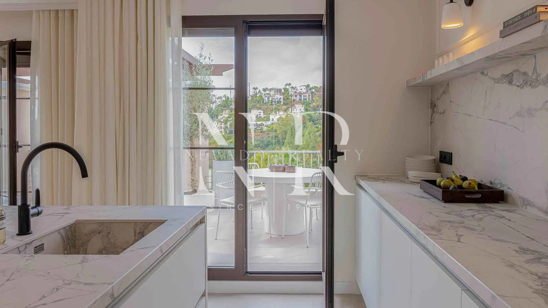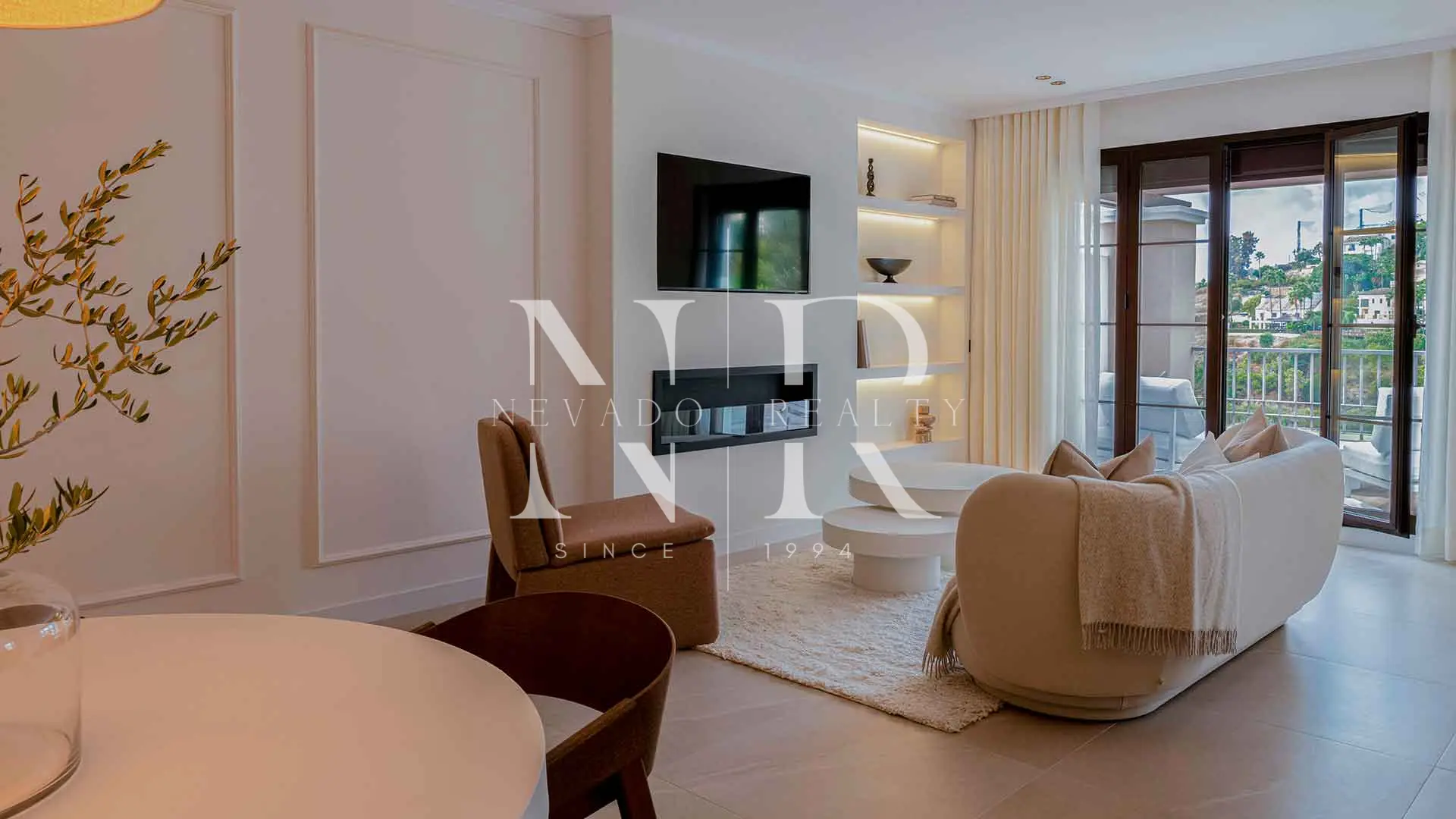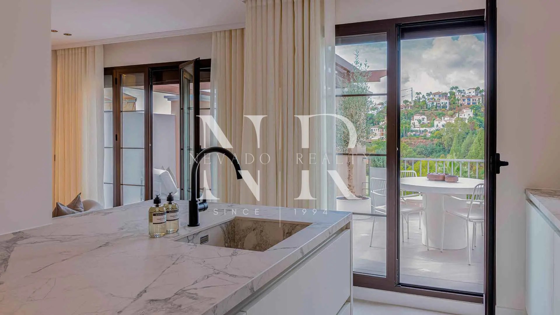 Las amplias puertas correderas permiten la entrada de abundante luz natural y ofrecen impresionantes vistas panorámicas al campo de golf y a las montañas circundantes. Esta perfecta conexión entre el interior y el exterior ofrece una experiencia de vida tranquila y contemporánea.
