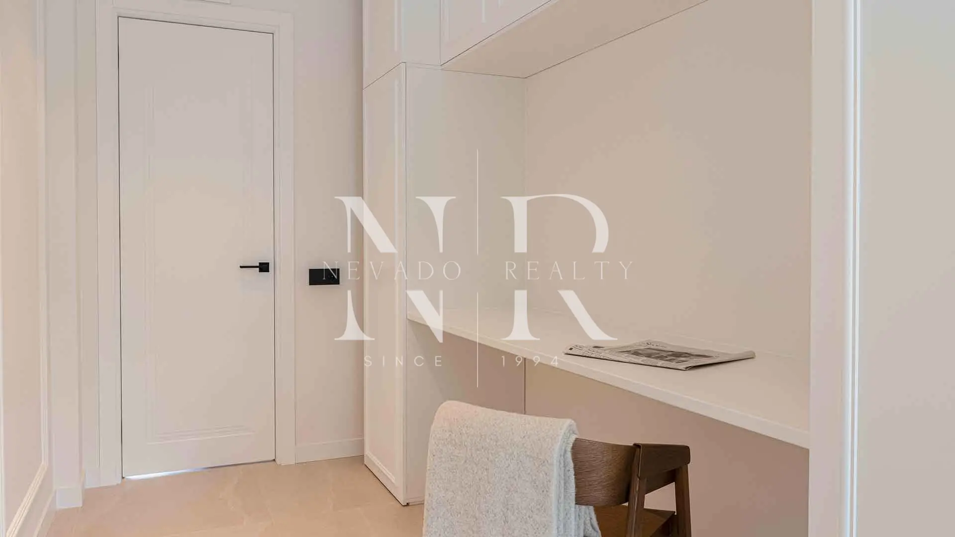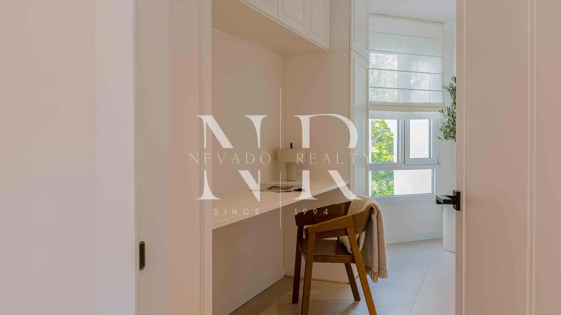 Originalmente contaba con tres dormitorios, pero ahora incluye un despacho cuidadosamente diseñado, ideal para teletrabajadores o quienes valoran un espacio dedicado a la productividad. Los dos dormitorios restantes son amplios y tranquilos, y se complementan con dos elegantes baños con acabados modernos.
