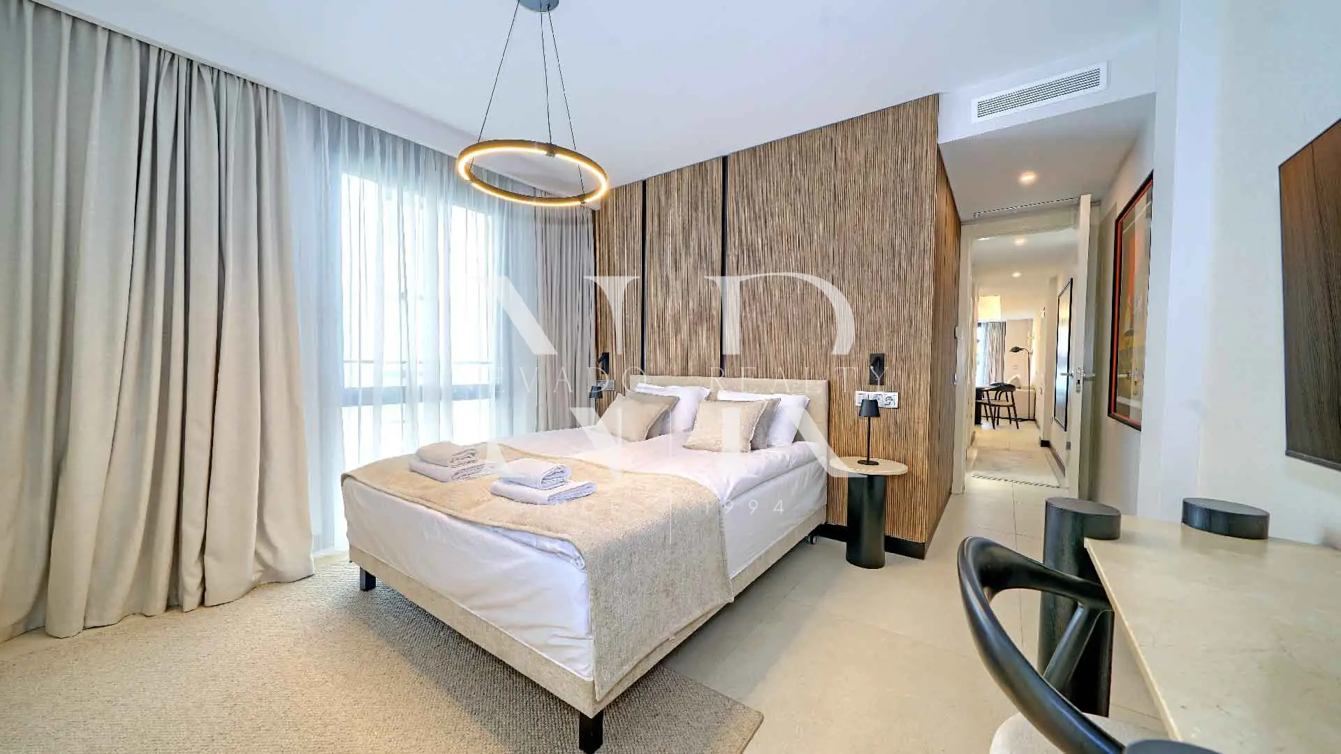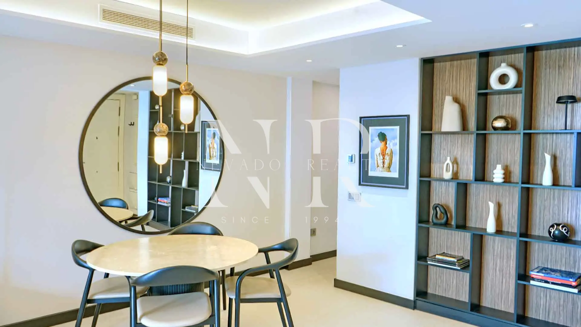El salón y la cocina de concepto abierto crean un espacio amplio y luminoso. La cocina se encuentra totalmente equipada con electrodomésticos de última generación y acabados contemporáneos. Dispone de dos amplias habitaciones, donde el dormitorio principal cuenta con un baño en suite, ofreciendo privacidad y confort. El segundo dormitorio es igualmente espacioso y se complementa con un baño adicional. Ambos baños están diseñados con materiales de alta calidad y un estilo moderno.
