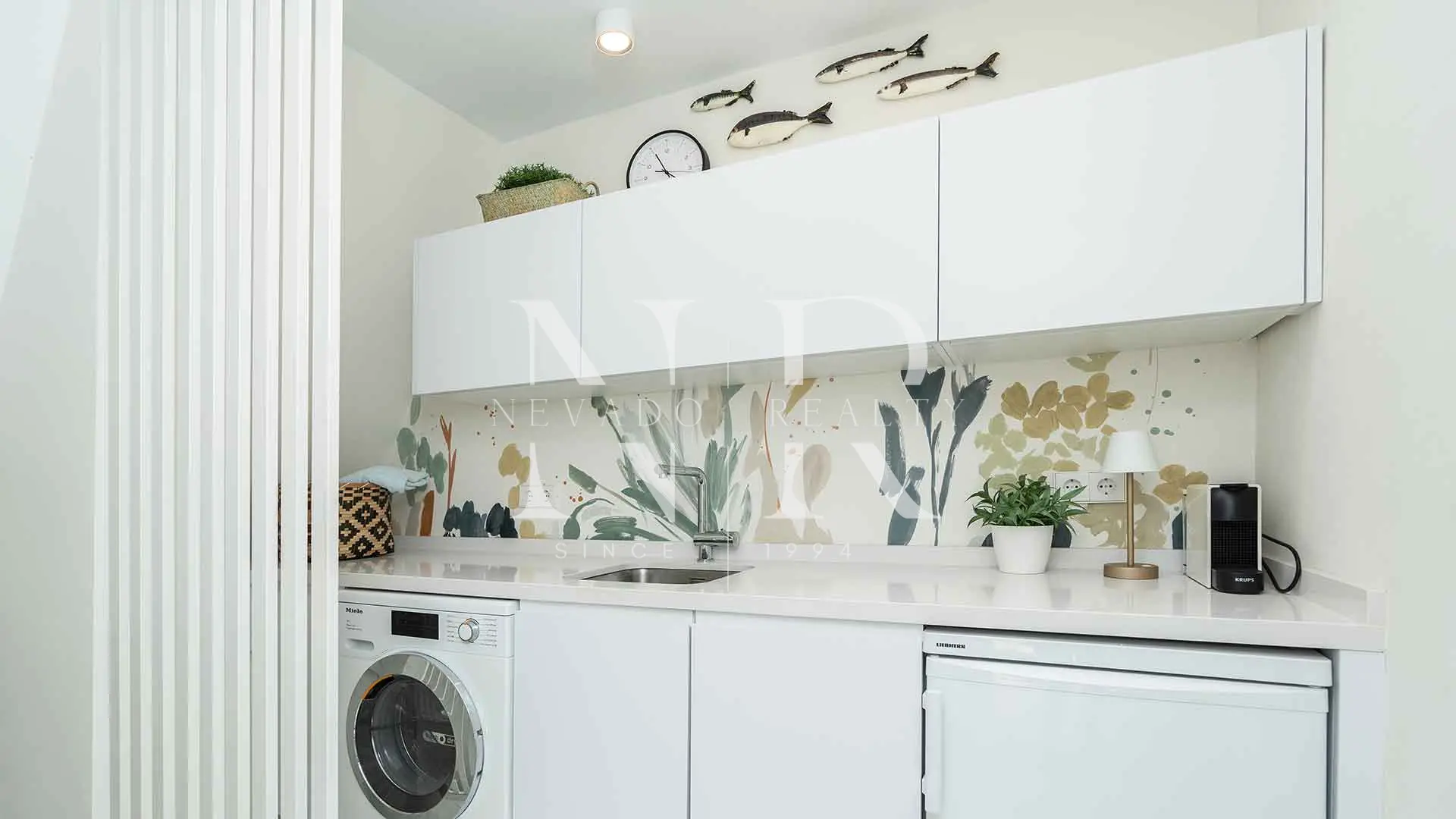 En la planta principal, el salón diáfano con una decoración fresca y elegante con chimenea moderna, persianas automáticas, iluminación directa y perimetral, altavoces y domótica, se abre a una coqueta terraza descubierta con varios toldos eléctricos con vistas exquisitas: al mar y a la preciosa avenida llena de jacarandas , ideal para relajarse o recibir visitas al aire libre. La cocina moderna y de calidad, semiabierta al salón, totalmente equipada y con persianas eléctricas ofreciendo funcionalidad y elegancia.