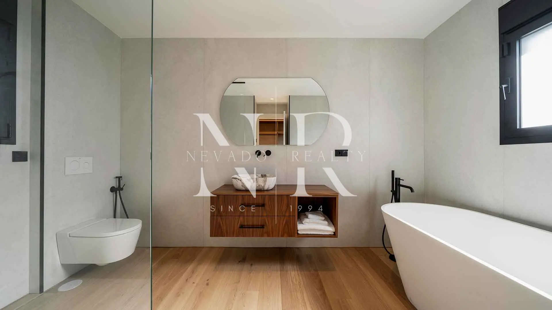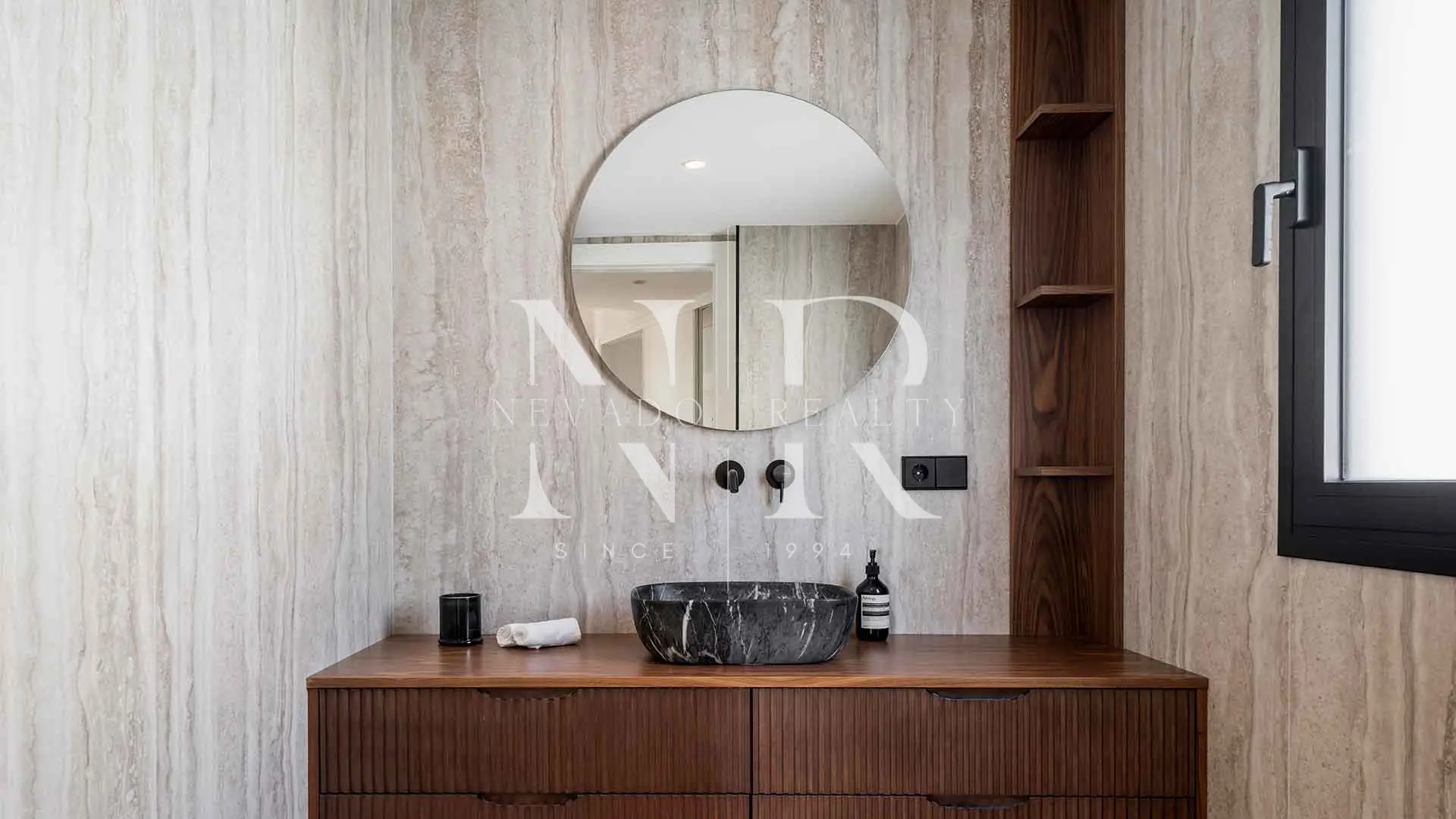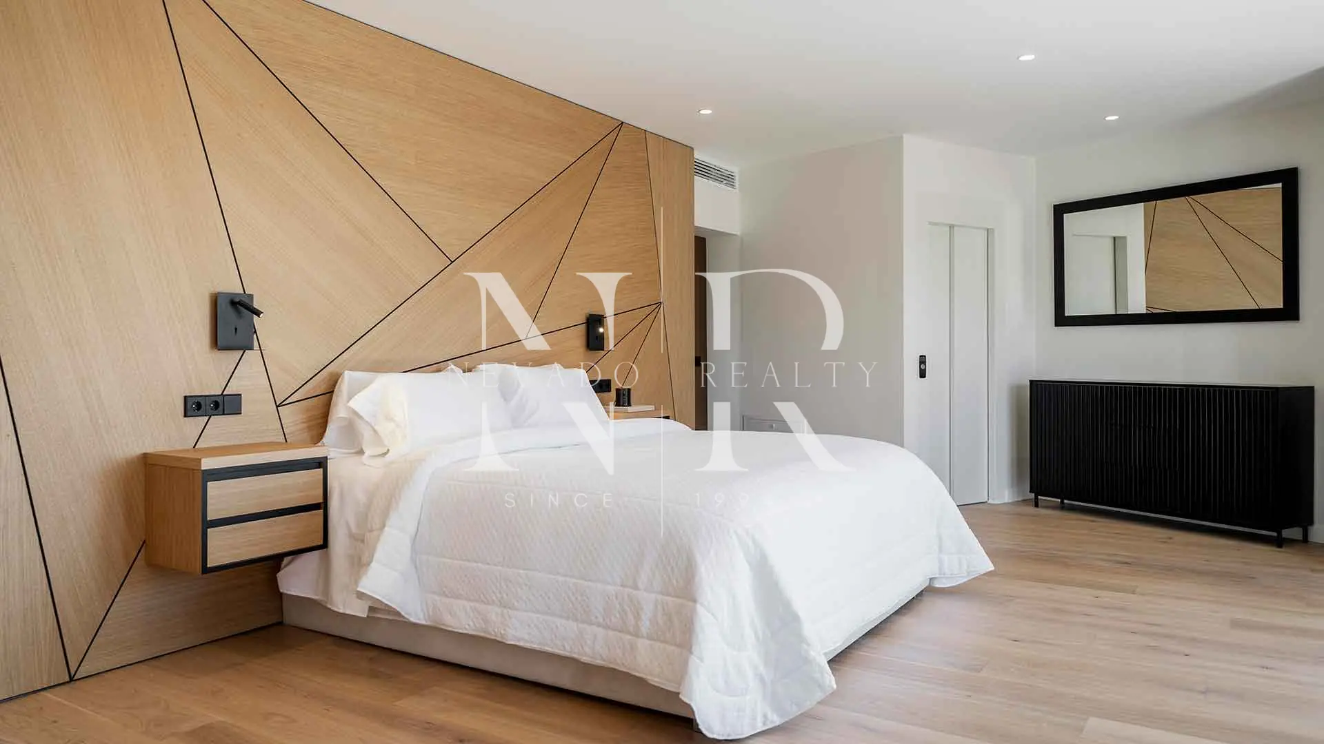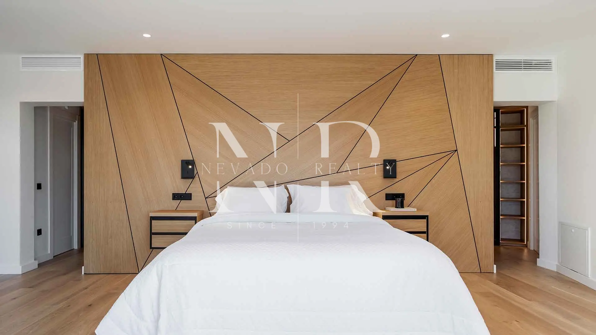 La planta superior está completamente dedicada al dormitorio principal: una espectacular suite con dos baños independientes, vestidor de diseño con puertas de cristal y una terraza privada con barandilla de cristal para disfrutar al máximo de las vistas abiertas al Mediterráneo desde la cama o el salón privado.