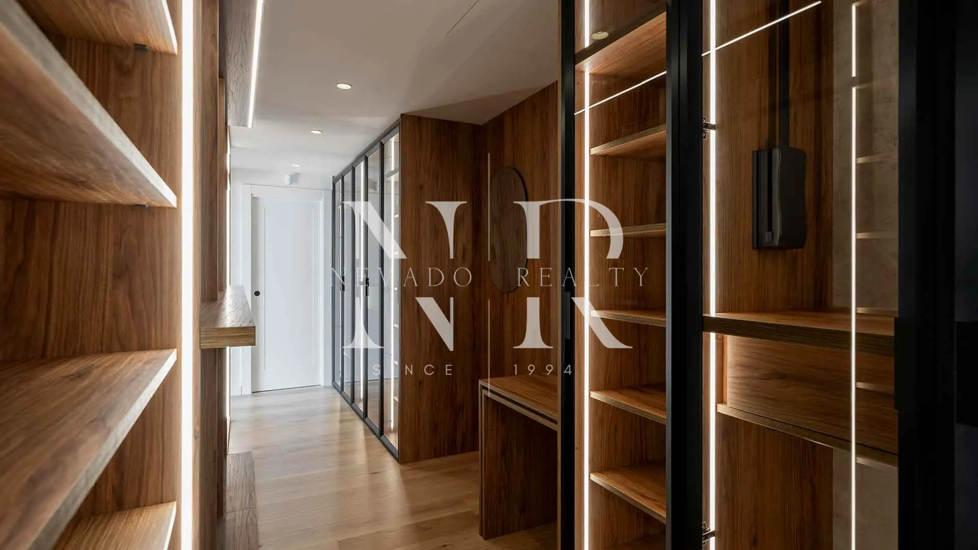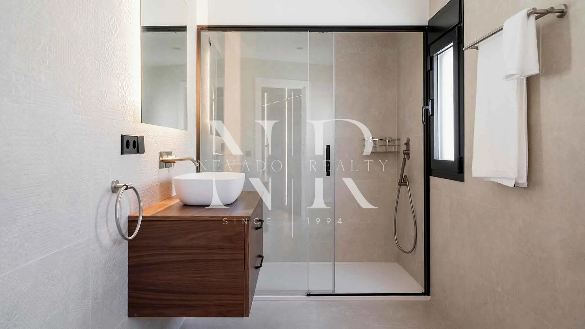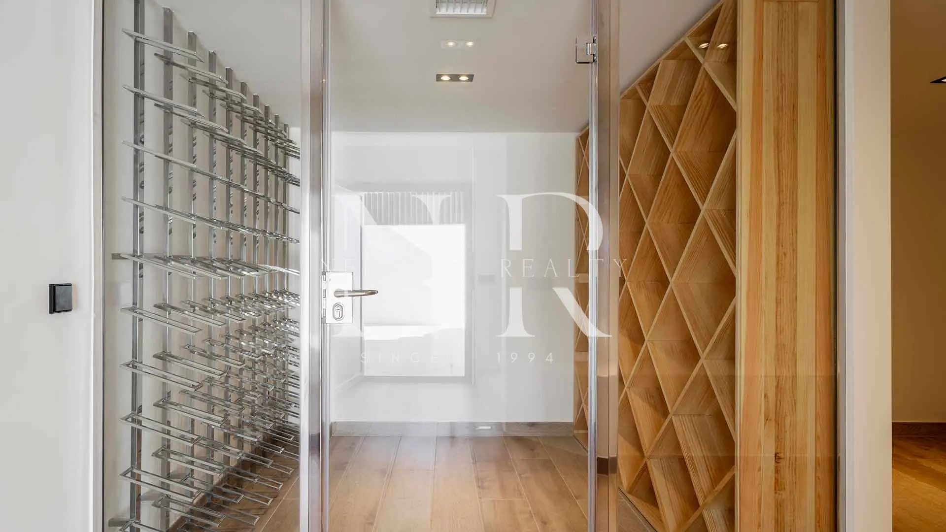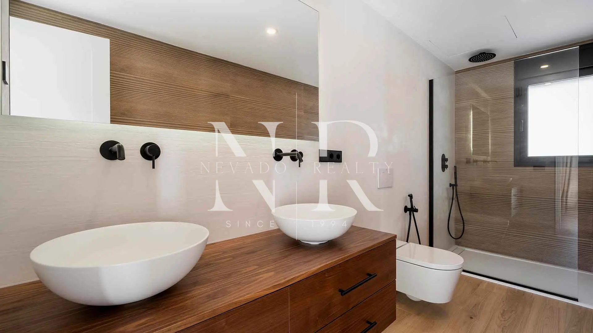 La planta superior está completamente dedicada al dormitorio principal: una espectacular suite con dos baños independientes, vestidor de diseño con puertas de cristal y una terraza privada con barandilla de cristal para disfrutar al máximo de las vistas abiertas al Mediterráneo desde la cama o el salón privado.