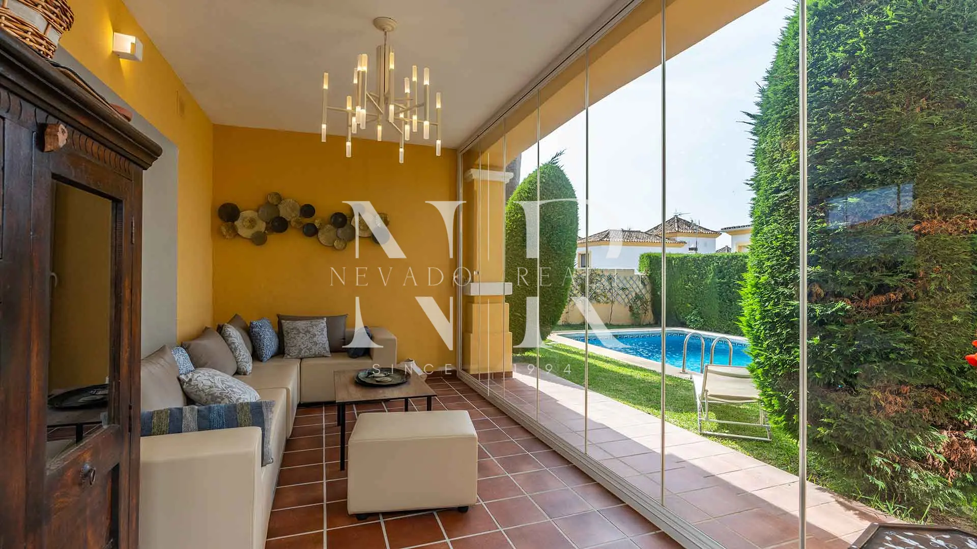 L’un des atouts de la maison est sa terrasse partiellement fermée équipée d’un système Lumón, permettant d’en profiter toute l’année, même pendant les mois les plus frais, sans sacrifier la lumière naturelle et la vue sur le jardin et la piscine.