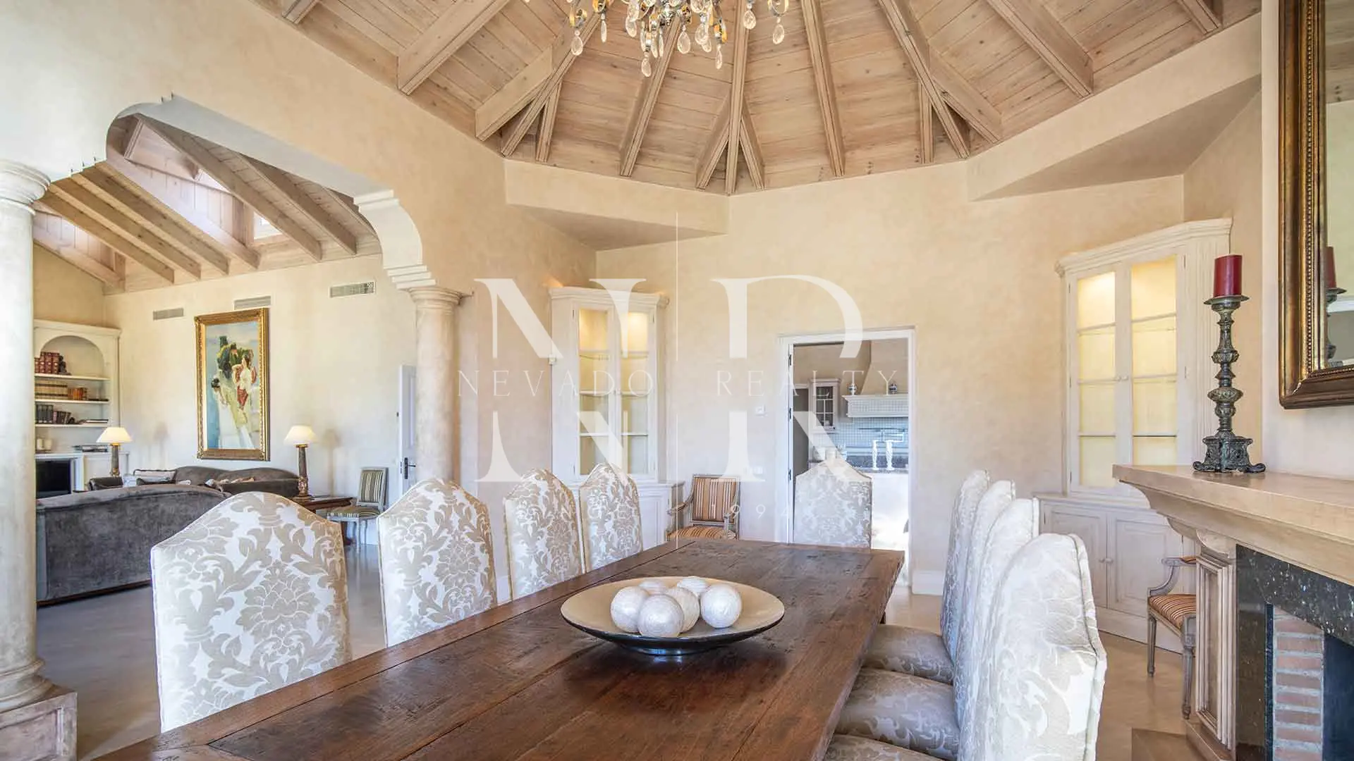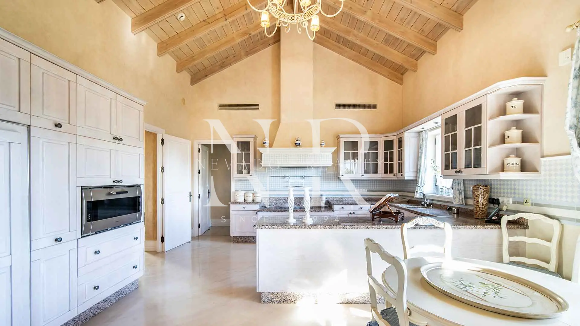 Un chemin privé mène à la majestueuse entrée au design andalou classique. Les hauts plafonds avec poutres apparentes renforcent la sensation d’espace et d’élégance, tandis que la connexion entre le salon, la salle à manger et la cuisine crée une atmosphère chaleureuse et fonctionnelle. La cuisine familiale, spacieuse et équipée, est l’endroit idéal pour la vie quotidienne et pour recevoir des invités dans le confort.