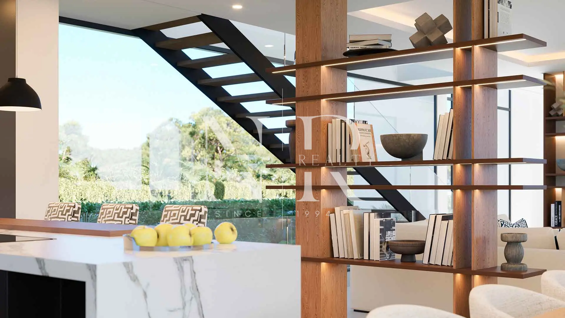 La villa comprend cinq chambres, chacune avec sa propre salle de bains, judicieusement réparties entre le sous-sol, le rez-de-chaussée et le premier étage. Le rez-de-chaussée se compose d’un hall d’entrée lumineux, de toilettes invités, d’une chambre supplémentaire, d’un vaste séjour-salle à manger et d’une cuisine américaine entièrement équipée avec des appareils haut de gamme. Le premier étage abrite trois autres chambres offrant une vue spectaculaire sur la mer et le paysage naturel environnant. Le dernier niveau de la maison dispose d’un solarium privé avec jacuzzi et cuisine d’été, idéal pour profiter du climat méditerranéen et des couchers de soleil. Le sous-sol comprend une chambre, une pièce polyvalente, une buanderie et un garage.