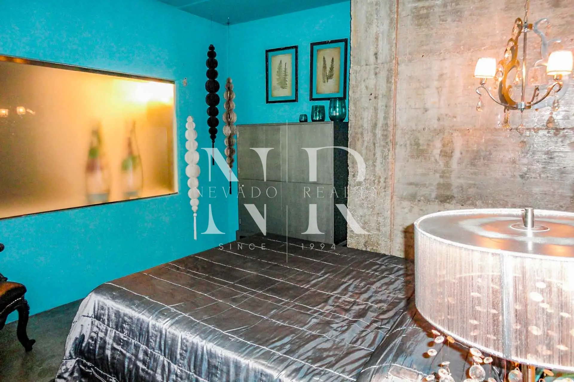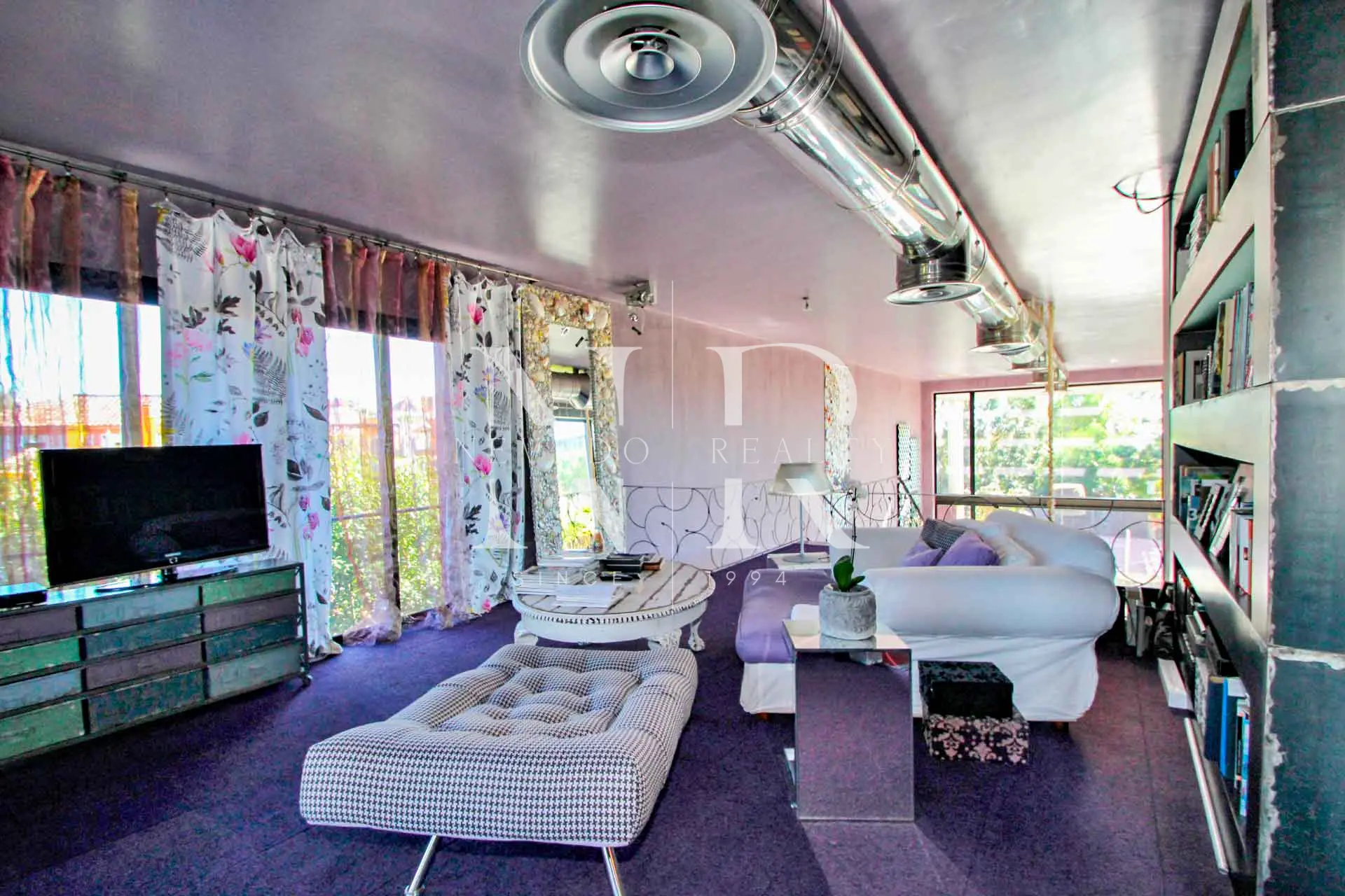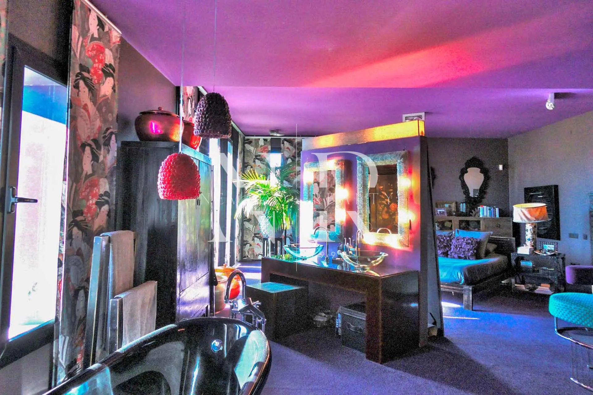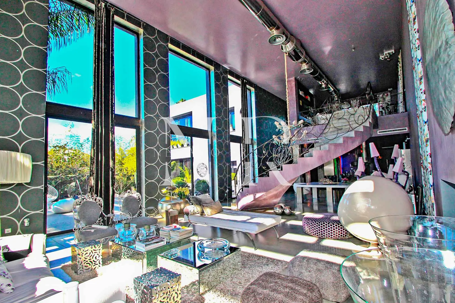 Depuis le salon, un impressionnant escalier en colimaçon mène au premier étage, où se trouvent un bureau confortable et la chambre principale avec une vue magnifique sur la terrasse et le beau jardin.