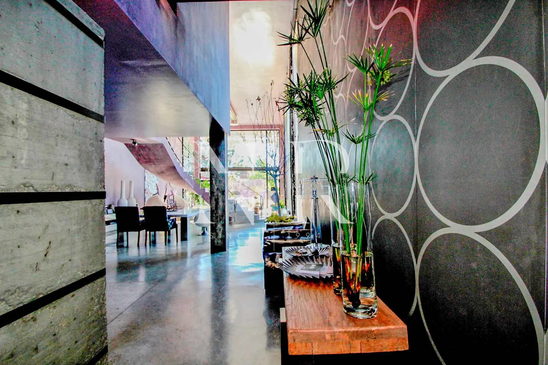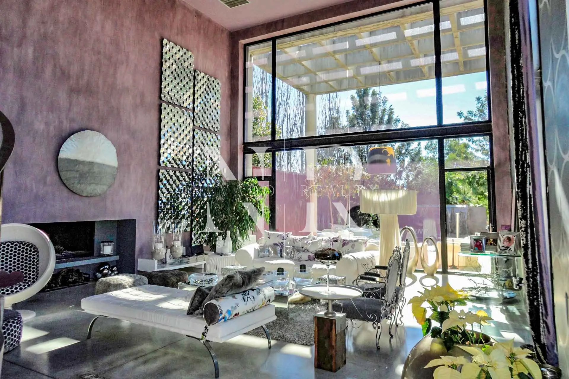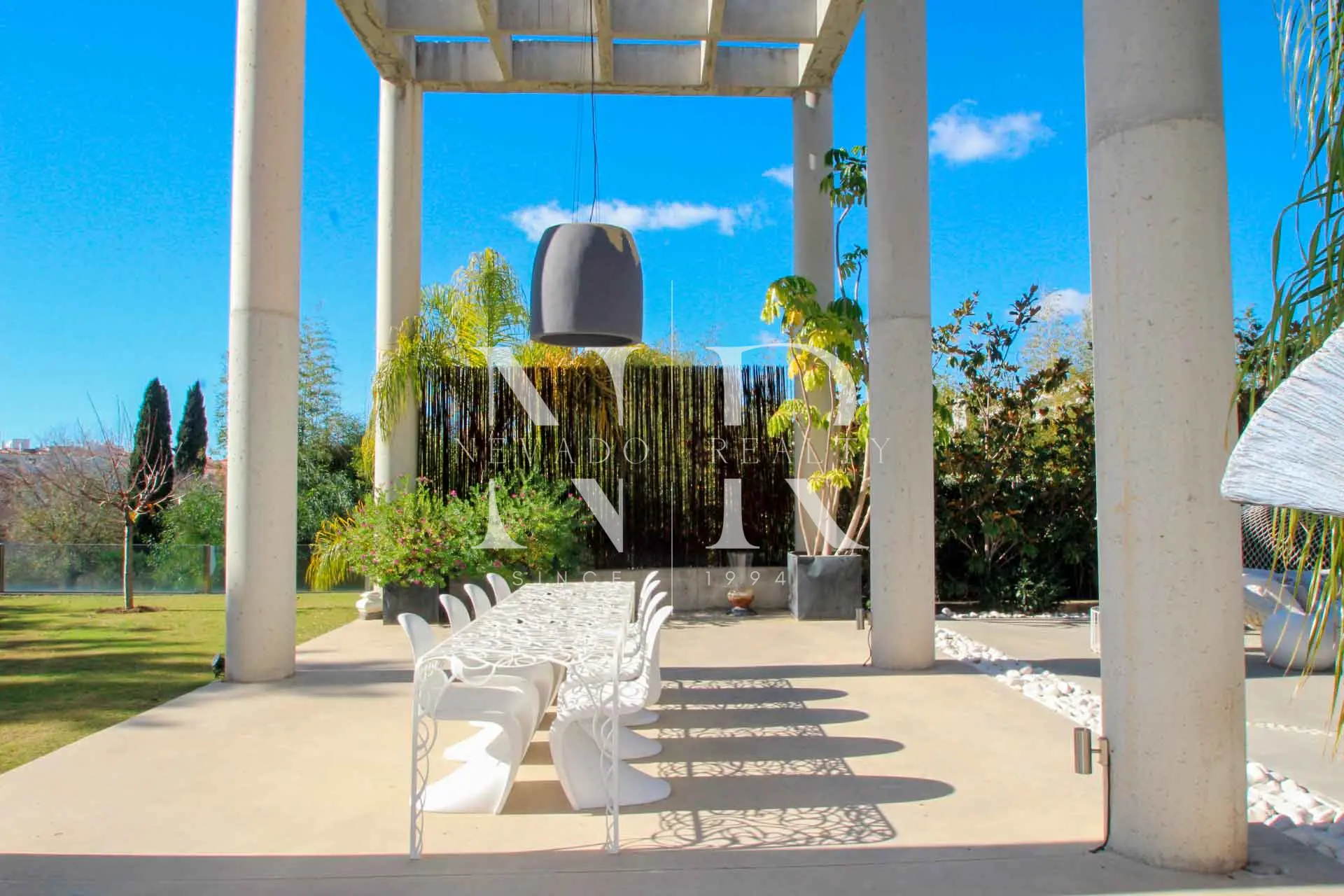 Sa façade avant-gardiste donne de la personnalité à une conception architecturale où les lignes courbes et les angles droits sont intégrés avec une grande élégance et légèreté. Le matériau prédominant est le béton dans ses multiples textures. À l’extérieur, il confère de la solidité à la structure, tandis qu’à l’intérieur, il apporte de la chaleur en combinaison avec les élégantes fenêtres intégrées aux murs principaux. Son orientation sud garantit la luminosité pendant la journée tout en offrant une vue panoramique privilégiée sur le beau jardin qui entoure la maison.
