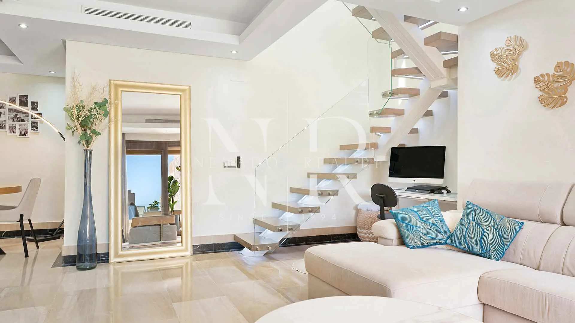 Penthouse dans l’Urbanisation Bahia de la Plata avec vue sur la mer à vendre. Située dans un développement de plage de première ligne à Estepona, cette propriété étonnante combine l’élégance classique avec une rénovation contemporaine haut de gamme effectuée en 2024. La propriété, construite à l’origine en 2012, a été transformée en une maison sophistiquée offrant confort, lumière naturelle et une connexion directe avec l’environnement maritime.