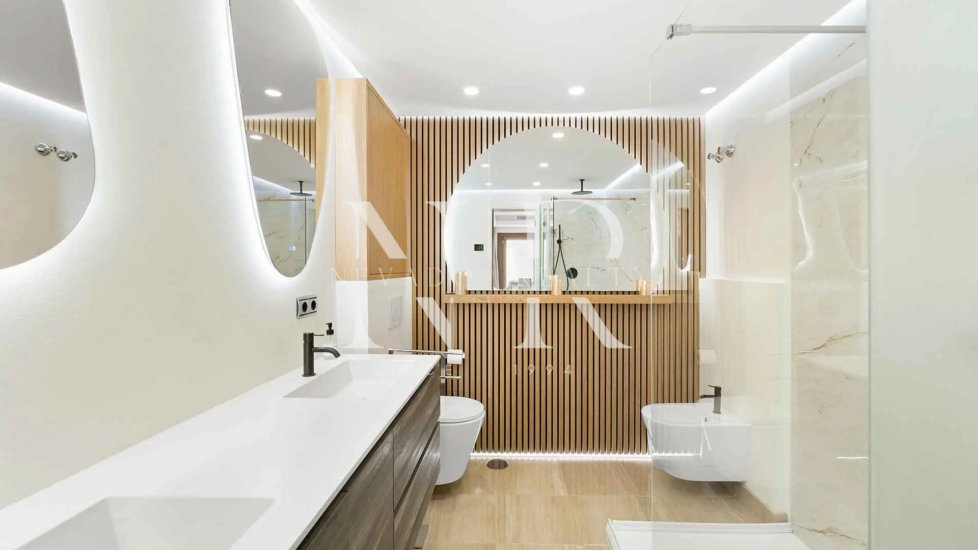 Le rez-de-chaussée comprend une cuisine design moderne et séparée, équipée d’appareils Siemens, qui se connecte élégamment au salon et à la salle à manger, créant ainsi un espace ouvert parfait pour se détendre ou recevoir des invités. La chambre principale dispose d’un accès direct à la terrasse principale, ce qui vous permet de vous réveiller chaque matin avec une vue sur la mer. Deux autres chambres et une salle de bains complète offrent un espace polyvalent, idéal pour la famille ou les invités, tout en conservant un agencement confortable et fonctionnel.