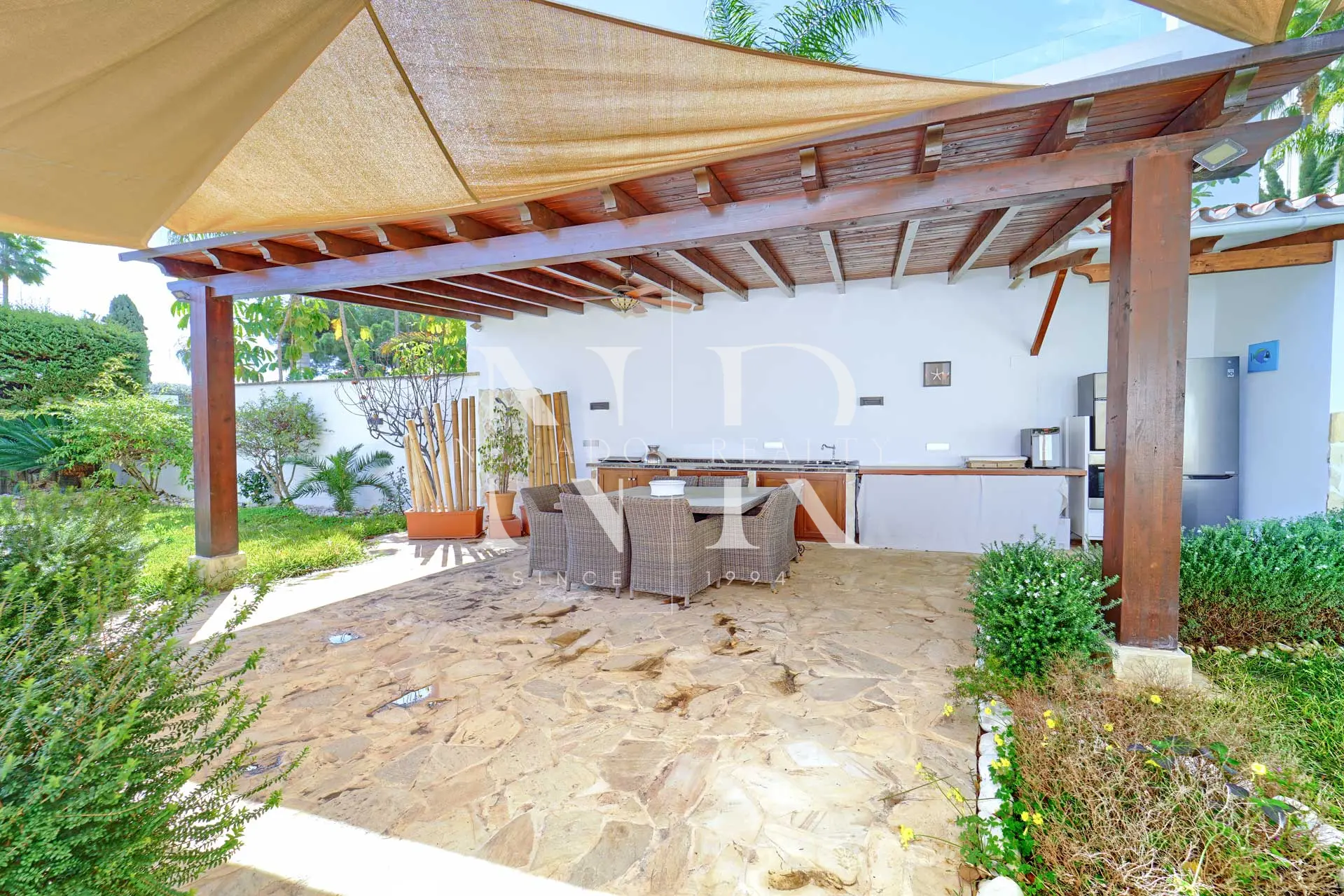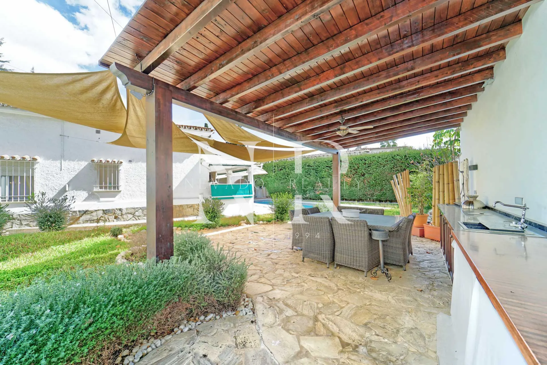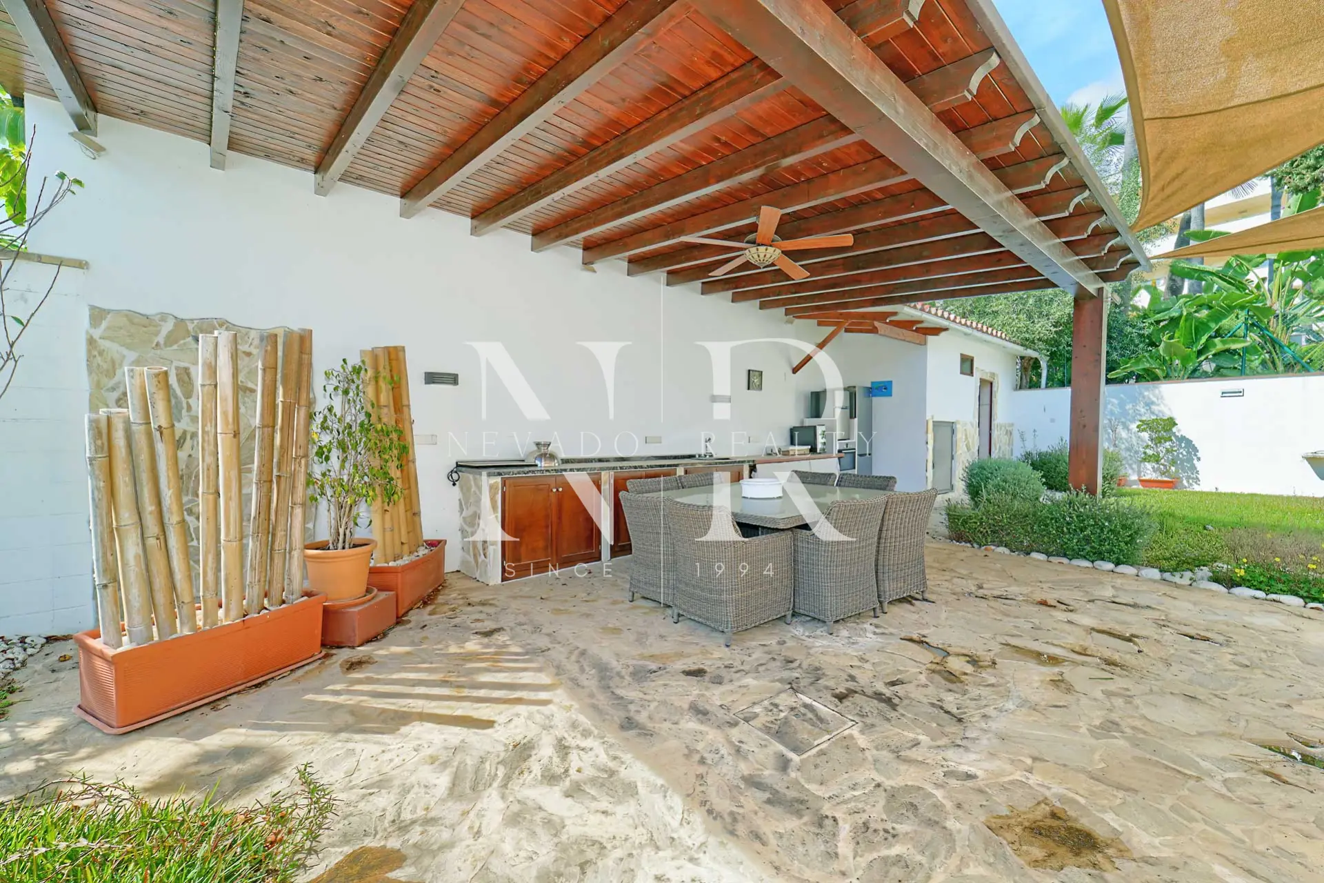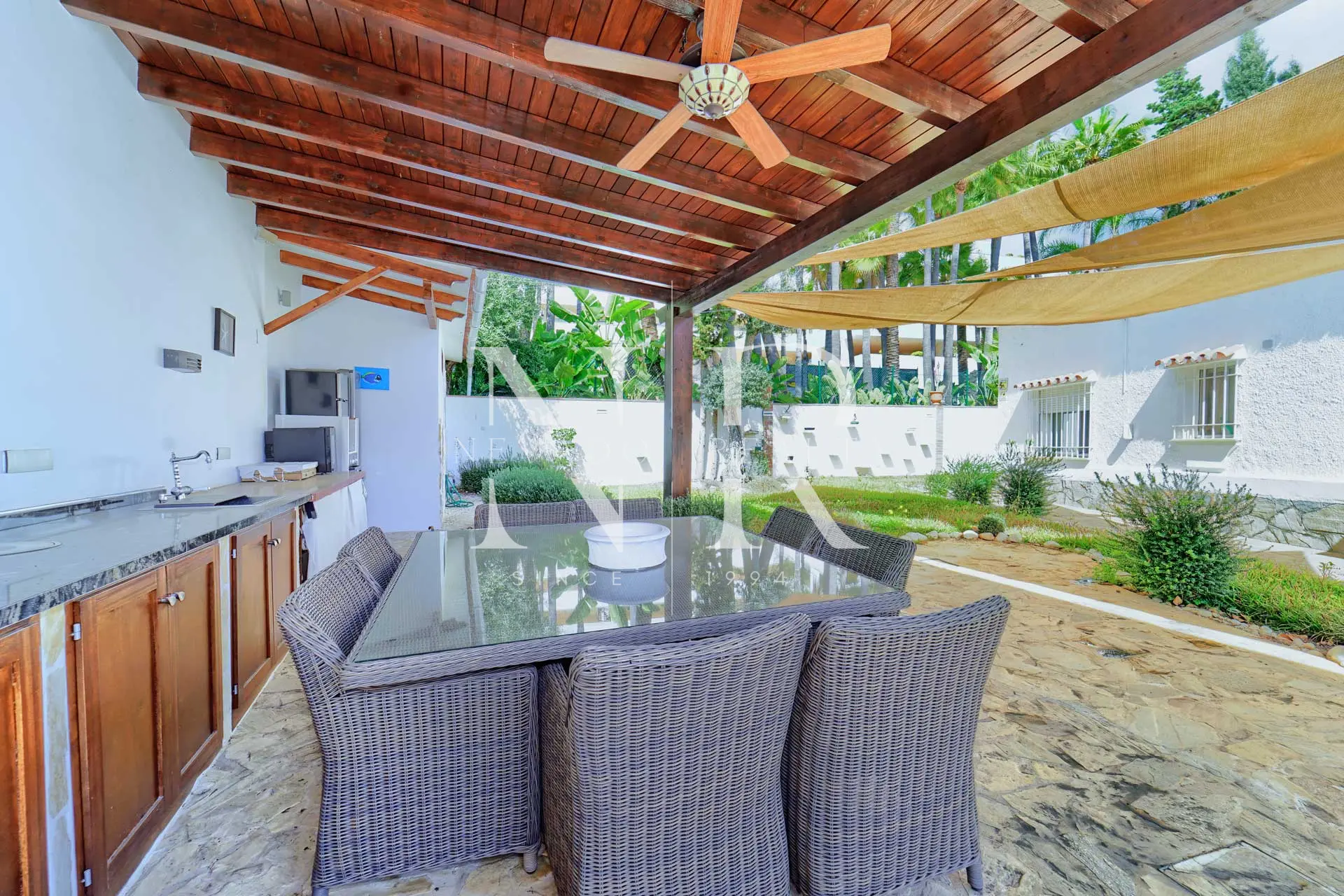 La zone extérieure a été totalement réformée et dispose d’un porche partiellement couvert devant la piscine avec des auvents et un Jacuzi extérieur. Le jardin a une partie de pelouse avec un jardin mature et une piscine avec chloration saline. D’un côté, il y a une zone de détente entièrement équipée pour profiter du merveilleux climat de Marbella toute l’année. Table impériale sous une pergola en bois, cuisine, réfrigérateur, cave à vin, grill, douche extérieure et toilettes pour invités. D’un côté, il y a un petit escalier extérieur qui mène au solarium avec de belles vues.