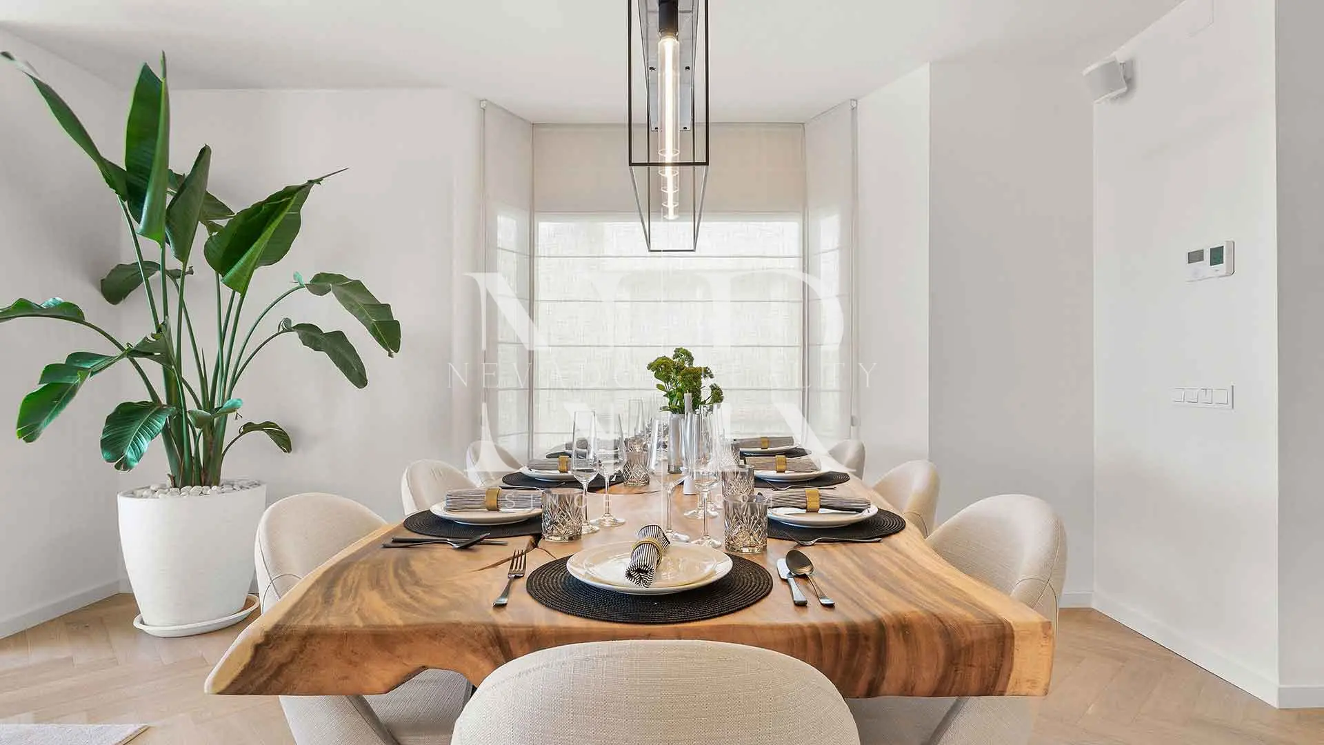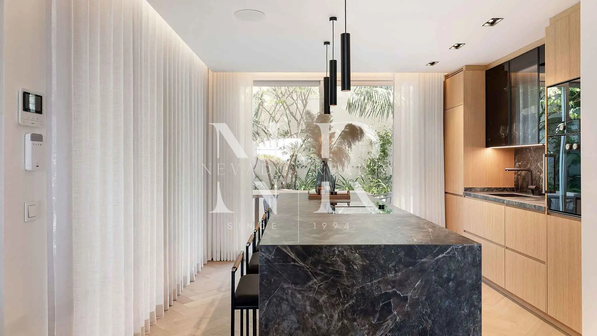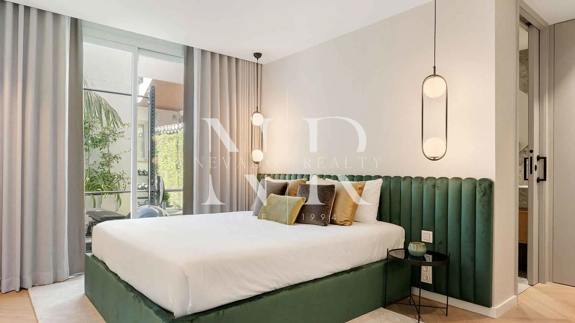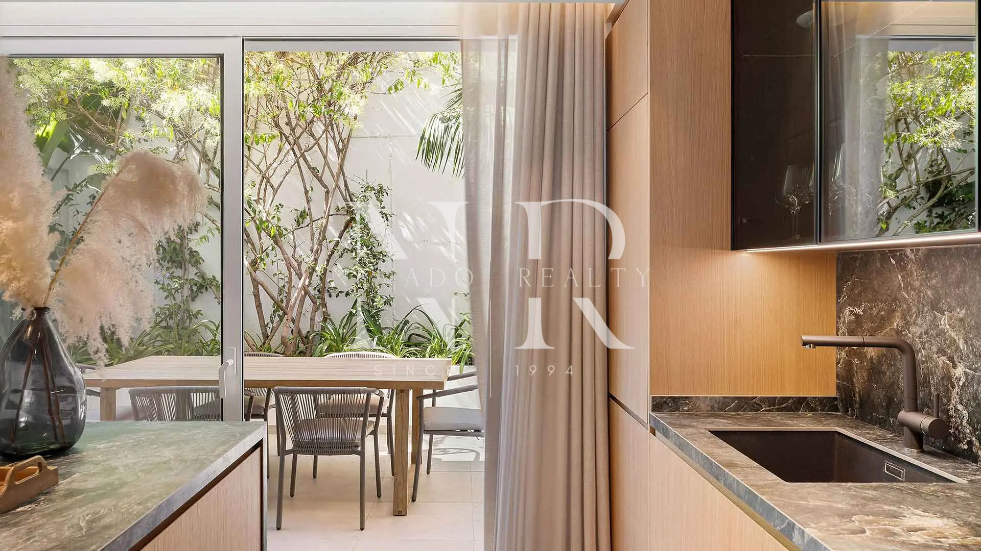 Le spacieux salon ouvert reçoit une abondance de lumière naturelle, mettant en valeur sa décoration soignée dans des tons neutres. La cuisine haut de gamme, équipée d’appareils Gaggenau, allie design et fonctionnalité. Elle est directement reliée à une terrasse privée, idéale pour les repas en plein air. La suite principale dispose d’une élégante salle de bains attenante et d’une baignoire donnant sur la terrasse. En outre, il y a une deuxième chambre polyvalente, idéale pour les invités ou comme espace de vie supplémentaire.