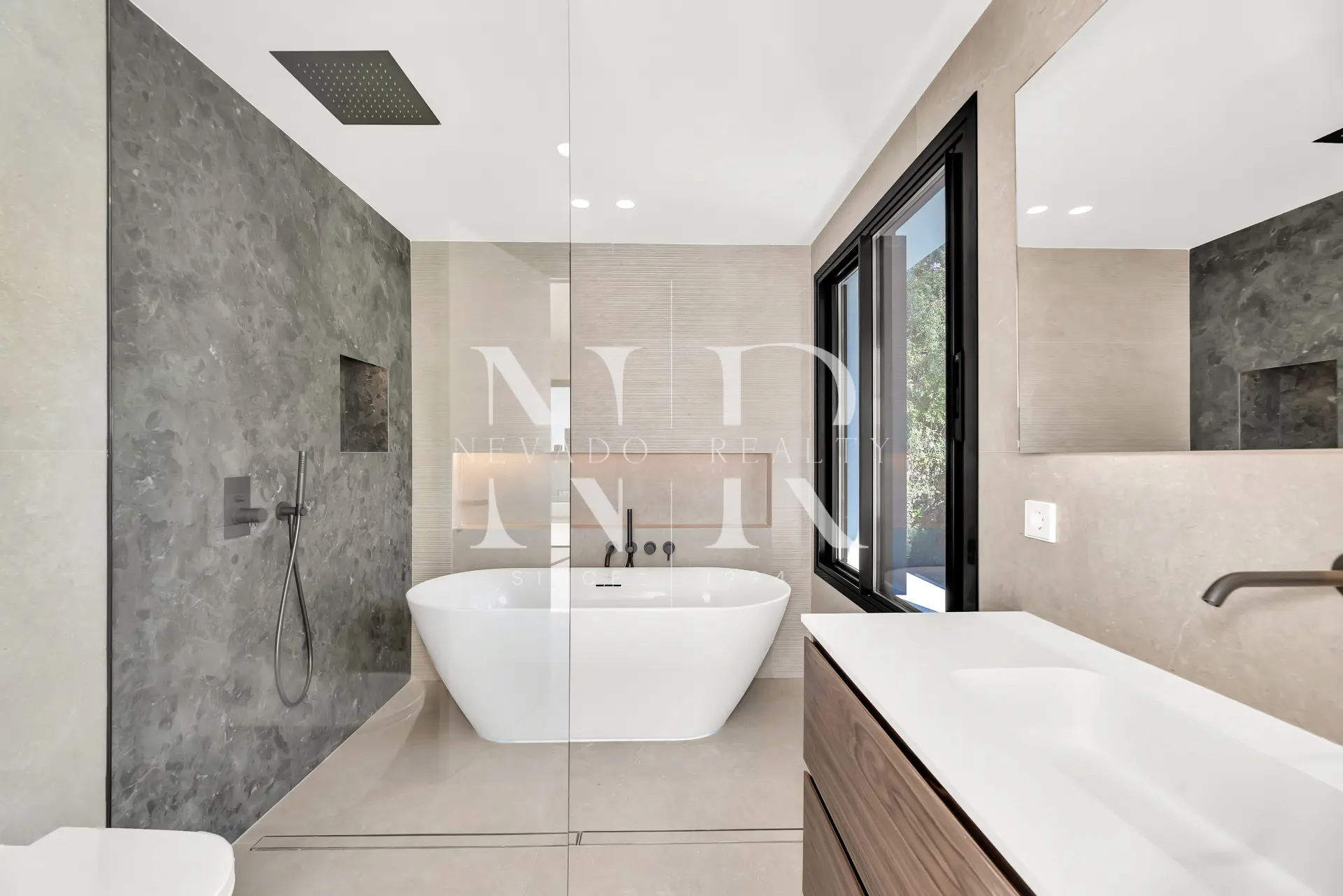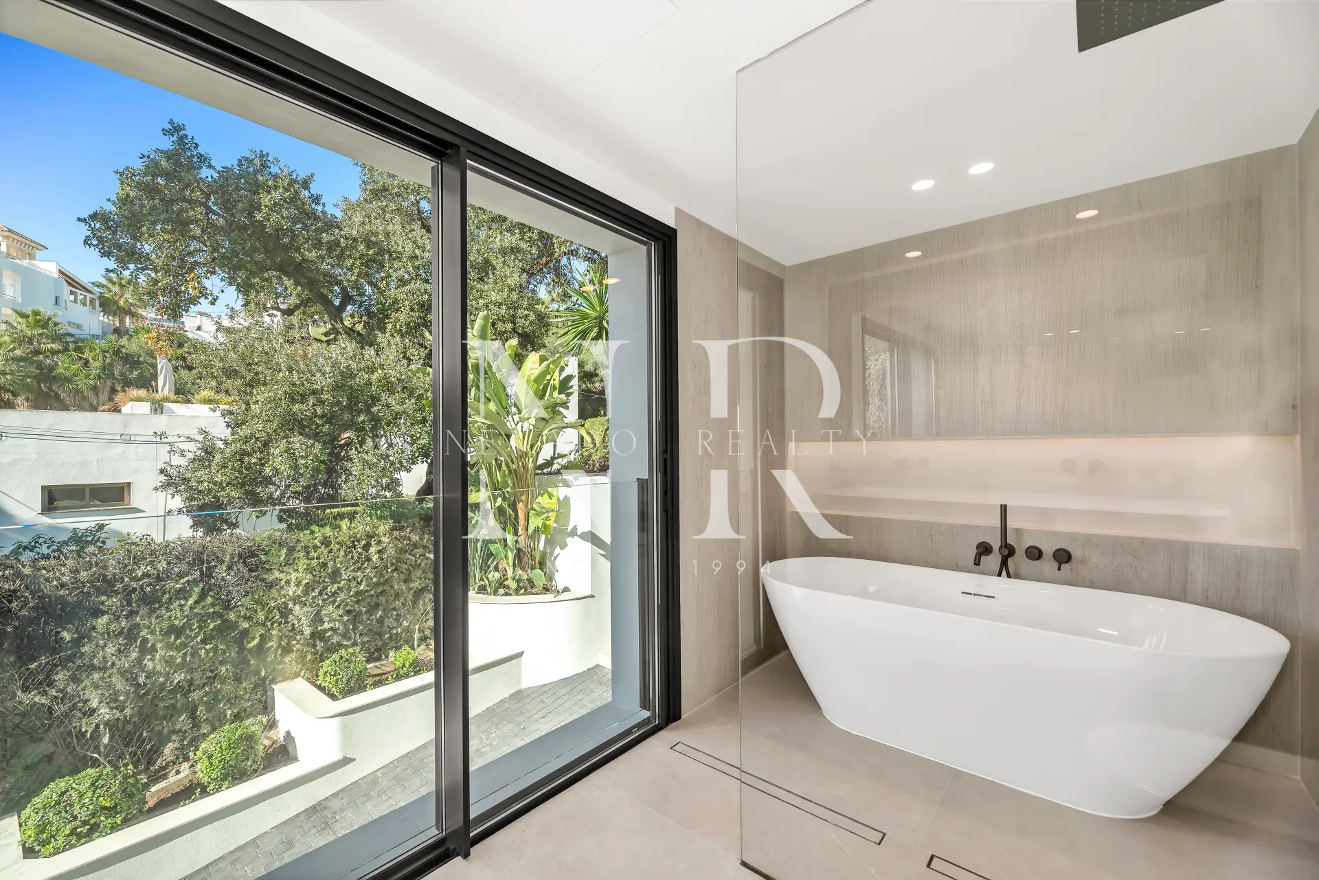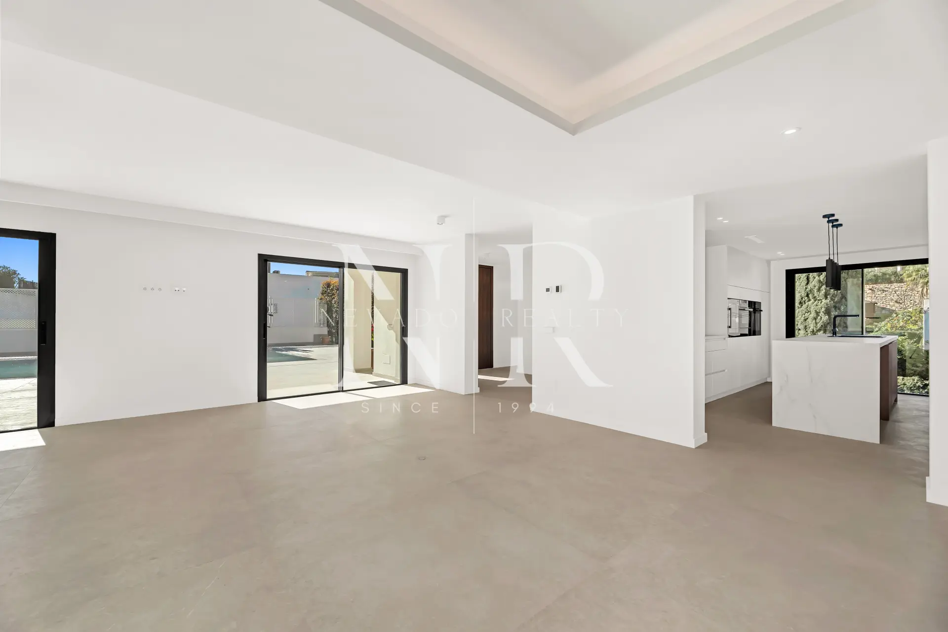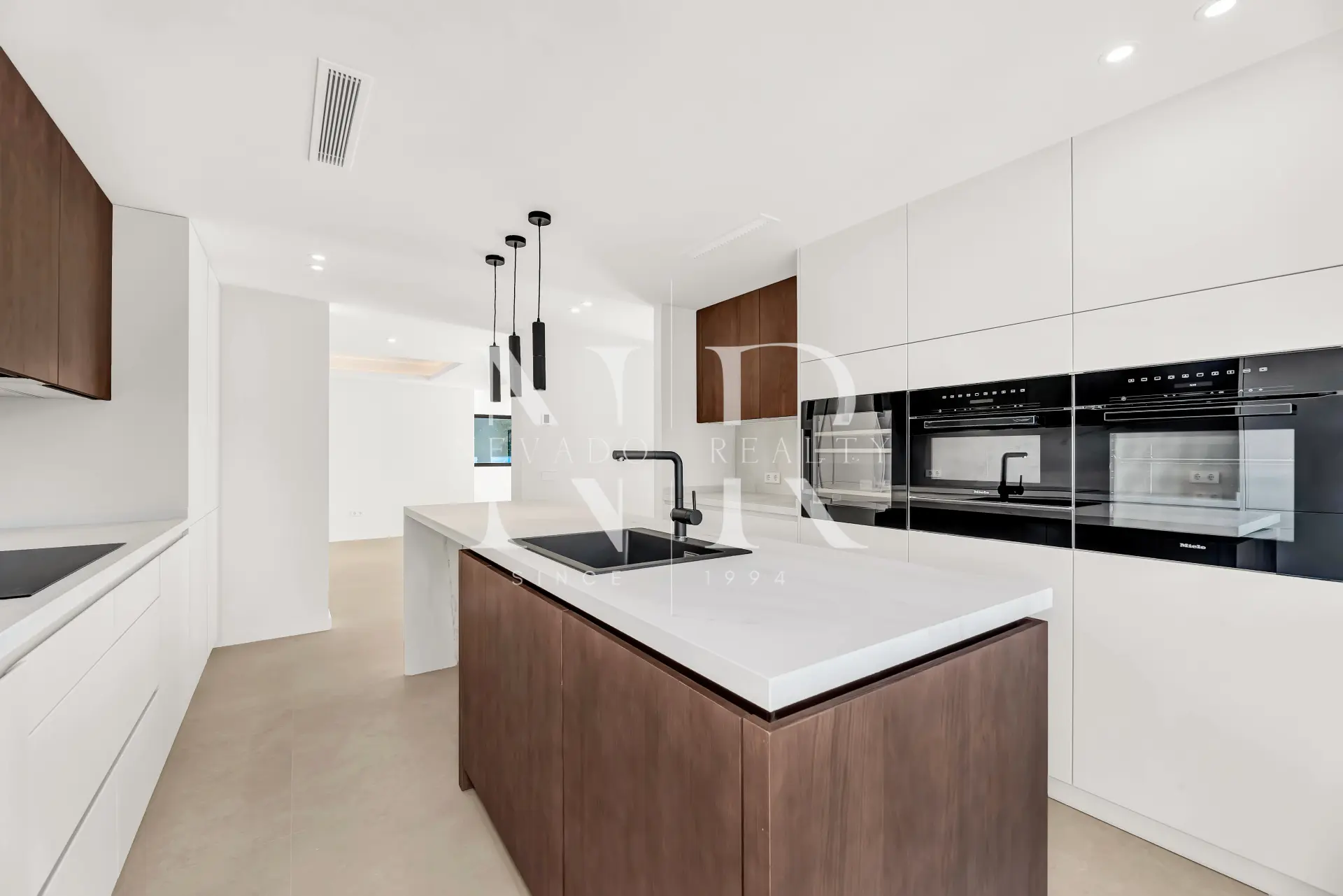 Villa entièrement rénovée à vendre à Elviria. Située dans une rue calme sans issue au cœur d’Elviria, à Marbella Est, cette impressionnante villa moderne se distingue par son architecture aux lignes épurées. Avec un terrain de 1 100 m² et une surface construite de 460 m², cette propriété offre intimité, confort et proximité de tous les services essentiels, notamment les commerces, les restaurants et les écoles internationales.