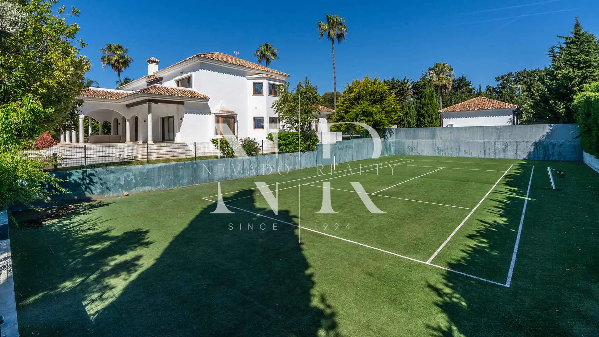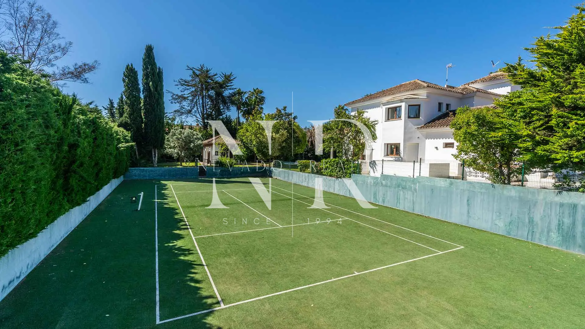 À l’extérieur, la propriété dispose d’une grande piscine entourée de verdure, idéale pour profiter du soleil tout au long de l’année. Parmi les installations les plus remarquables, on trouve un court de tennis privé, un gymnase moderne et une vaste allée avec portail automatique, pouvant accueillir plusieurs véhicules. Cette villa représente une rare opportunité d’acquérir une résidence haut de gamme dans l’un des quartiers les plus exclusifs de Marbella, avec toutes les commodités à portée de main et à deux pas de la Méditerranée.