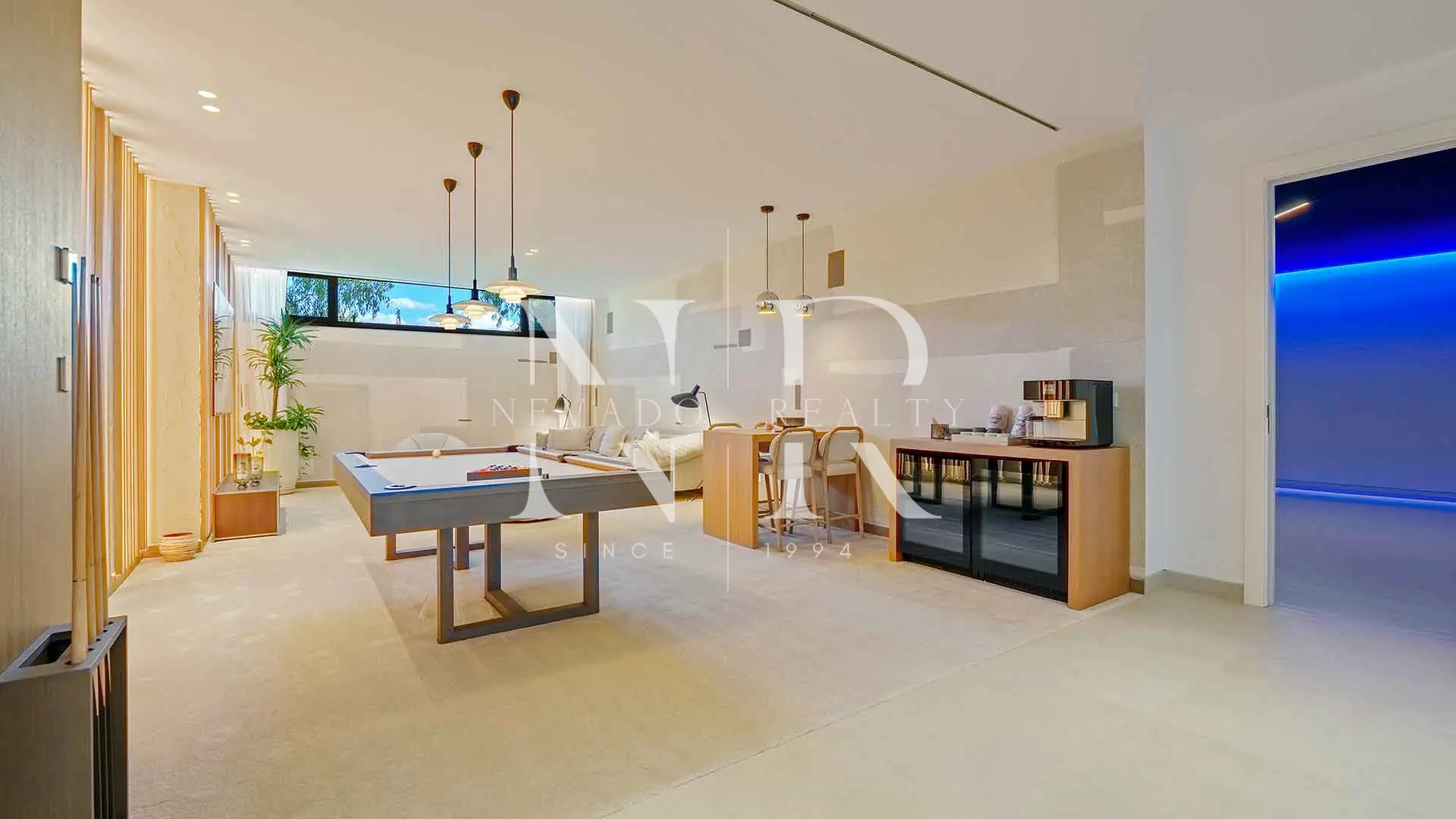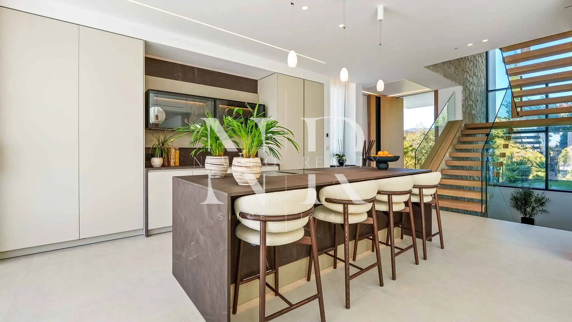 Avec ses 605 m² répartis sur trois niveaux, la villa offre cinq chambres et quatre salles de bains, toutes conçues avec une attention méticuleuse aux détails. Le rez-de-chaussée comprend un salon et une salle à manger ouverts qui s’intègrent à de grandes terrasses et à une spectaculaire piscine à débordement de 73 m², créant un style de vie fluide entre l’intérieur et l’extérieur, idéal pour recevoir des invités ou profiter de moments de tranquillité. Les baies vitrées inondent l’intérieur de lumière naturelle et mettent en valeur les lignes épurées et les finitions contemporaines de la maison.