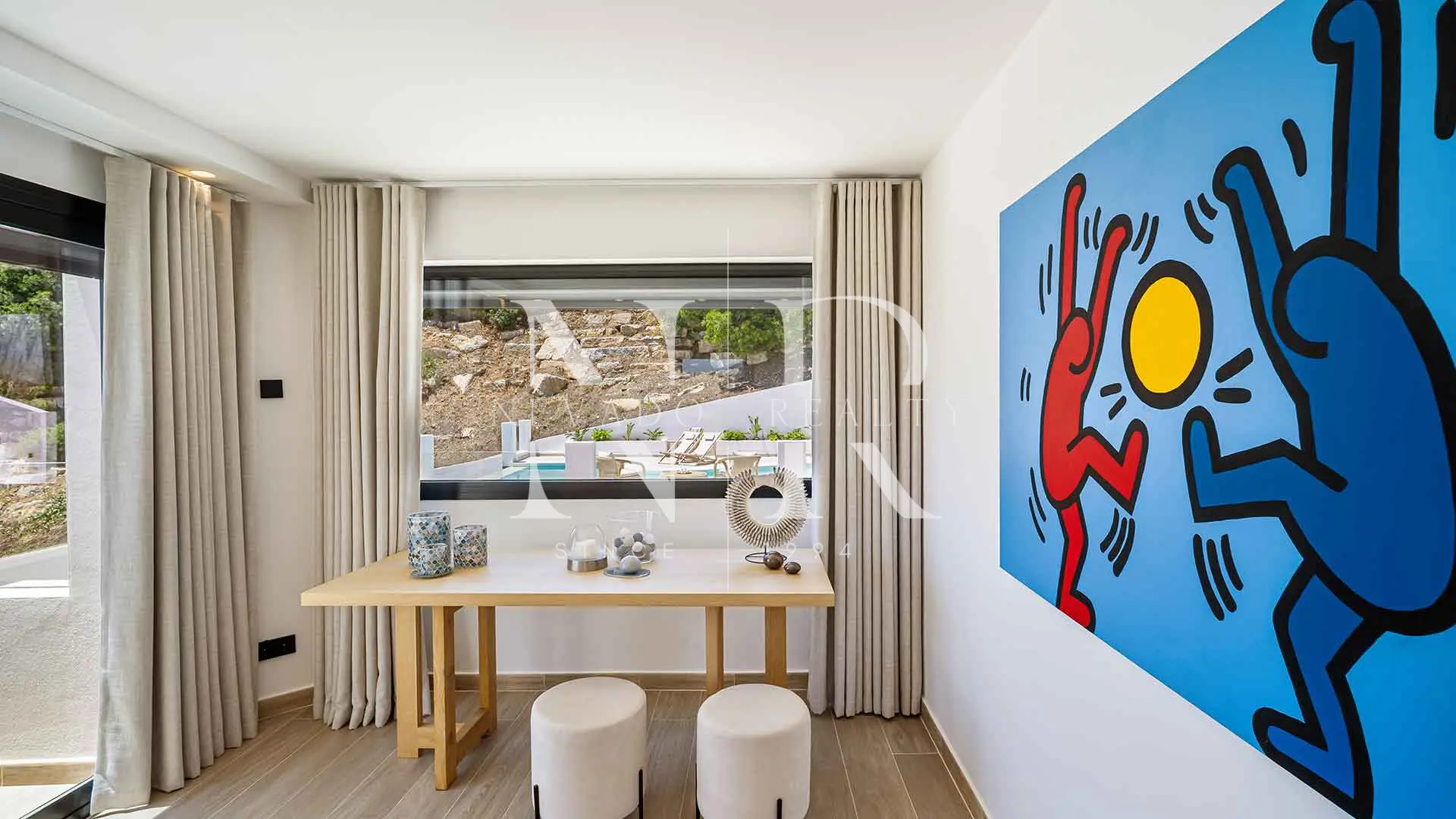 À l’intérieur, chaque recoin a été pensé avec le plus grand soin, de la cuisine équipée d’appareils électroménagers haut de gamme et de finitions luxueuses, au séjour avec sa grande table à manger et ses baies vitrées panoramiques. L’étage supérieur est dédié à la suite parentale avec salon, dressing, salle de bains design et vue panoramique.