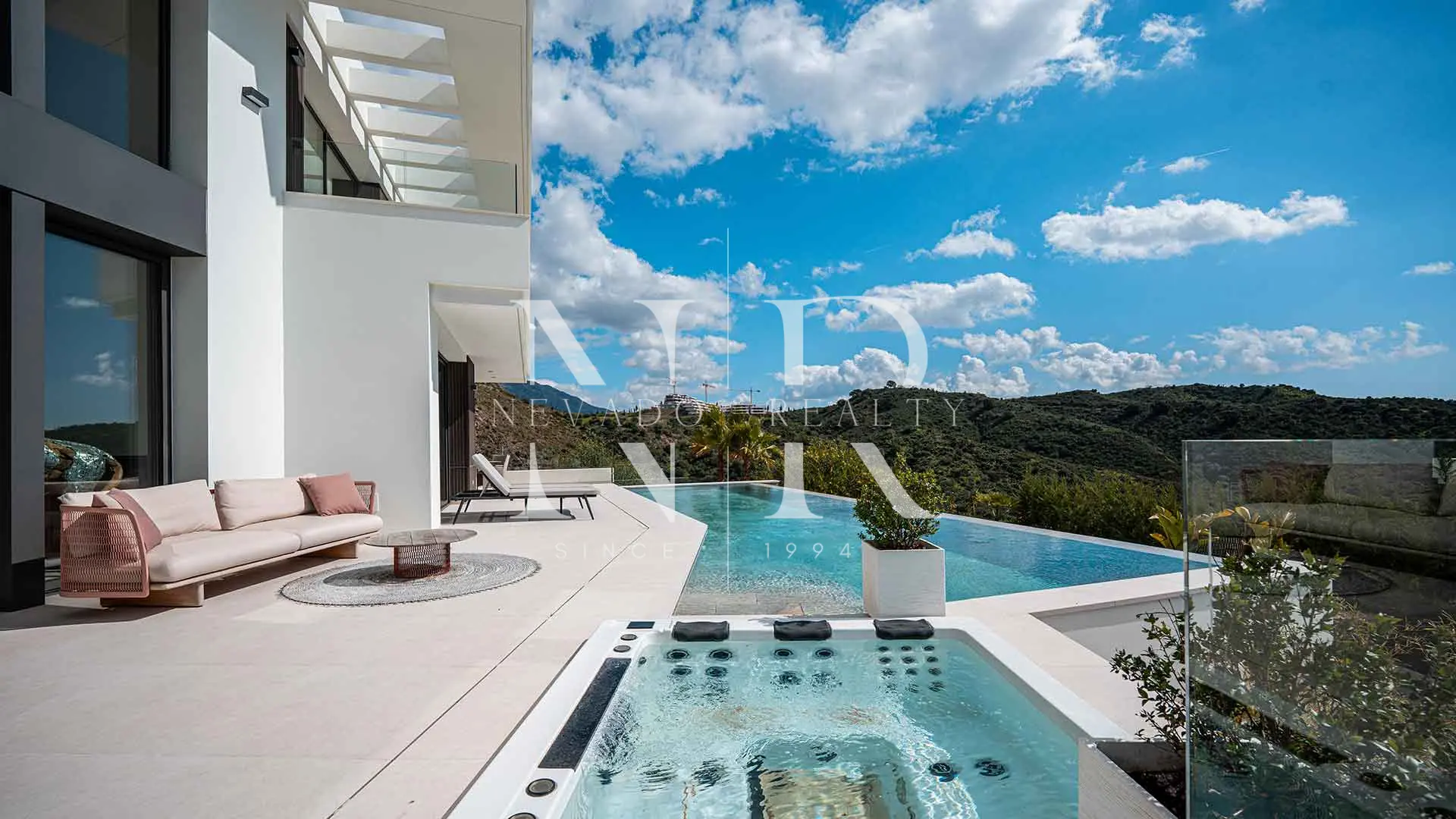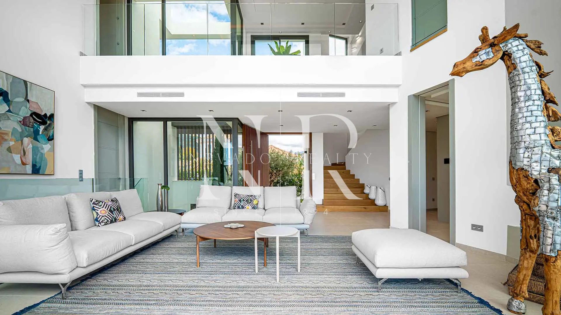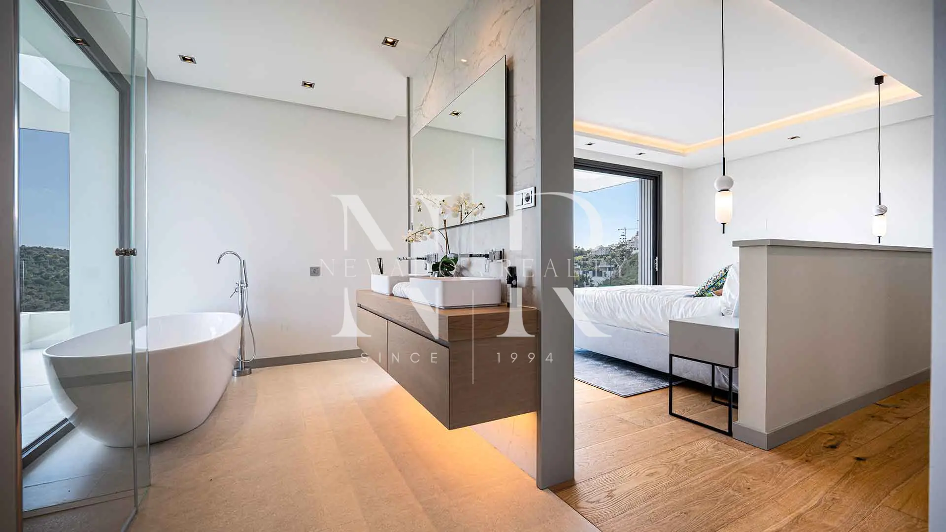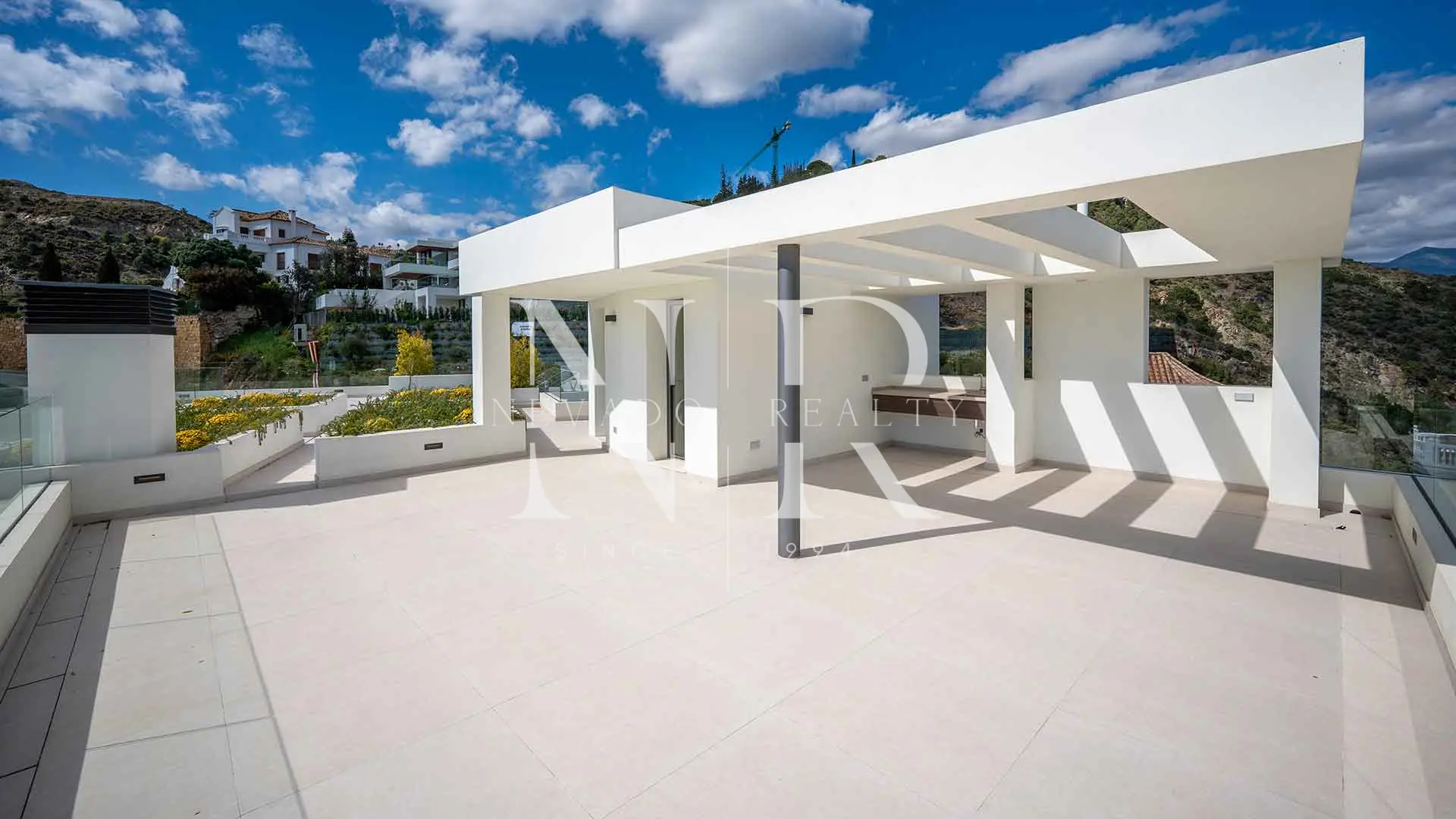 Villa neuve à vendre à Lomas de la Quinta. Située dans le prestigieux domaine privé de Lomas de la Quinta, avec une vue imprenable sur le golf, la vallée et la mer Méditerranée, cette propriété exposée plein sud s’étend sur un terrain de 1 377 m² et se distingue par son intimité absolue, son design contemporain et son atmosphère de sérénité.