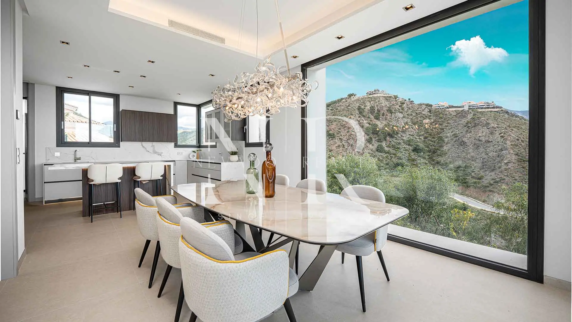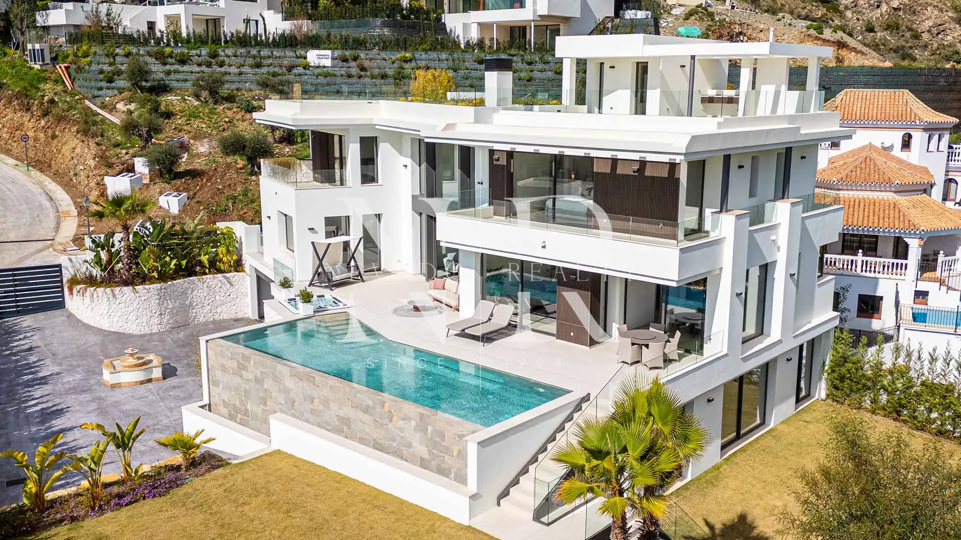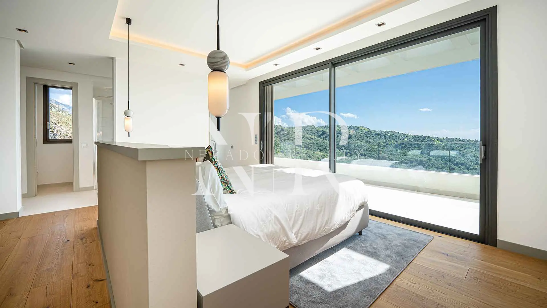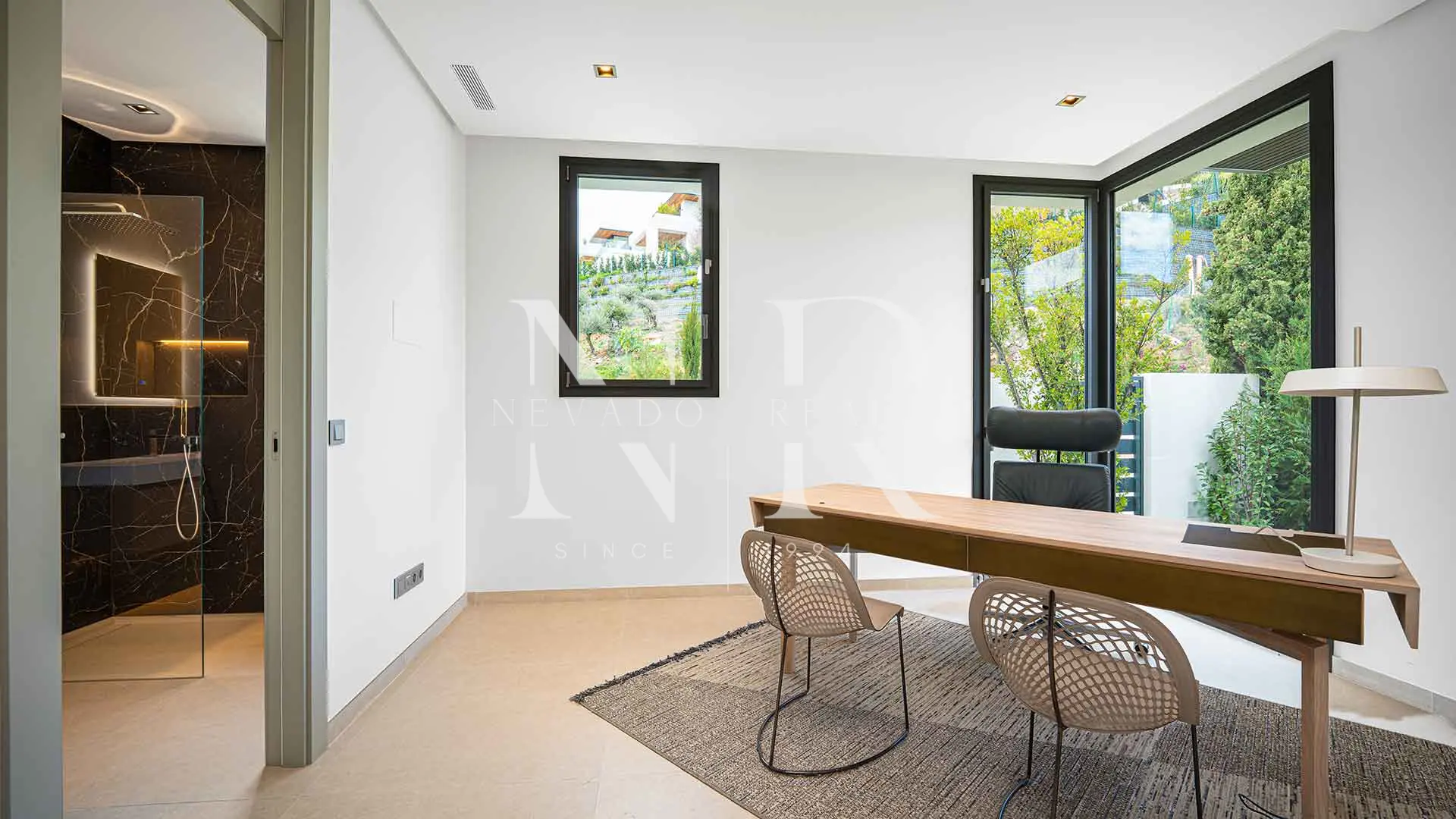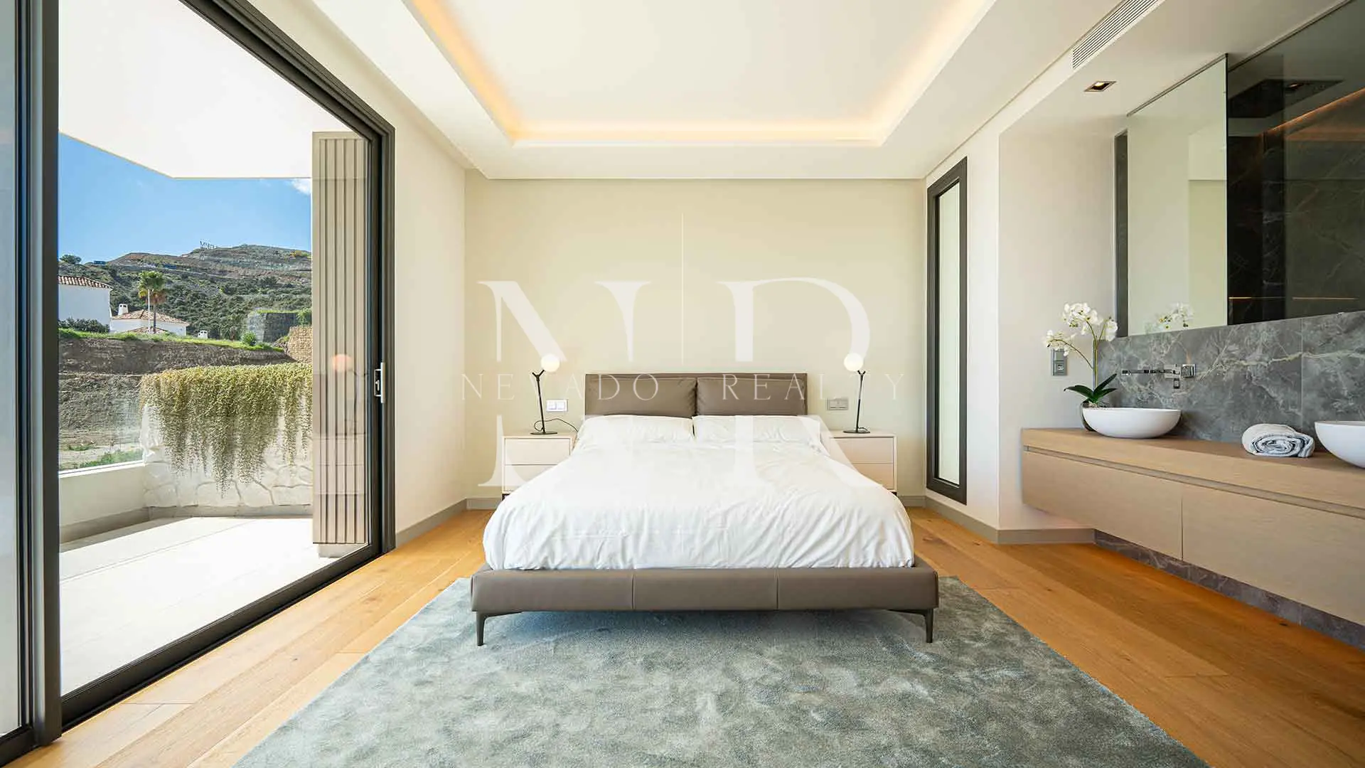 Villa neuve à vendre à Lomas de la Quinta. Située dans le prestigieux domaine privé de Lomas de la Quinta, avec une vue imprenable sur le golf, la vallée et la mer Méditerranée, cette propriété exposée plein sud s’étend sur un terrain de 1 377 m² et se distingue par son intimité absolue, son design contemporain et son atmosphère de sérénité.