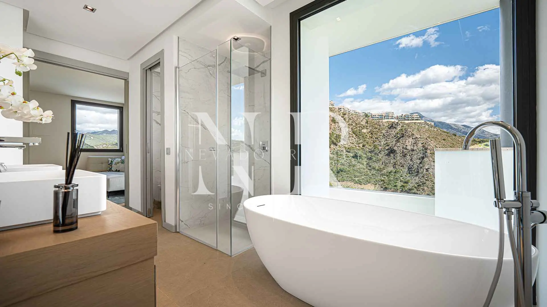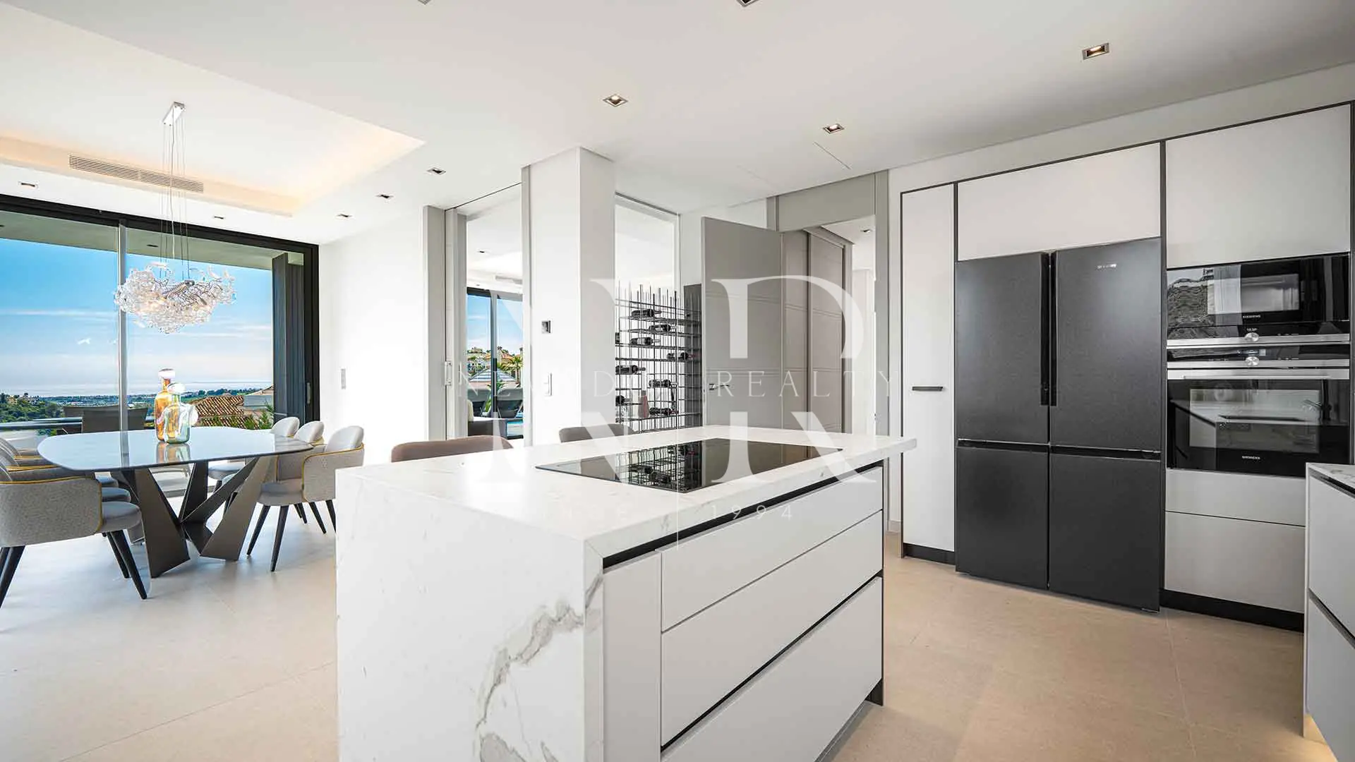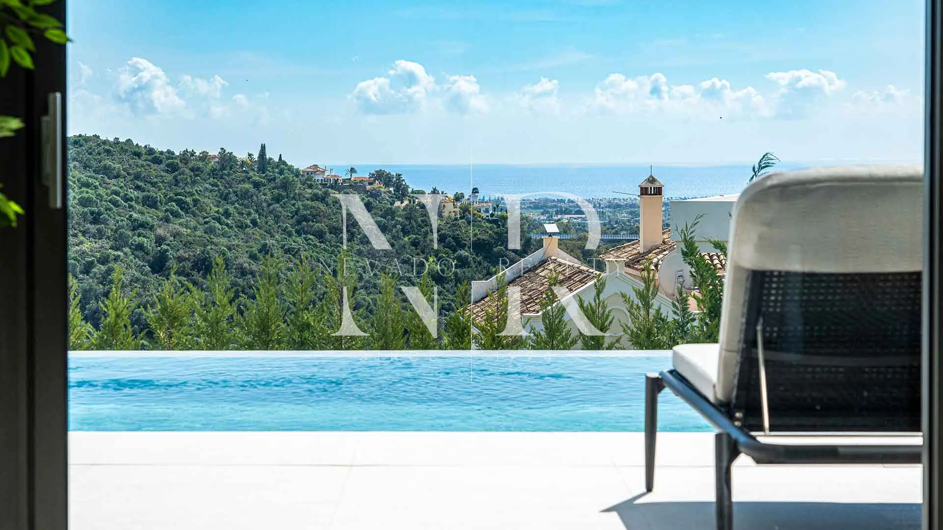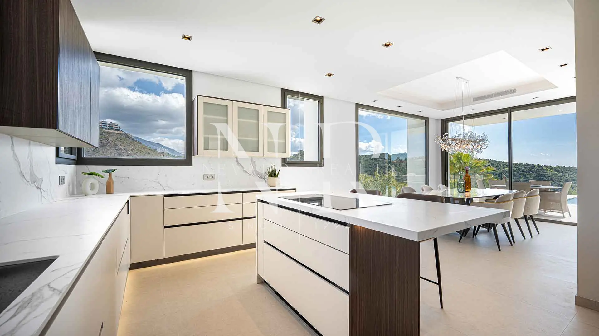 Villa neuve à vendre à Lomas de la Quinta. Située dans le prestigieux domaine privé de Lomas de la Quinta, avec une vue imprenable sur le golf, la vallée et la mer Méditerranée, cette propriété exposée plein sud s’étend sur un terrain de 1 377 m² et se distingue par son intimité absolue, son design contemporain et son atmosphère de sérénité.