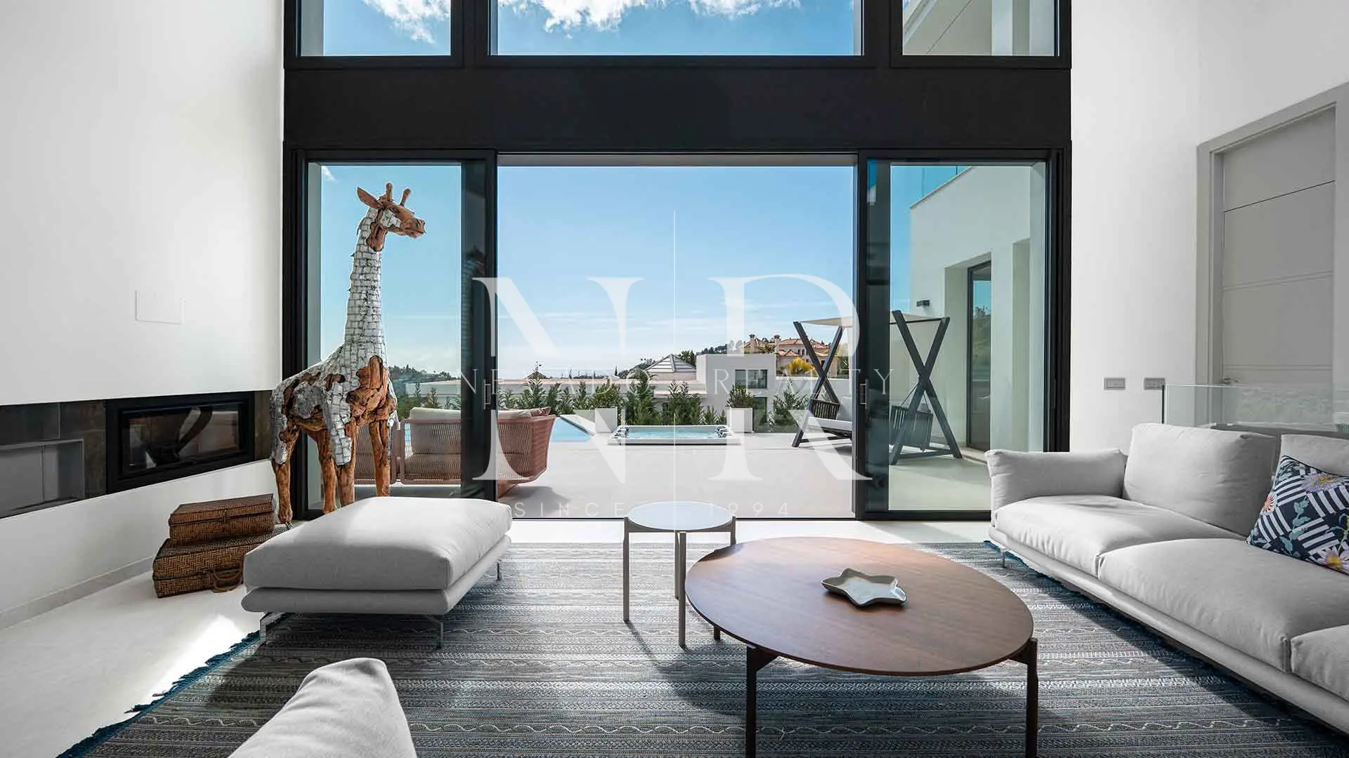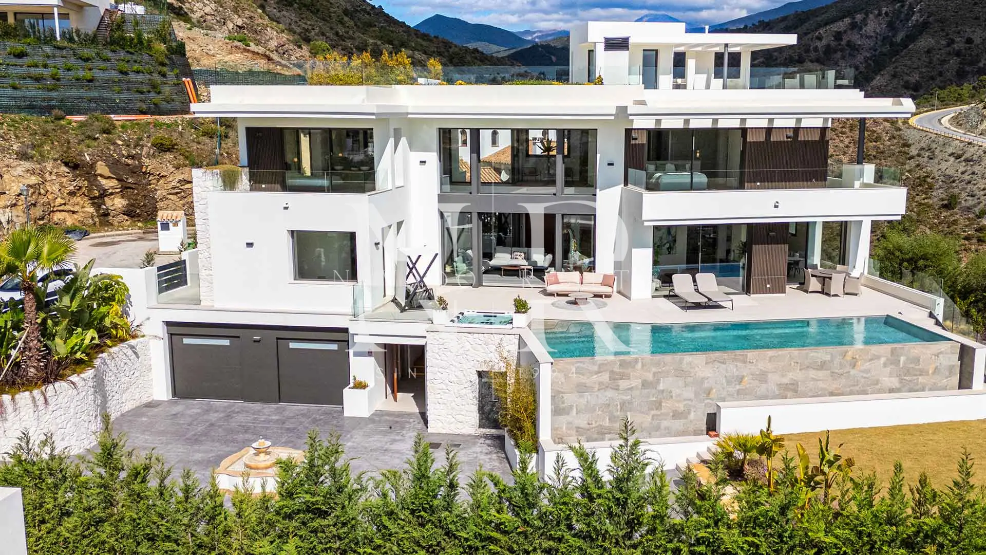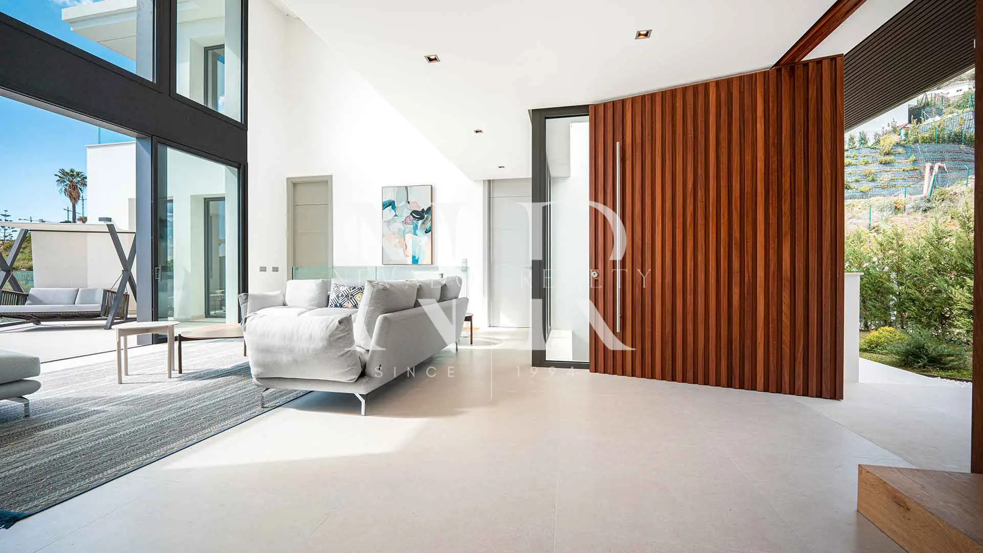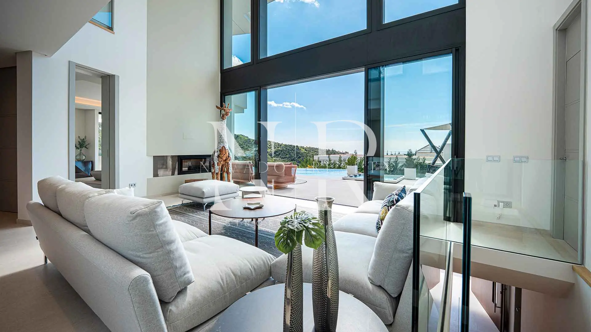 La villa comprend six suites et de vastes espaces de vie baignés de lumière naturelle grâce à ses baies vitrées. Dans le salon principal, la double hauteur sous plafond et la fluidité entre l’intérieur et l’extérieur créent une impression d’espace unique. Des terrasses mènent à une piscine à débordement d’eau salée, entourée d’espaces de détente et de zones permettant de profiter pleinement du climat de la Costa del Sol.