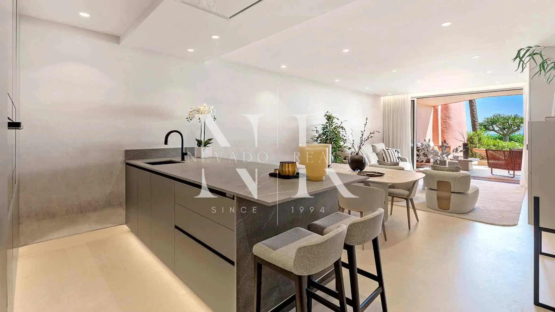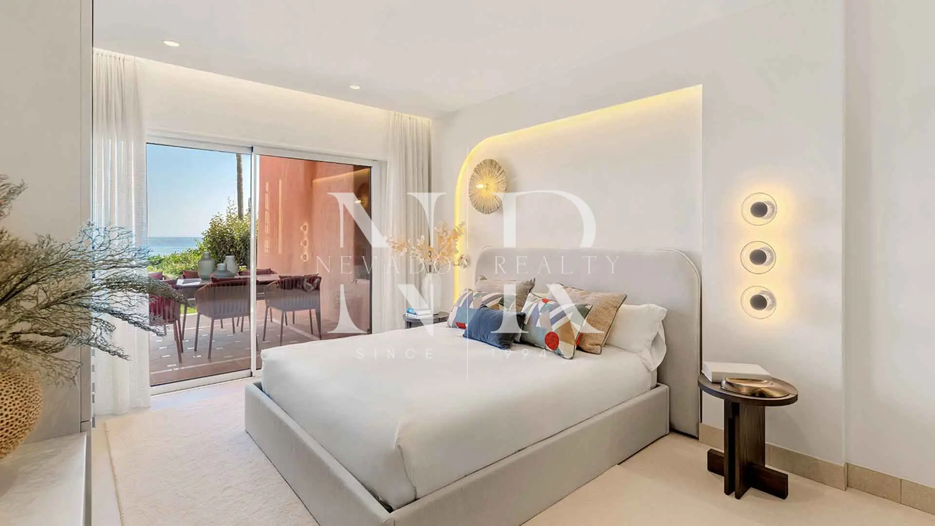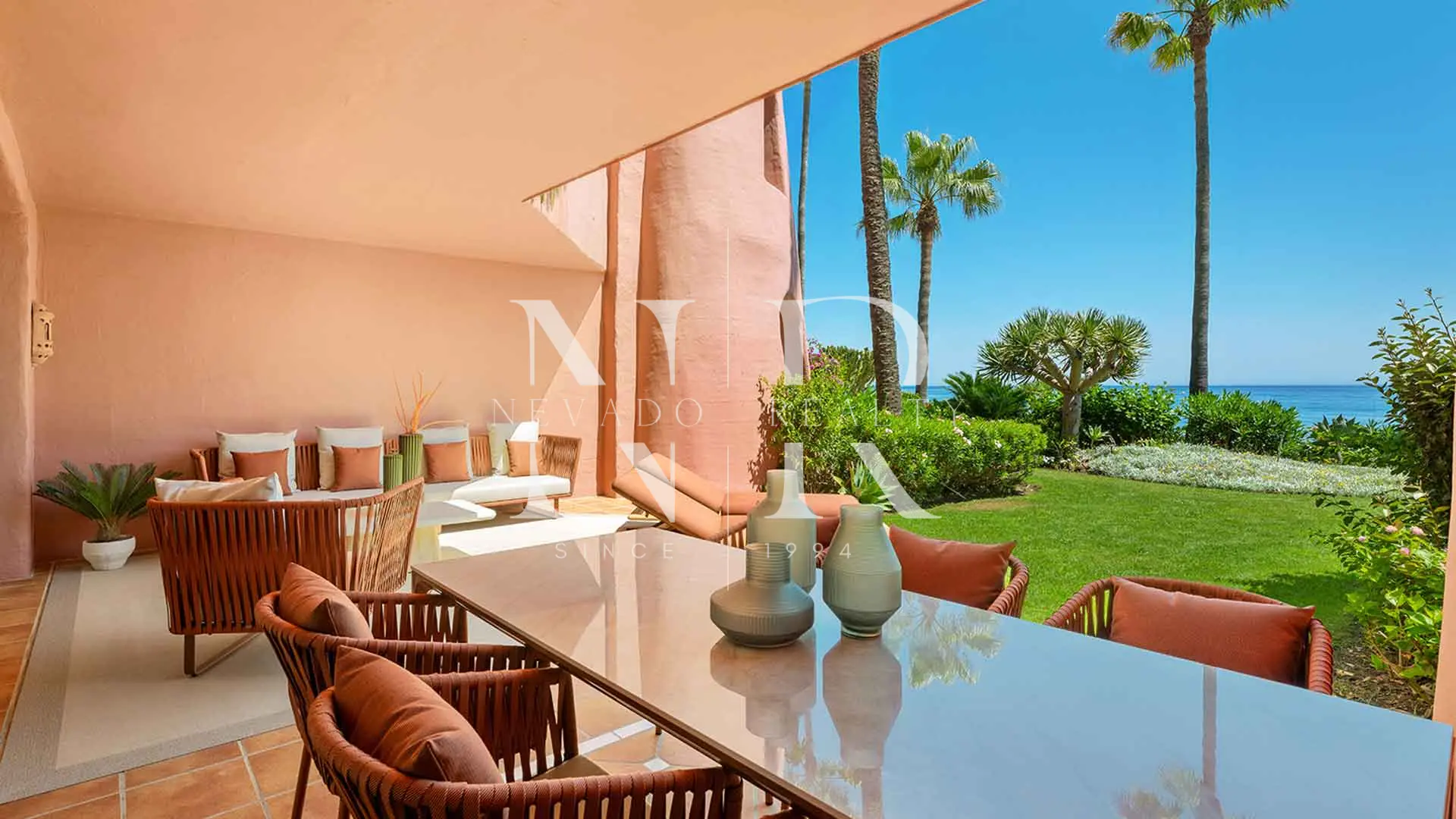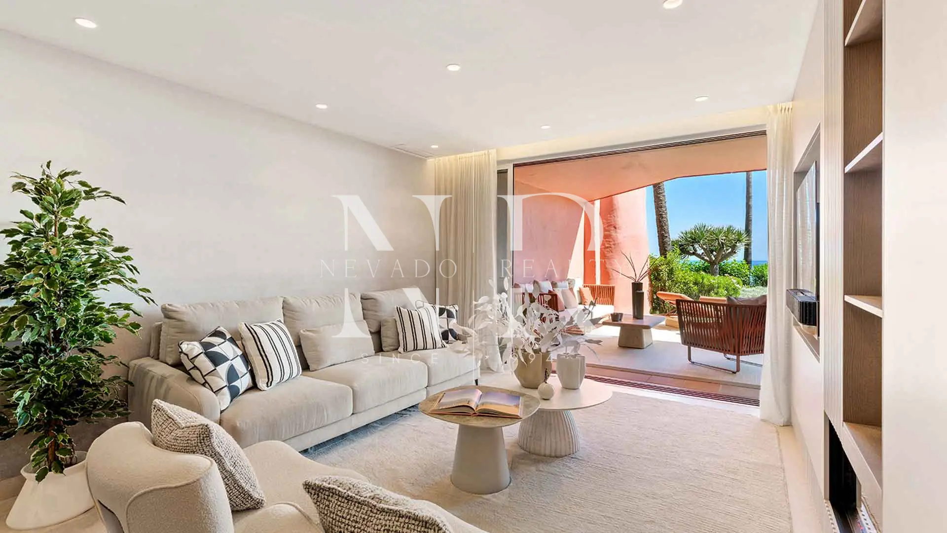 Appartement à vendre dans le complexe Menara Beach, en première ligne de plage. Découvrez le véritable style de vie en bord de mer dans cet appartement exclusif entièrement rénové, situé dans le prestigieux complexe Menara Beach, au cœur de la Nueva Milla de Oro, entre Marbella et Estepona. Conçue par le célèbre architecte Melvin Villaroel, Menara Beach est une communauté fermée qui offre une sécurité 24 heures sur 24, un accès direct à la plage et un environnement privilégié avec des jardins tropicaux soigneusement conçus.