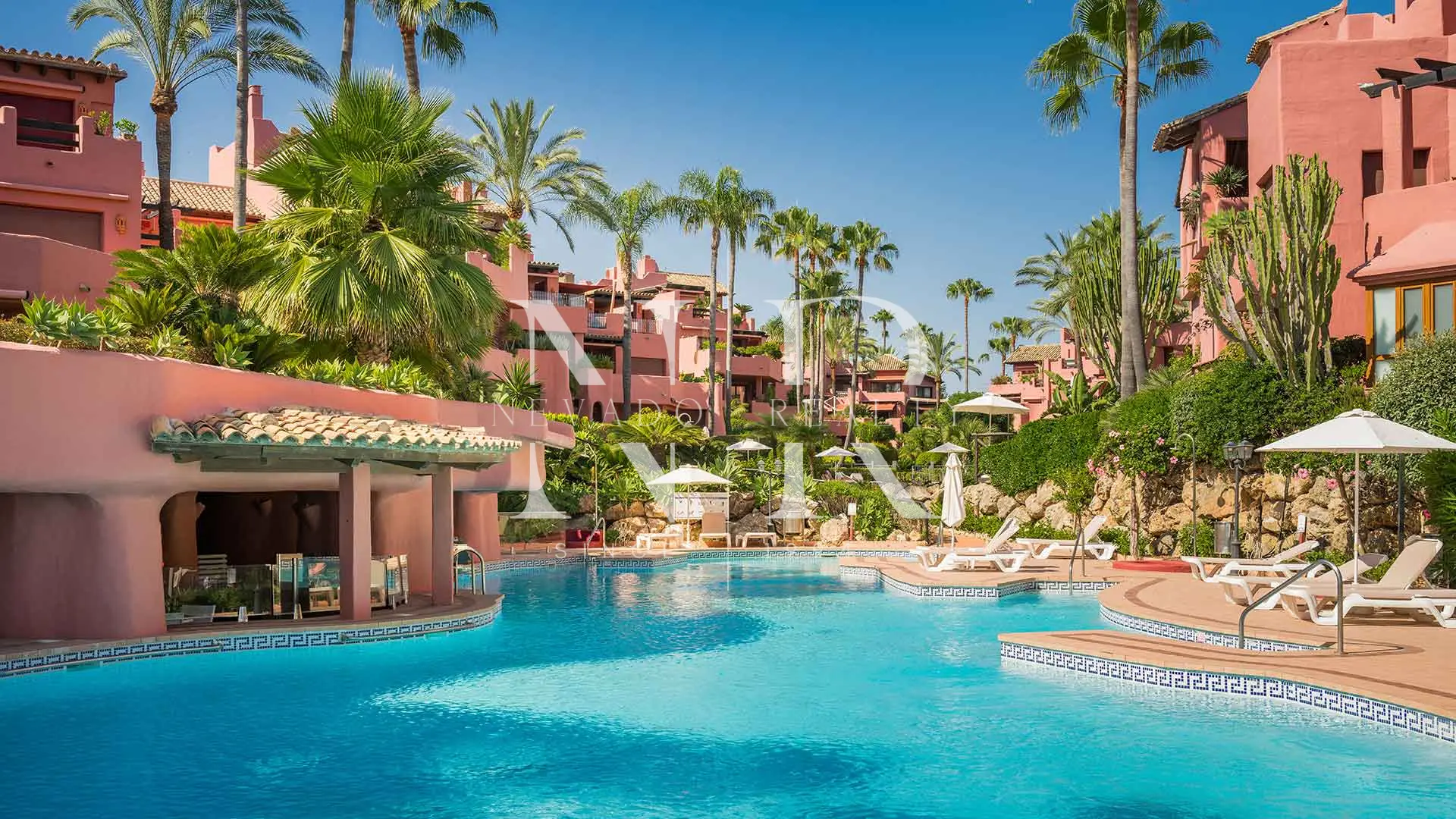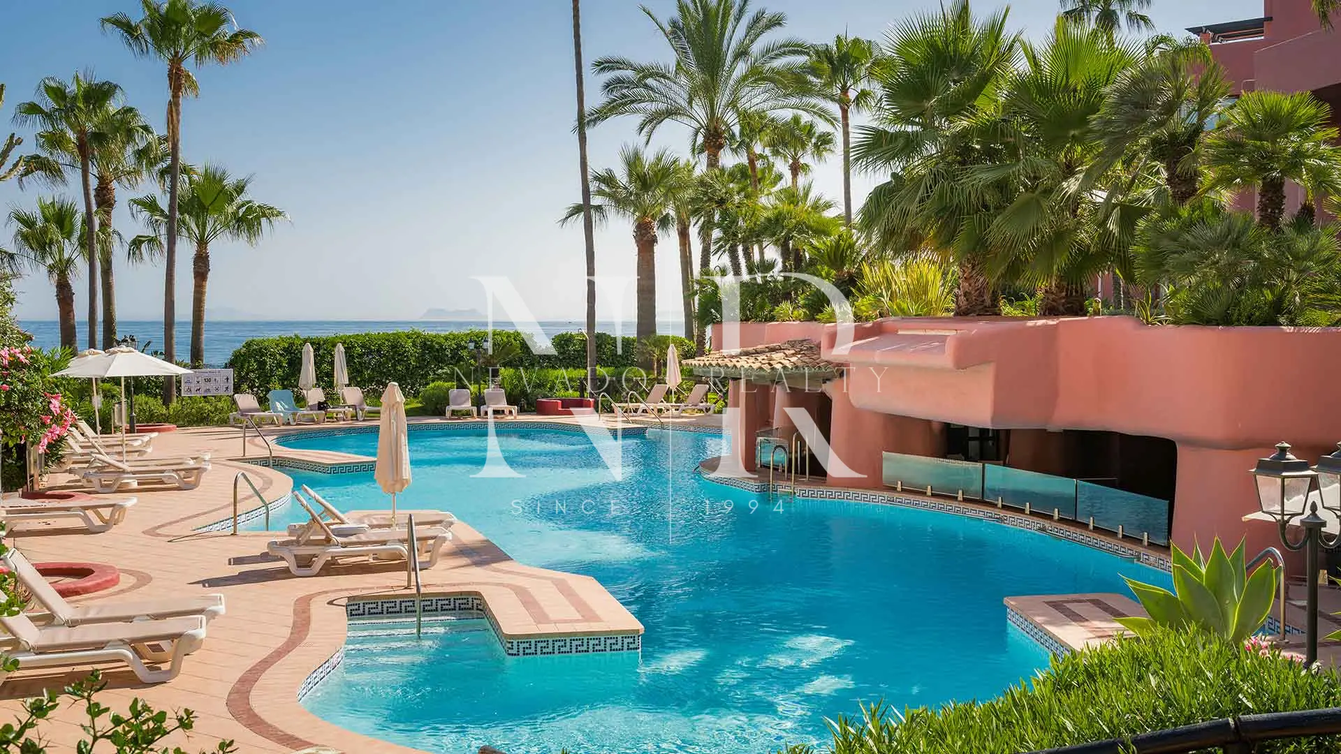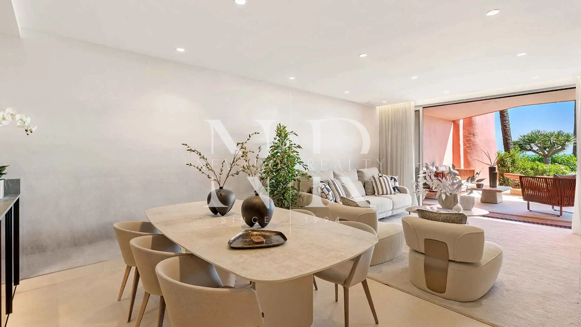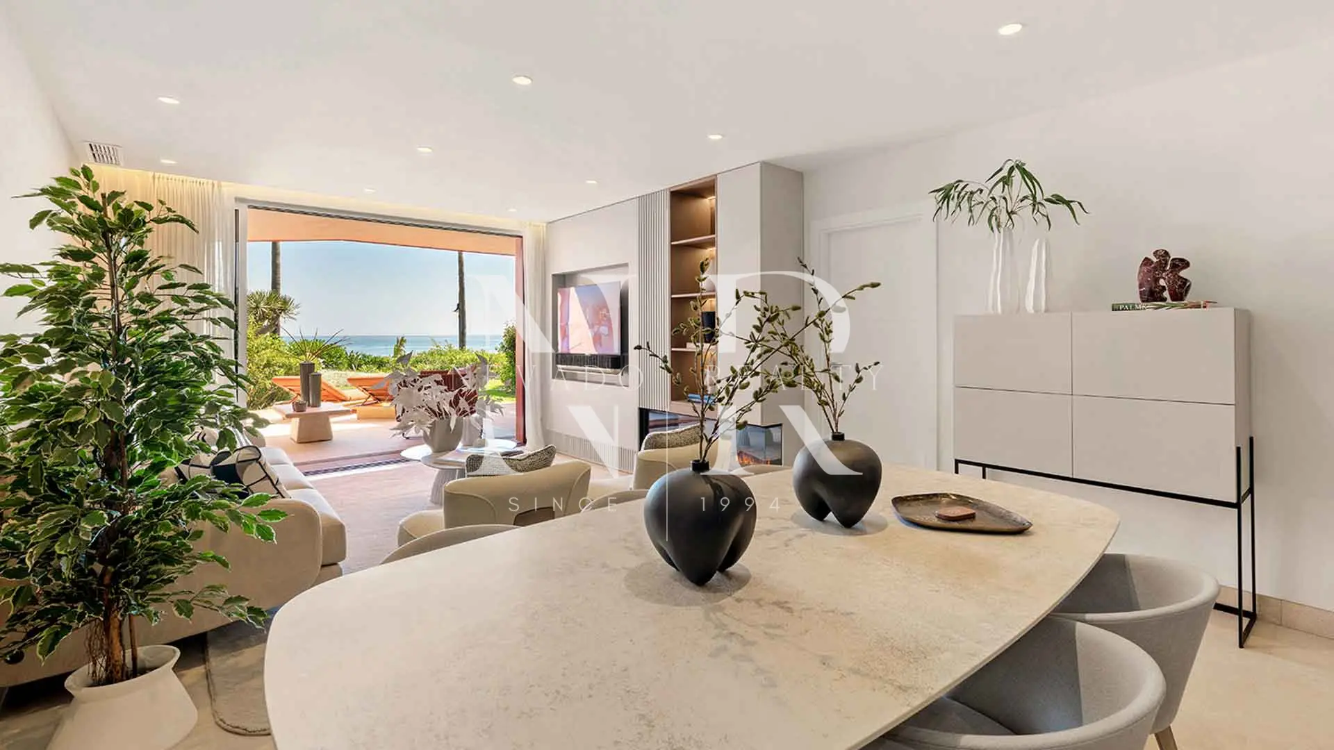 Appartement à vendre dans le complexe Menara Beach, en première ligne de plage. Découvrez le véritable style de vie en bord de mer dans cet appartement exclusif entièrement rénové, situé dans le prestigieux complexe Menara Beach, au cœur de la Nueva Milla de Oro, entre Marbella et Estepona. Conçue par le célèbre architecte Melvin Villaroel, Menara Beach est une communauté fermée qui offre une sécurité 24 heures sur 24, un accès direct à la plage et un environnement privilégié avec des jardins tropicaux soigneusement conçus.