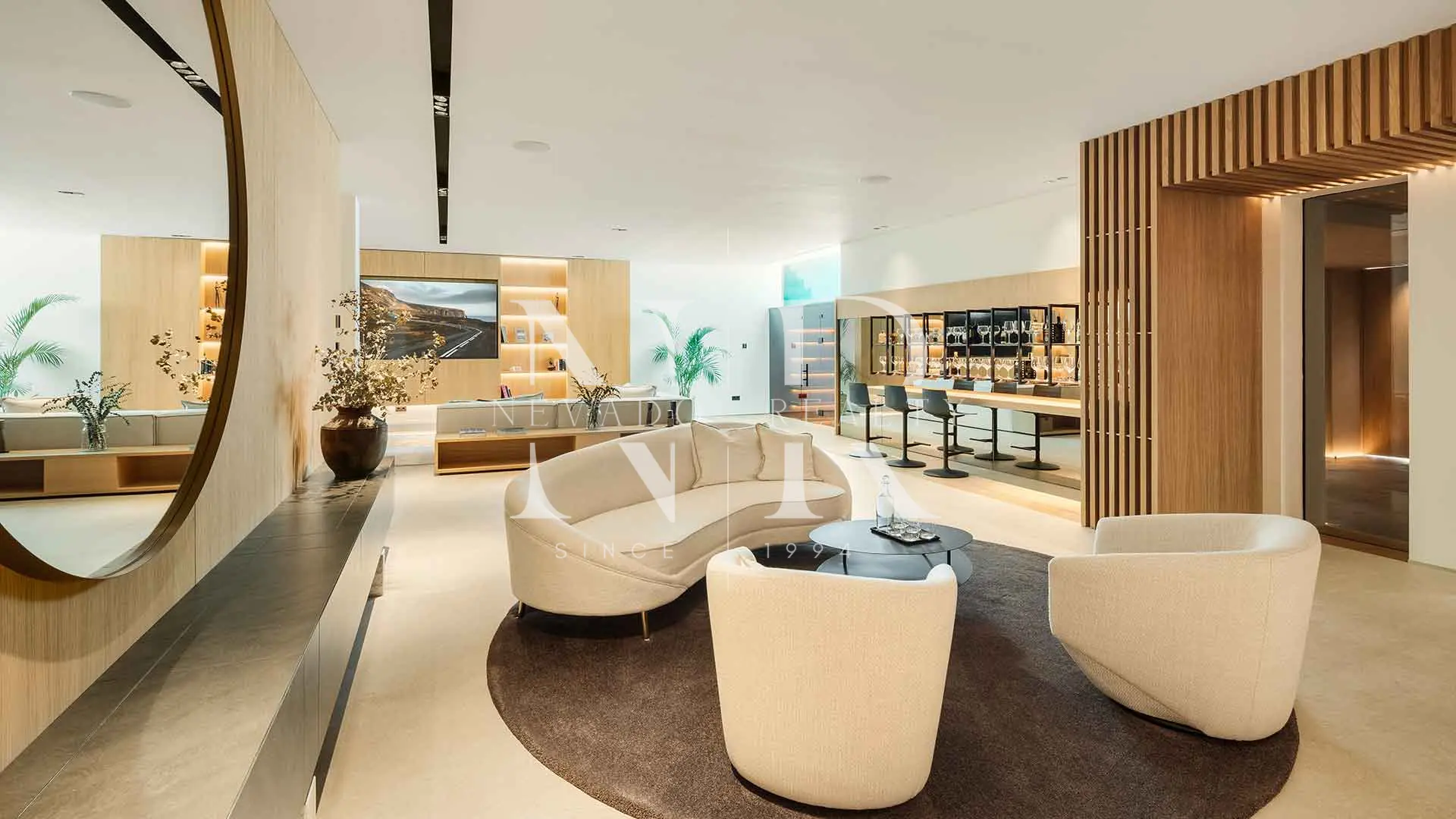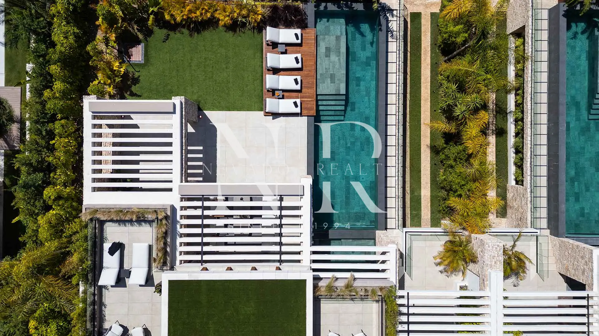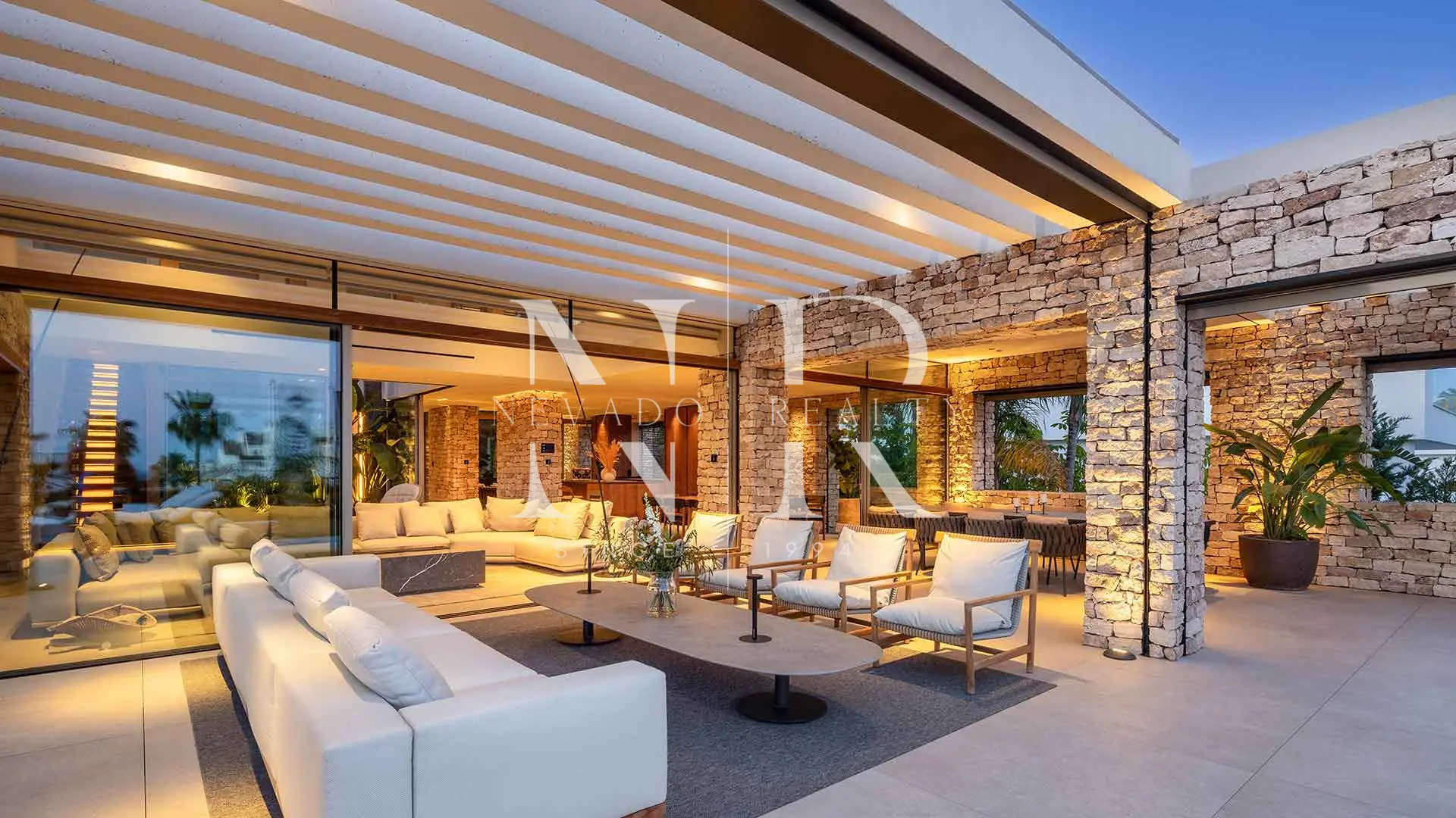 L’extérieur de la villa offre une spectaculaire piscine à débordement et plusieurs espaces de détente, parfaits pour profiter du climat méditerranéen et se relaxer dans un environnement luxueux.
