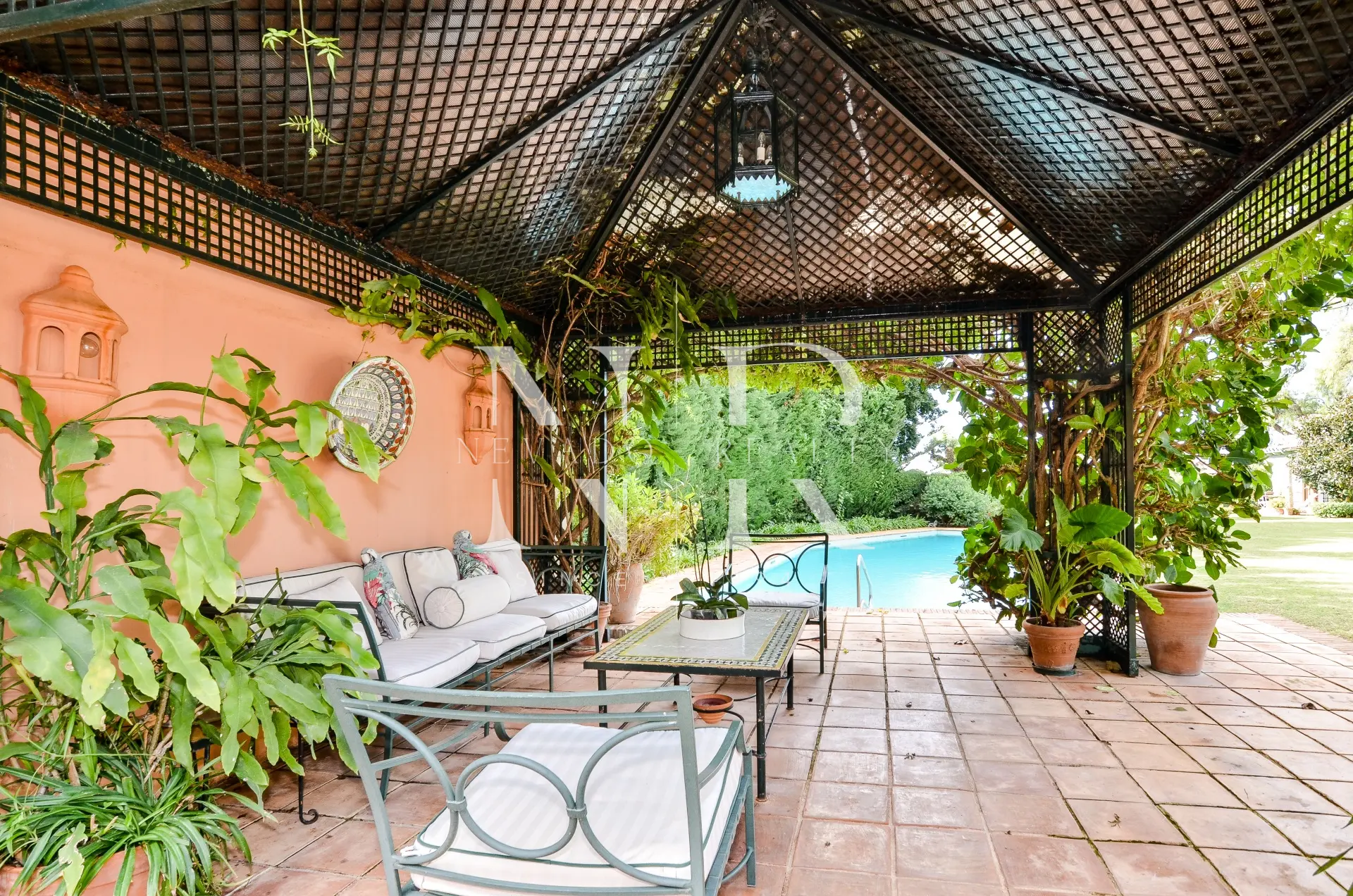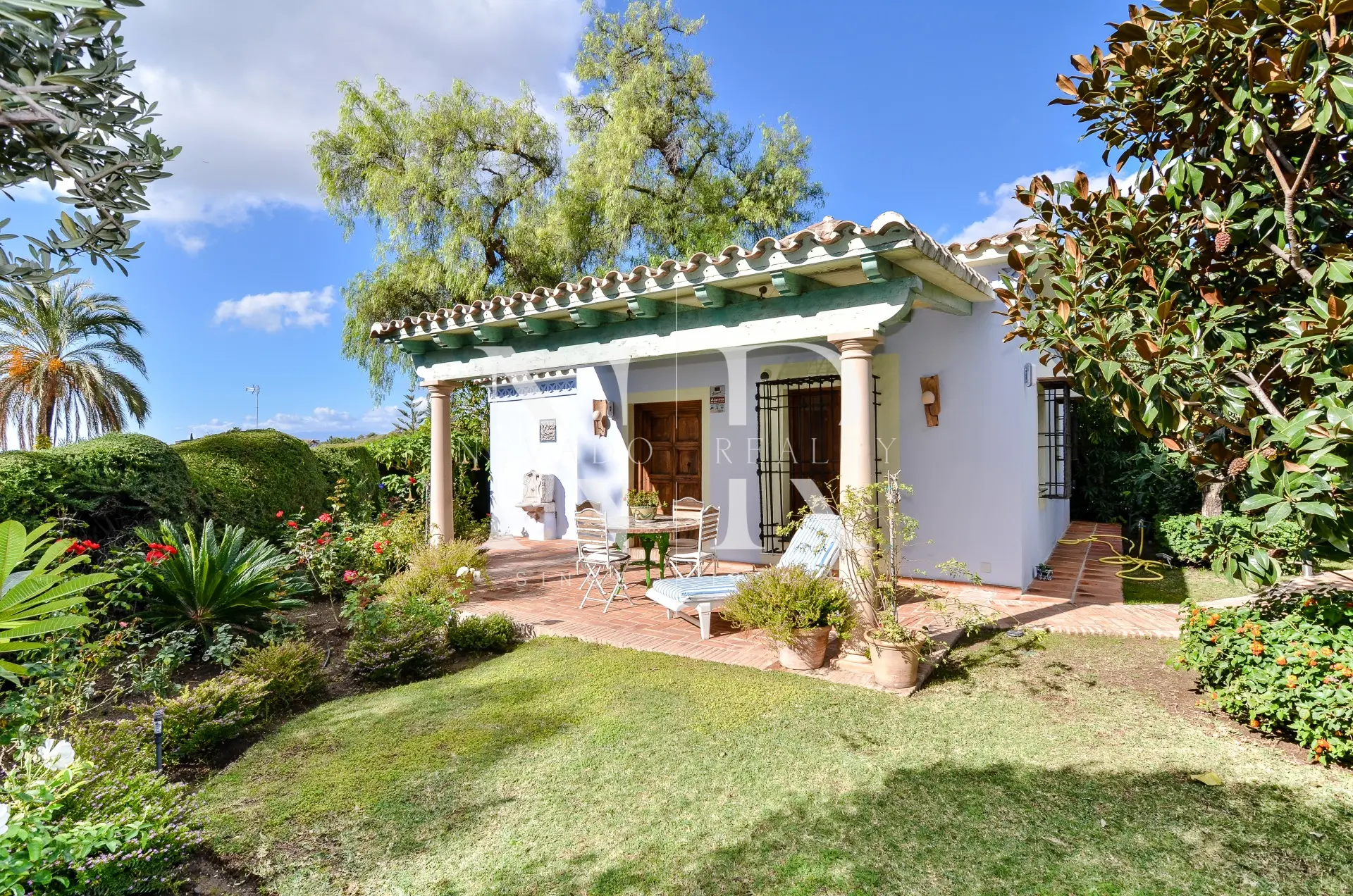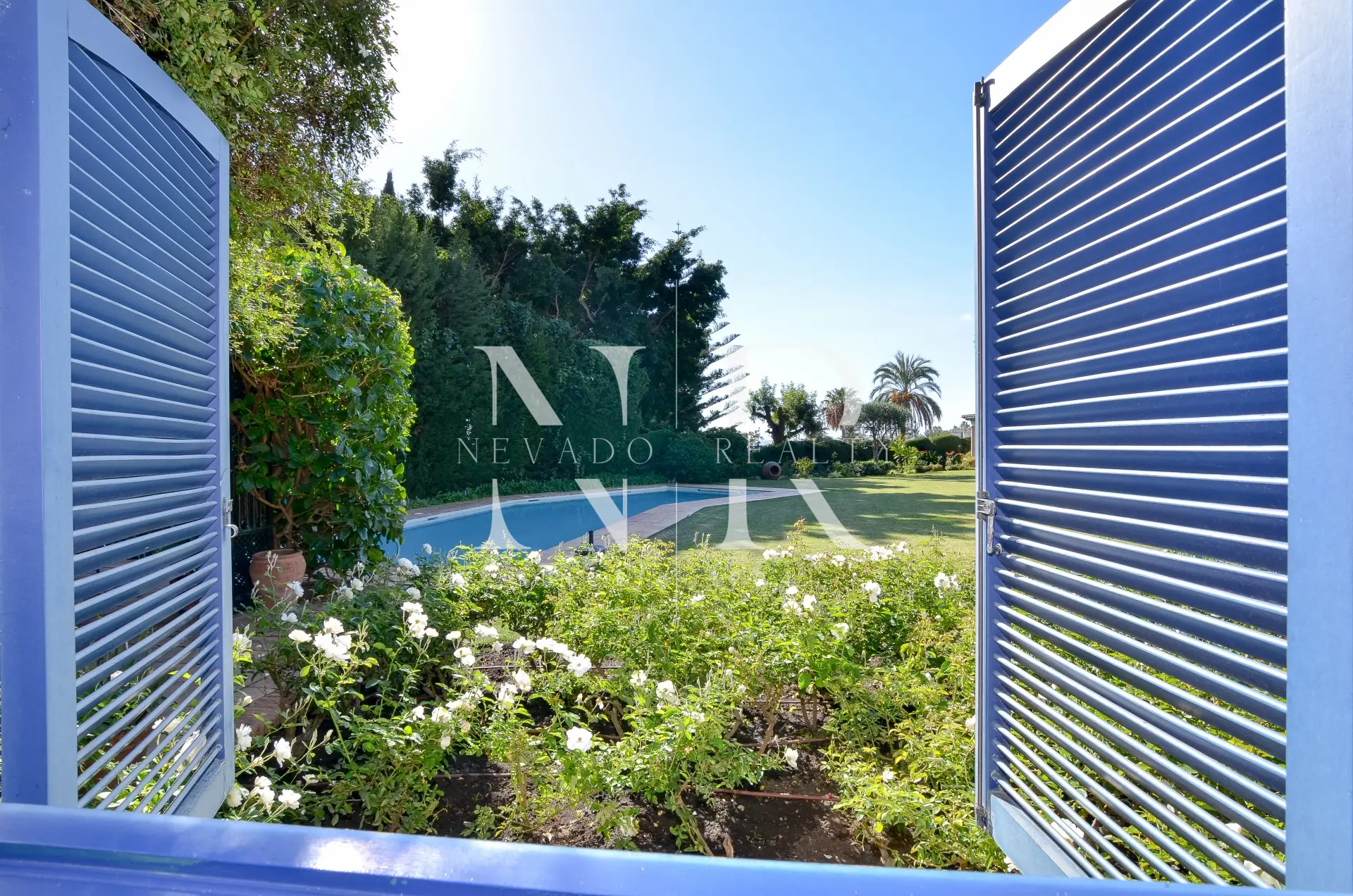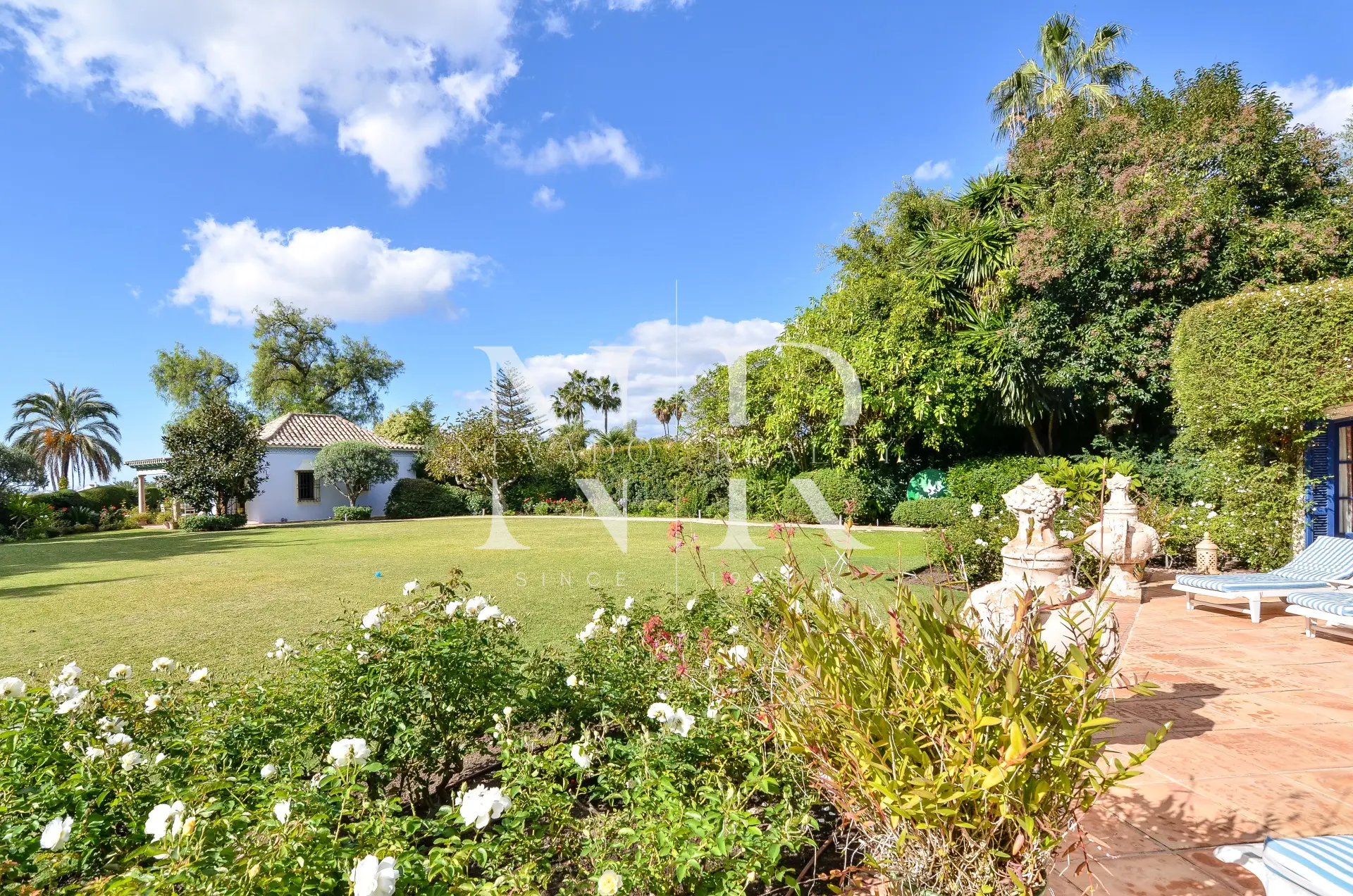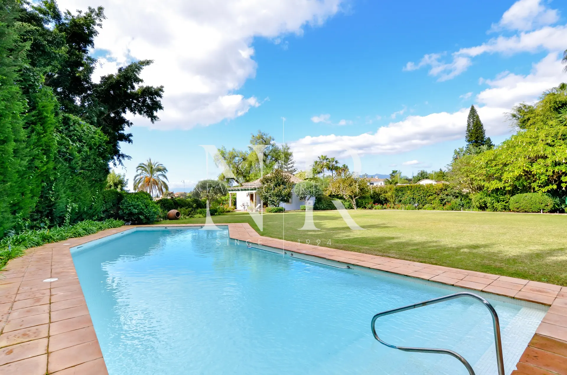Le jardin impeccablement entretenu est une grande étendue de pelouse avec la piscine privée chauffée d’un côté, une roseraie spectaculaire et un gazebo couvert avec une table à manger et une salle de bain avec douche pour d’agréables soirées en famille et entre amis.