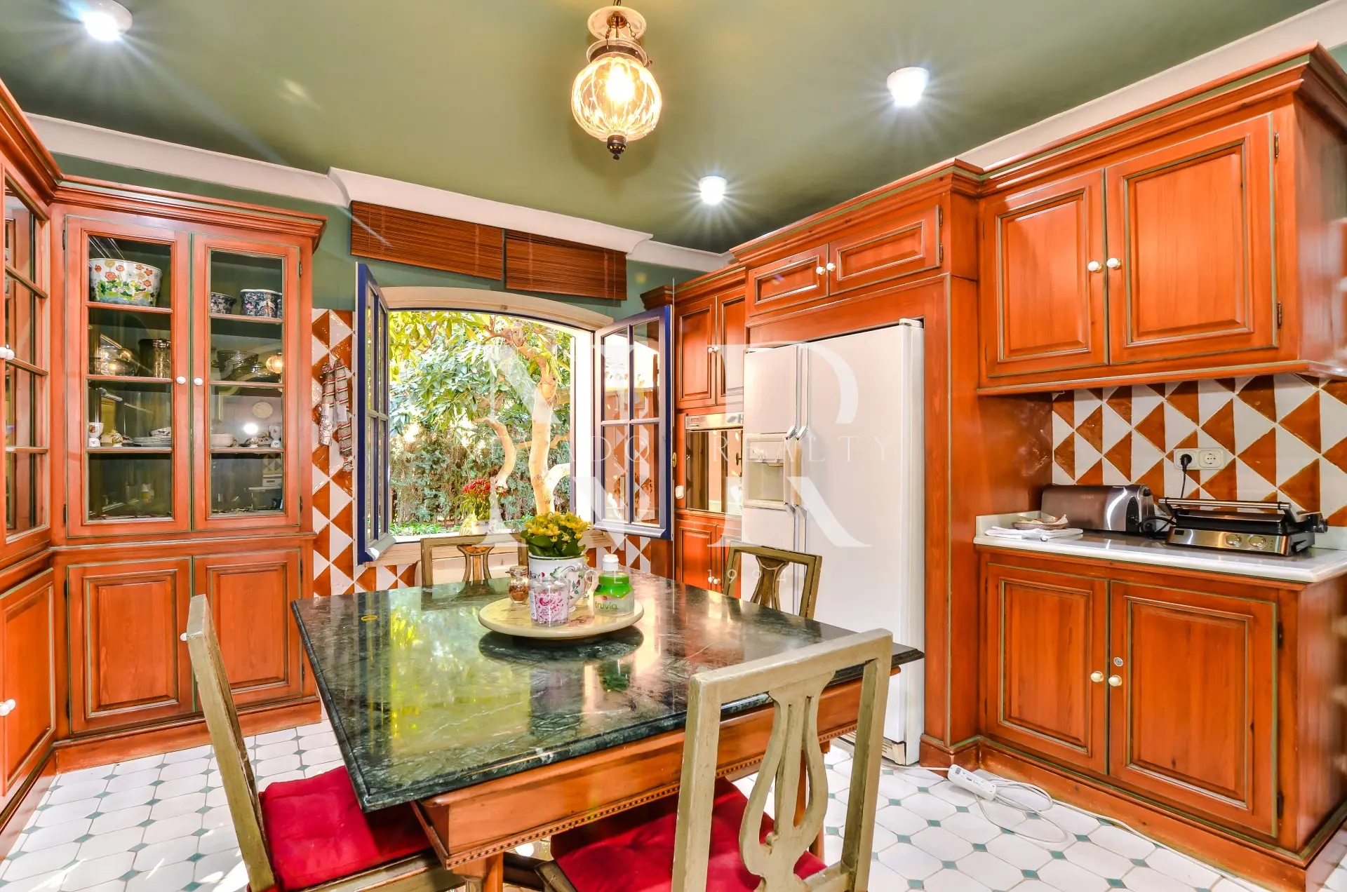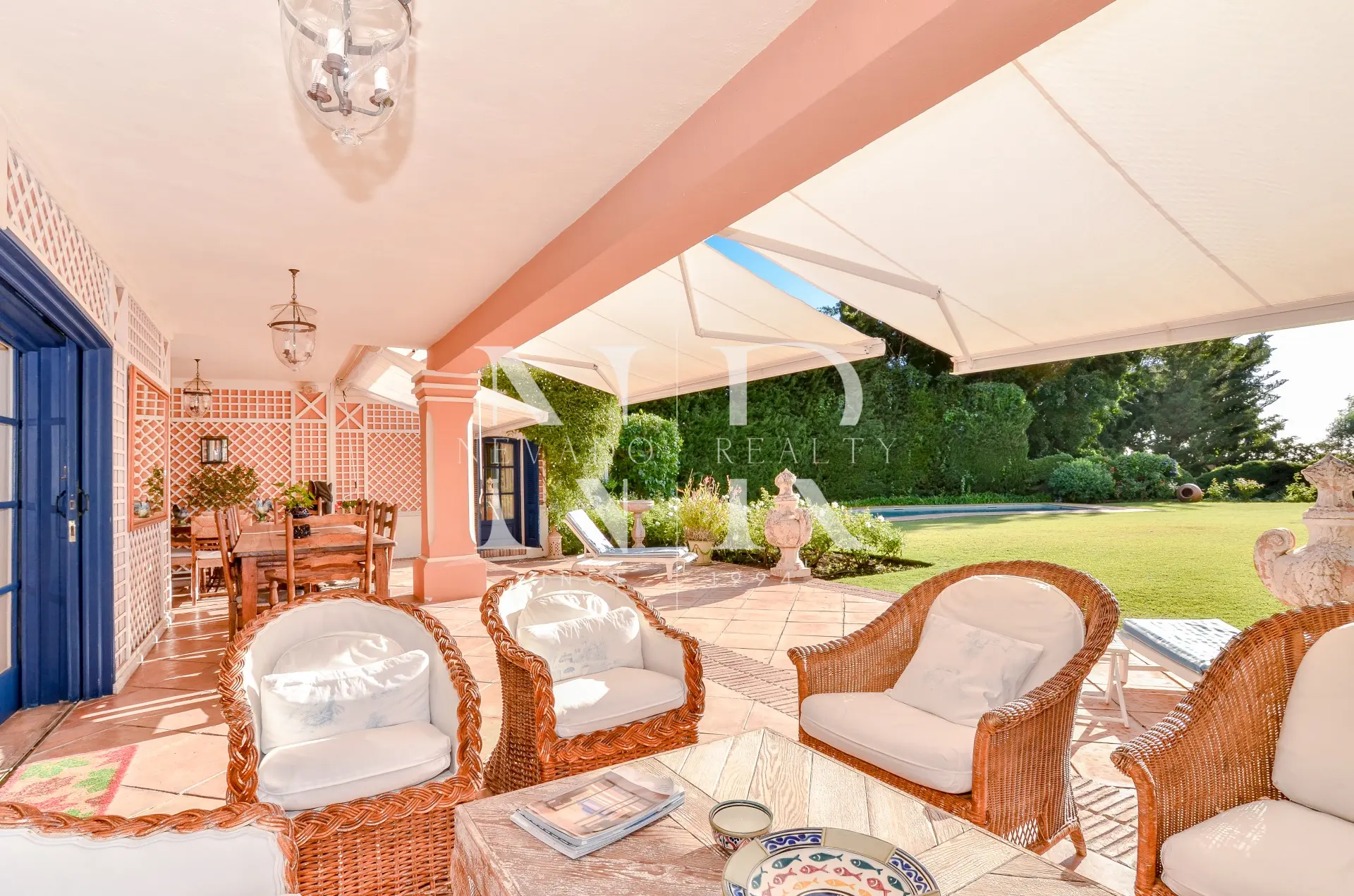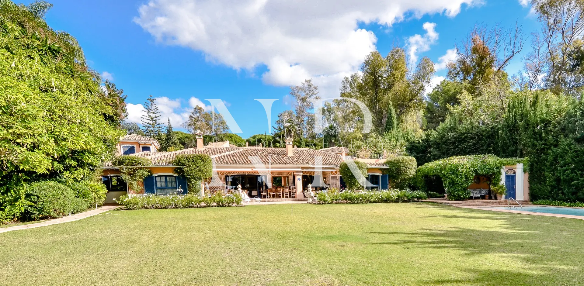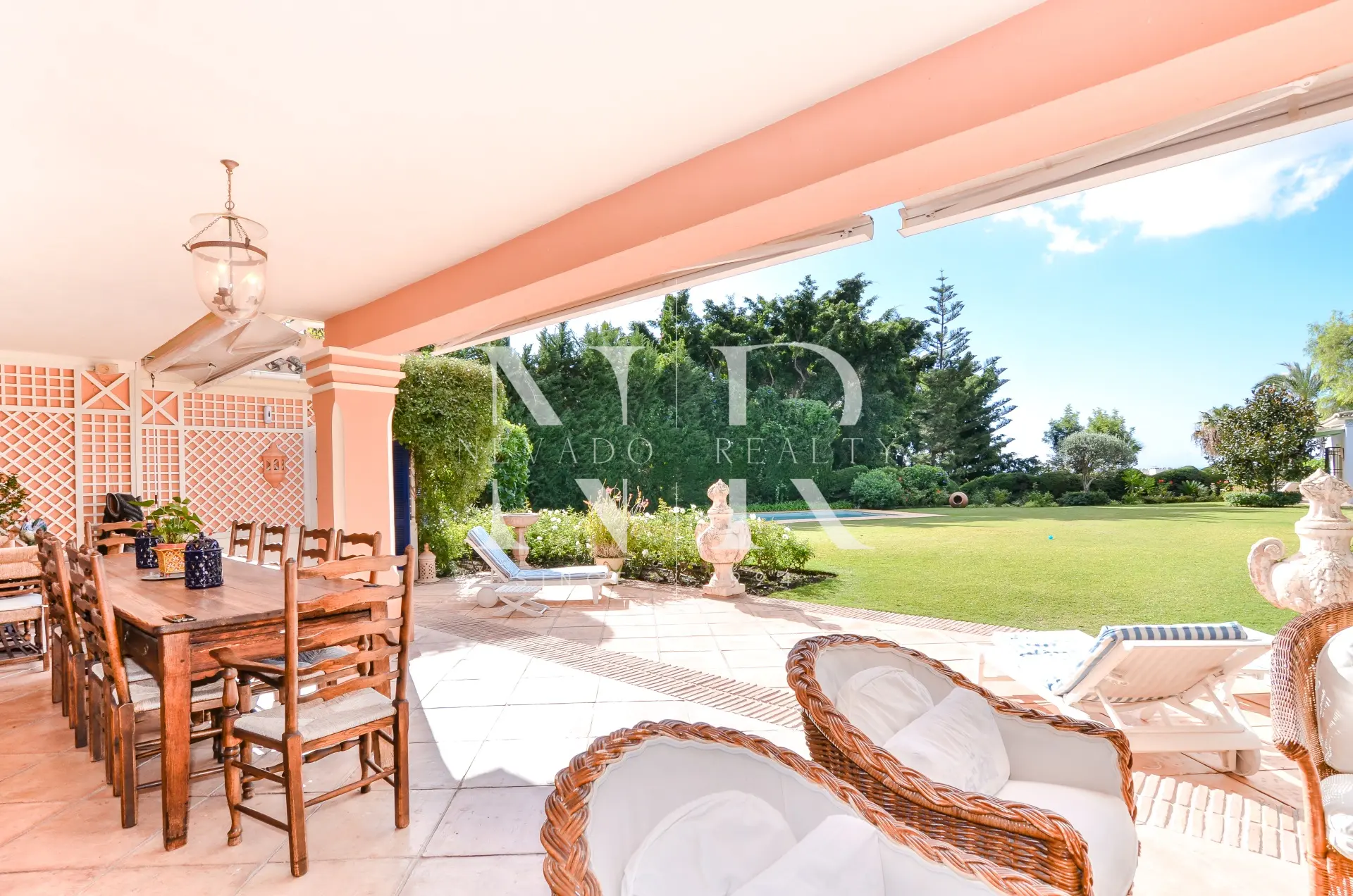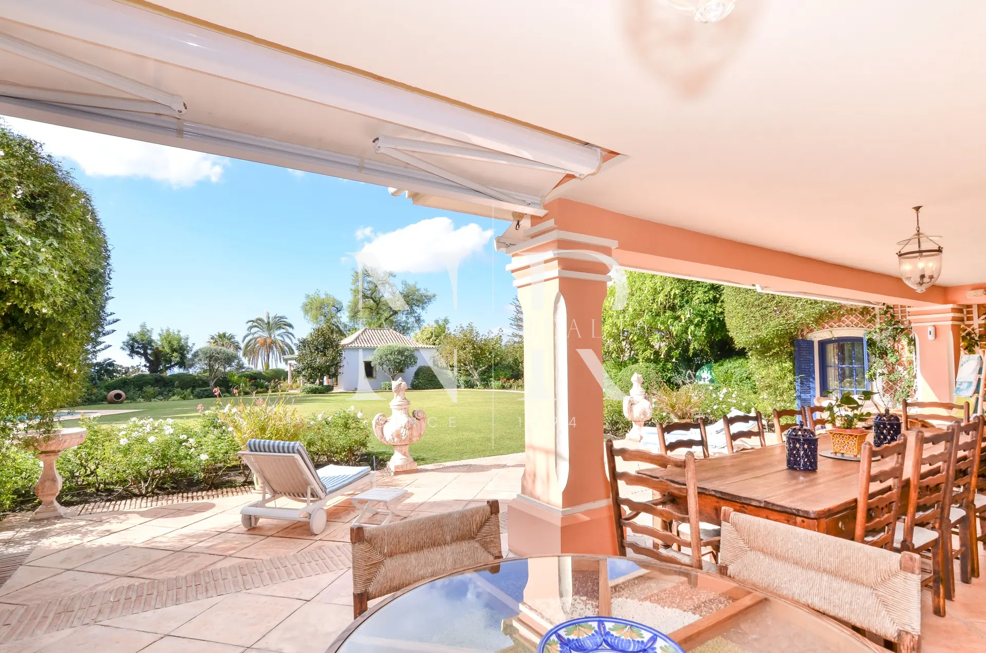 Le jardin impeccablement entretenu est une grande étendue de pelouse avec la piscine privée chauffée d’un côté, une roseraie spectaculaire et un gazebo couvert avec une table à manger et une salle de bain avec douche pour d’agréables soirées en famille et entre amis.