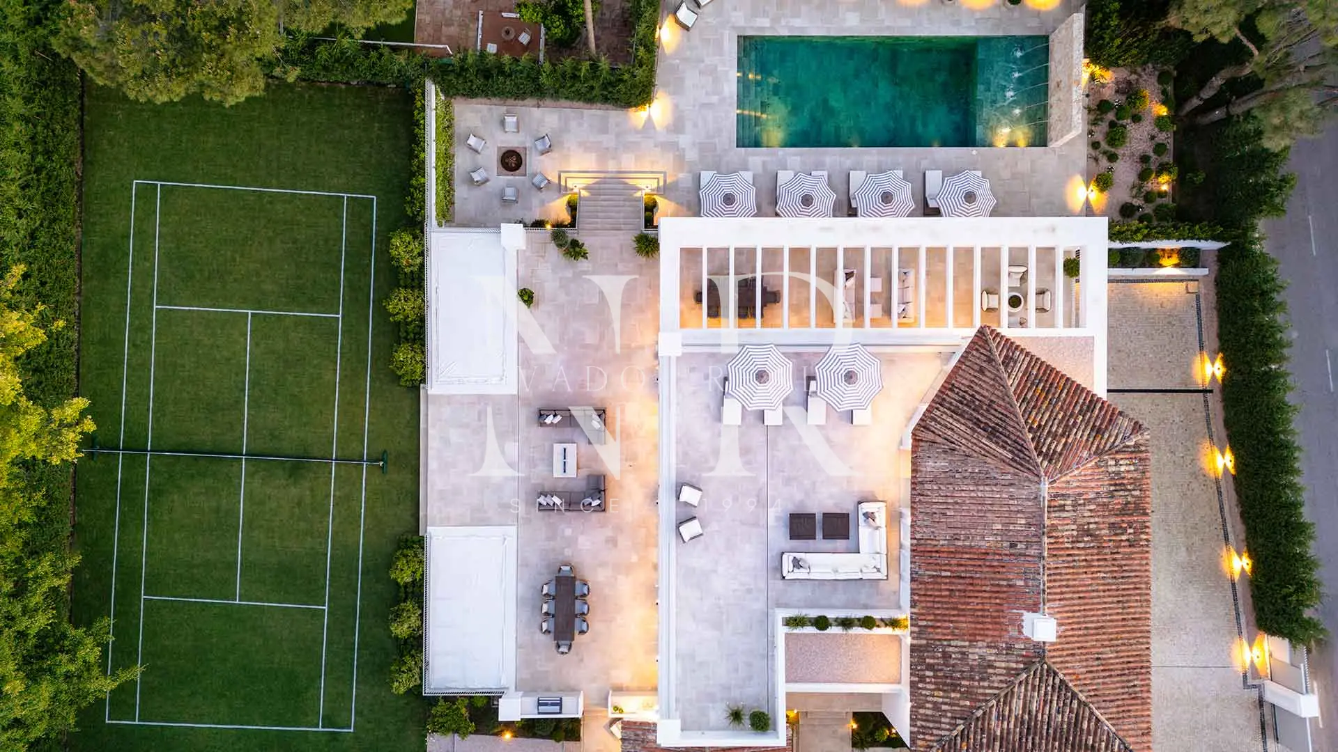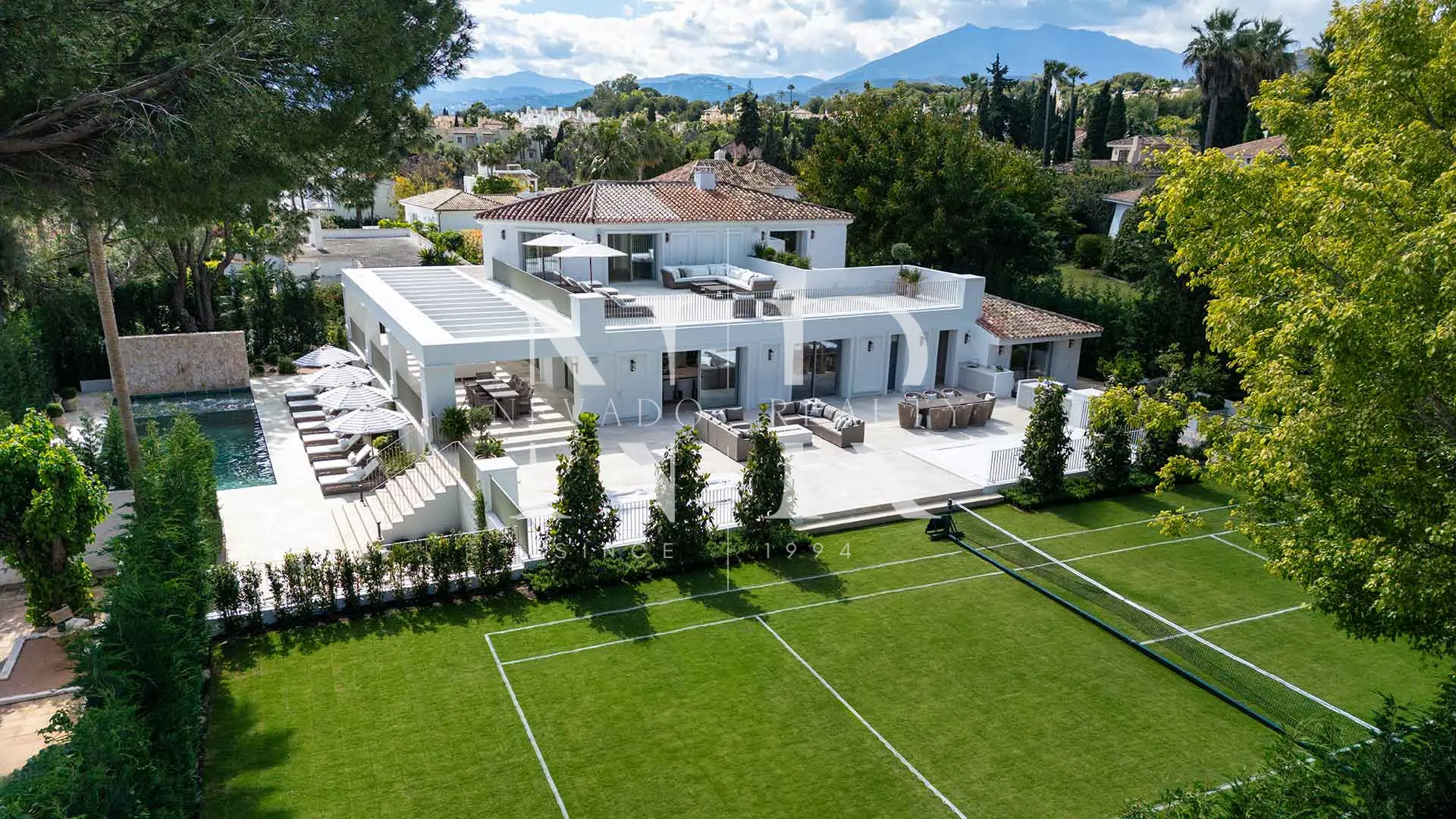 Entourée de jardins soignés et encadrée par une vue imprenable sur la montagne de La Concha, la villa dispose de grandes portes vitrées donnant accès à une grande piscine, à plusieurs espaces de salle à manger et de salon en plein air, et à l’un des rares courts de tennis privés de taille réglementaire de la Milla de Oro, une caractéristique exclusive qui distingue cette propriété.