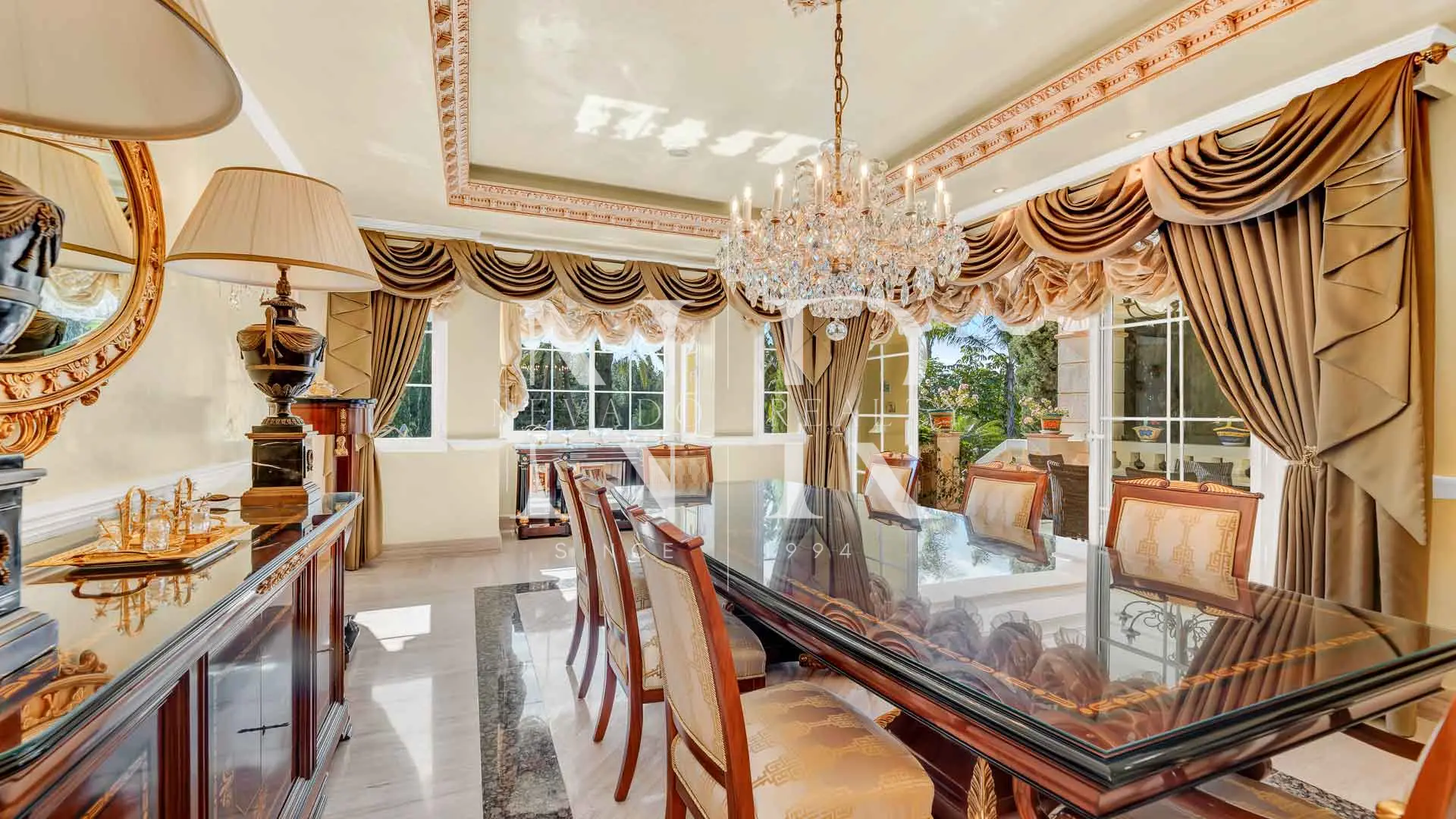 À l’intérieur, la villa impressionne par ses espaces généreux, conçus pour un quotidien luxueux et des réceptions réussies. Plusieurs pièces de réception formelles sont dotées de cheminées classiques, de finitions raffinées et d’un accès direct aux jardins et aux terrasses. La spacieuse salle à manger s’ouvre harmonieusement sur une cuisine design entièrement équipée, idéale pour recevoir des invités ou organiser des réunions de famille. La propriété comprend quatre suites spacieuses, chacune avec une luxueuse salle de bains et un dressing, offrant confort et intimité.