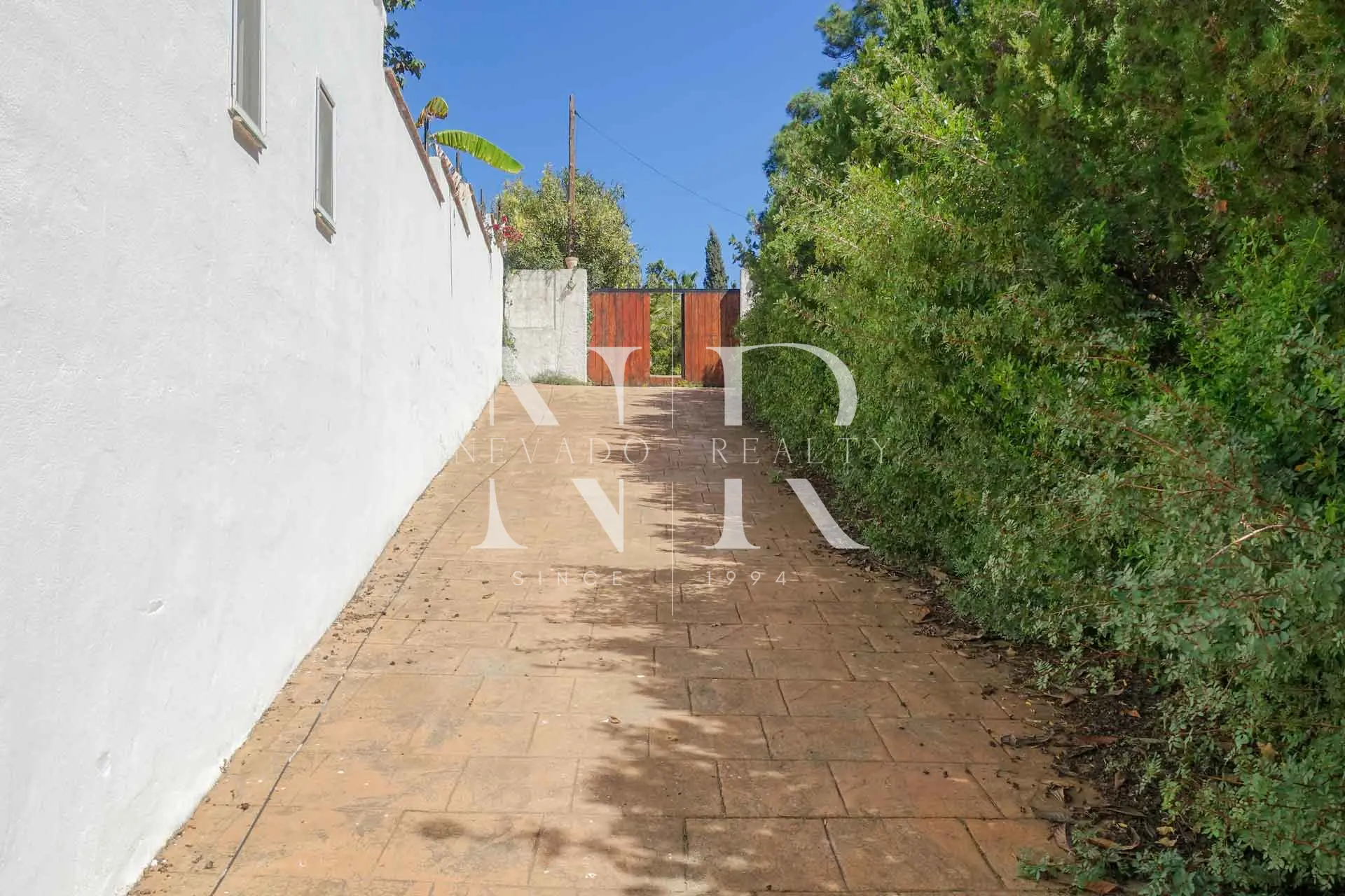 Sur le terrain se trouve une construction de style andalou avec une maison principale de 800 m², y compris de grands garages reliés par une charmante cour-jardin. L’habitation actuelle, bien qu’ayant besoin d’être rénovée, offre un grand potentiel pour créer une maison ou même développer un tout nouveau projet.