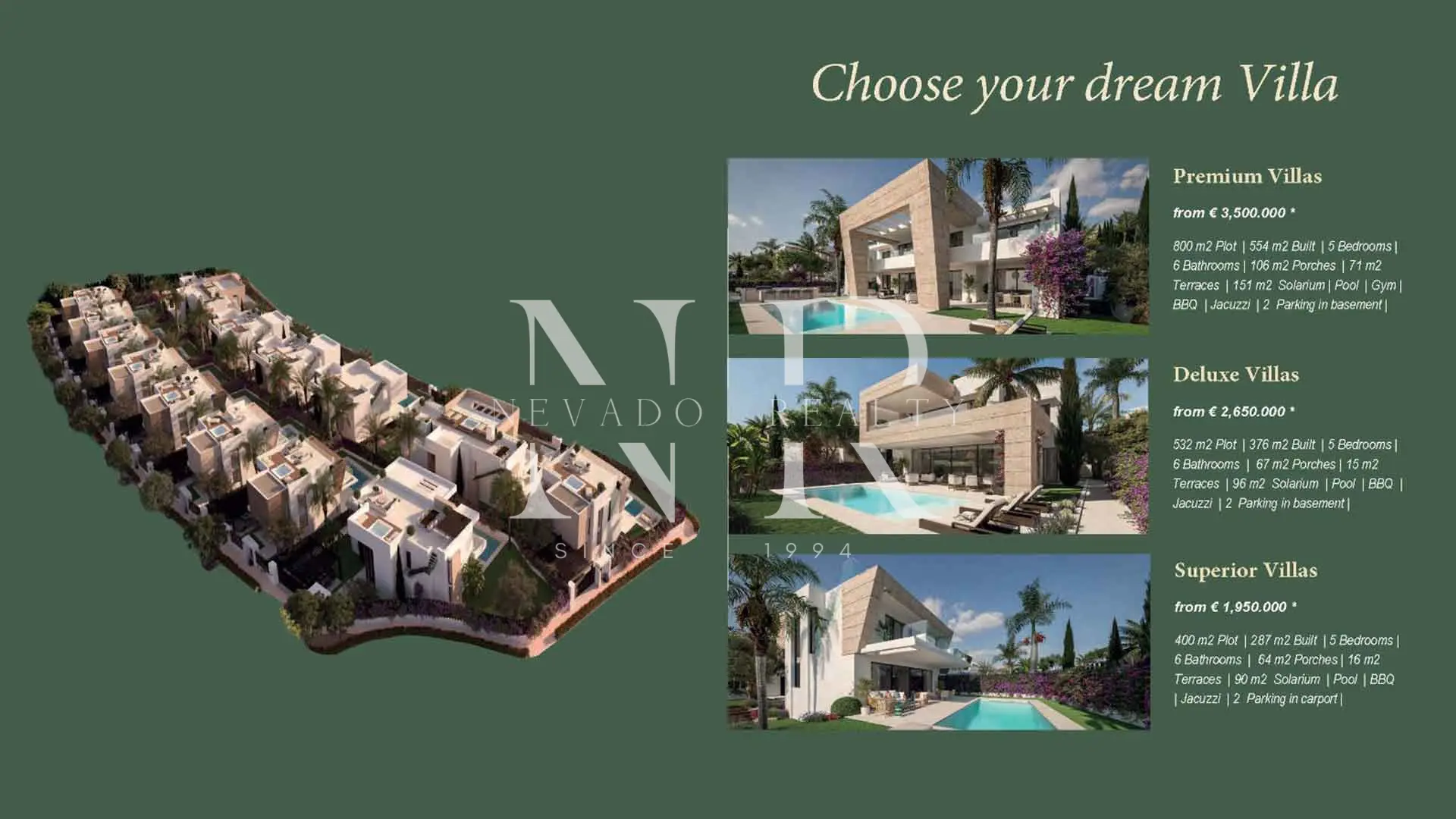 Three types to choose from (Superior, Deluxe and Premium) with 5 en-suite bedrooms, generous living spaces, lounges opening onto porches and tropical gardens, large private swimming pool, barbecue, solarium with jacuzzi and multi-purpose basement (ideal as a family room or gym).