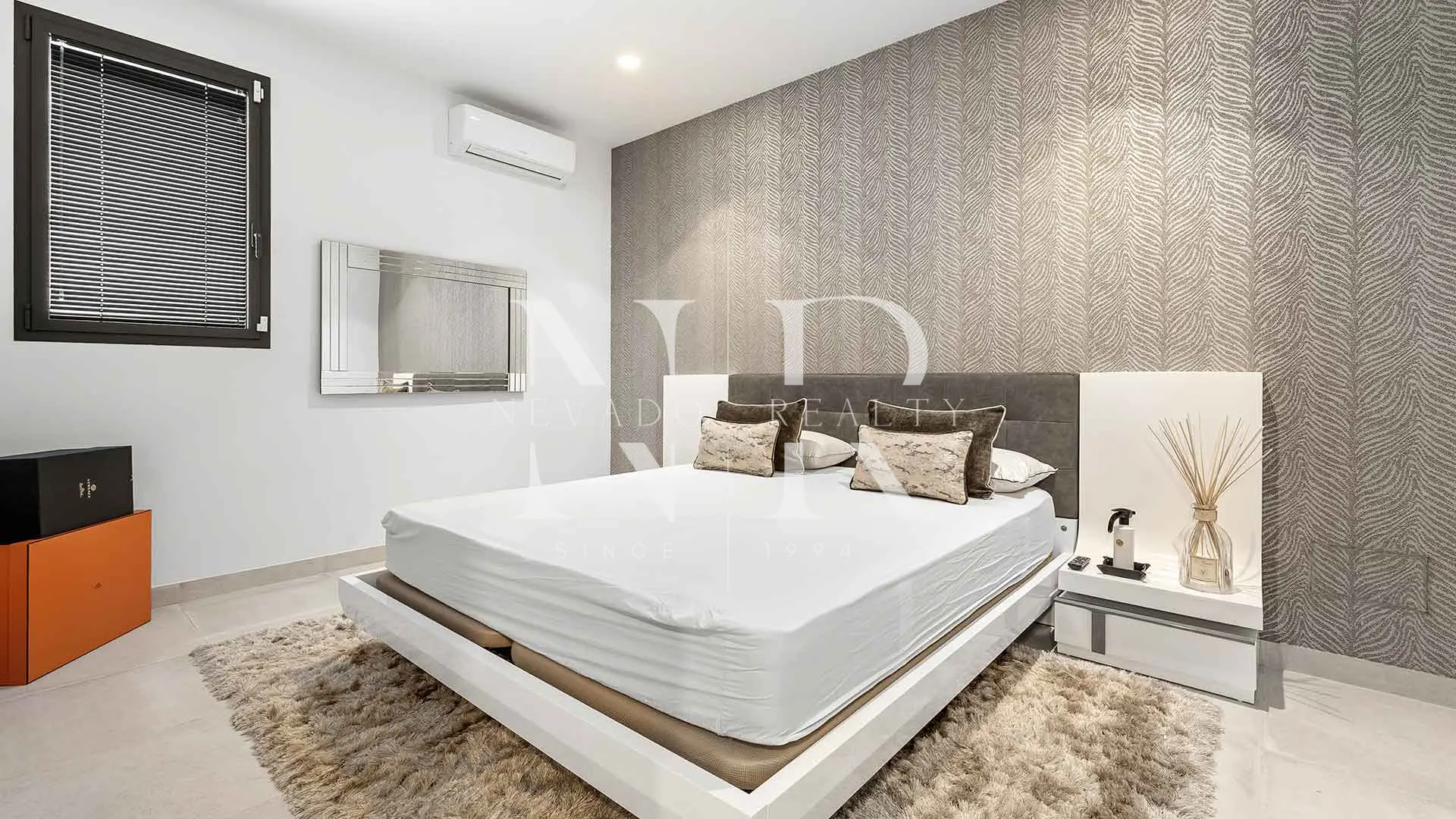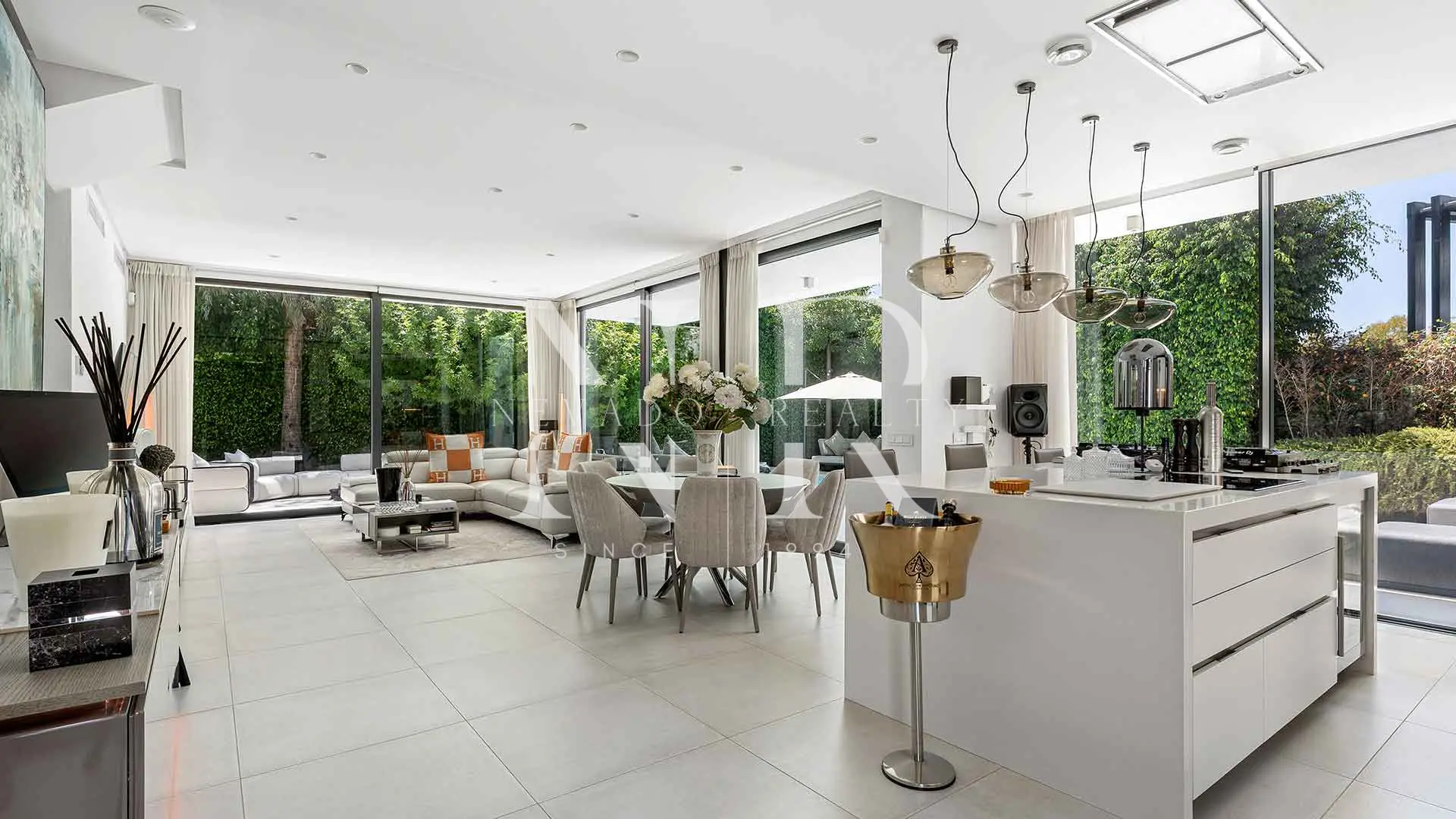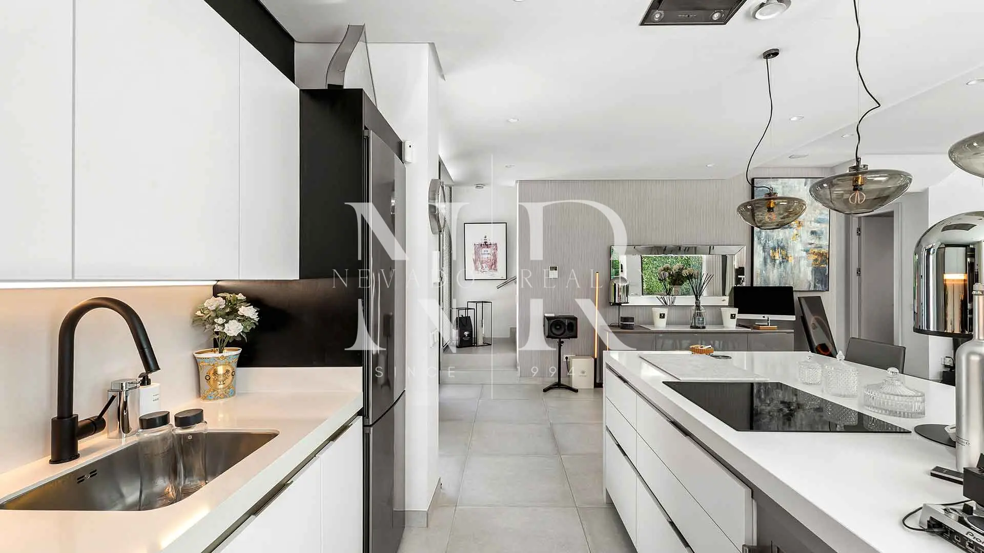 The villa is spread over three levels and offers an open, bright and elegant design. Fine materials, such as natural wood and stone, add warmth and sophistication. On the main floor, the open-plan living room, dining room and kitchen with high-end NEFF appliances are connected by large windows to the outdoor terrace, equipped with a barbecue and heated saltwater swimming pool.
