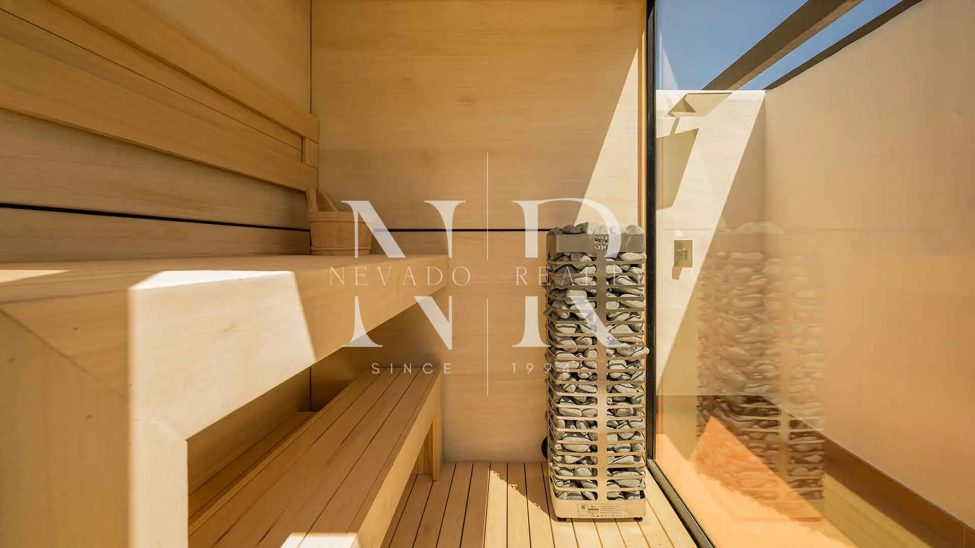 Its most exclusive features include the private rooftop terrace with a Jacuzzi, sauna, and bathtub, and an elegant electric fireplace. The walk-in closet adds functionality without sacrificing aesthetics, further enhancing the character of this unique residence.