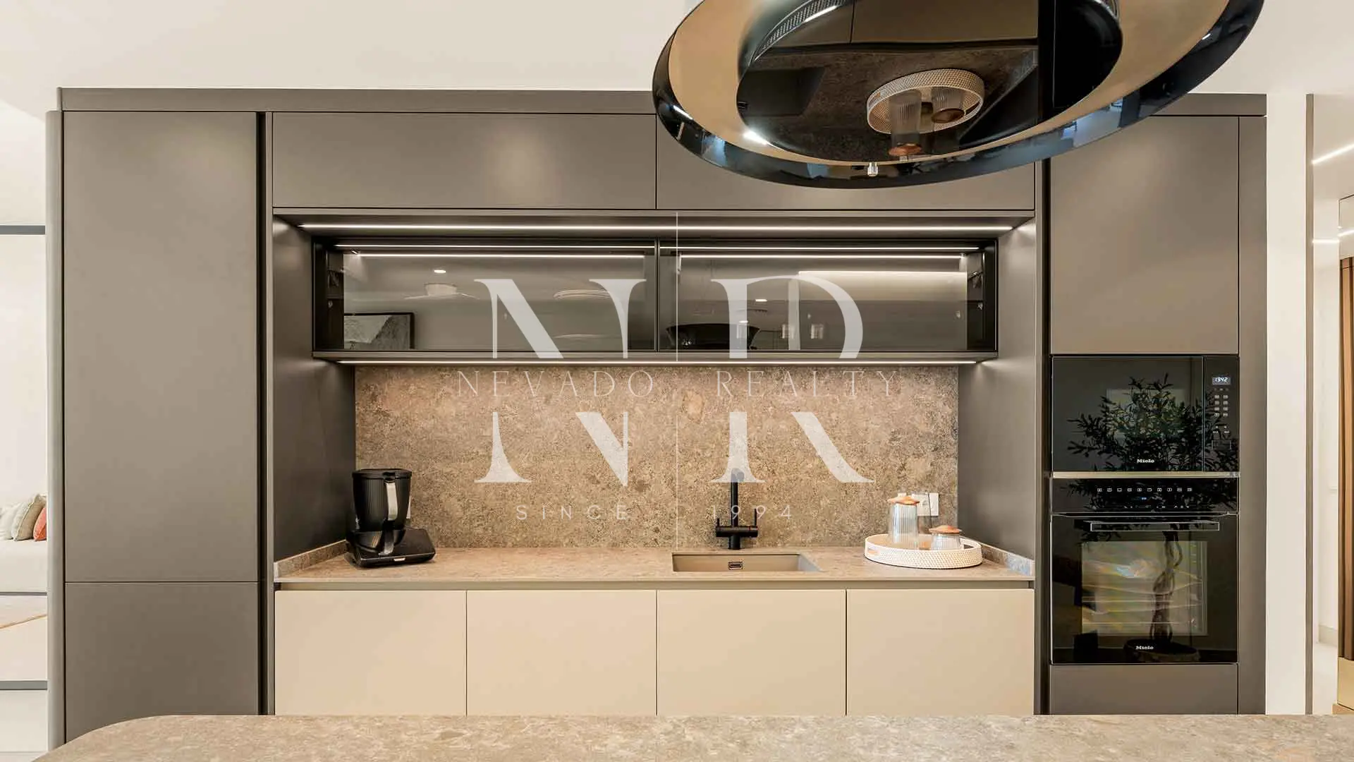 Its layout includes three spacious bedrooms and two modern bathrooms, a bright open-plan living room with direct sea views, and a master bedroom that opens onto the terrace, creating an environment where natural light and panoramic views take center stage. The designer kitchen is equipped with state-of-the-art appliances, a wine cellar, double dishwasher, and Thermomix. Every detail, from the Bang & Olufsen sound system to the chosen finishes, has been carefully considered.