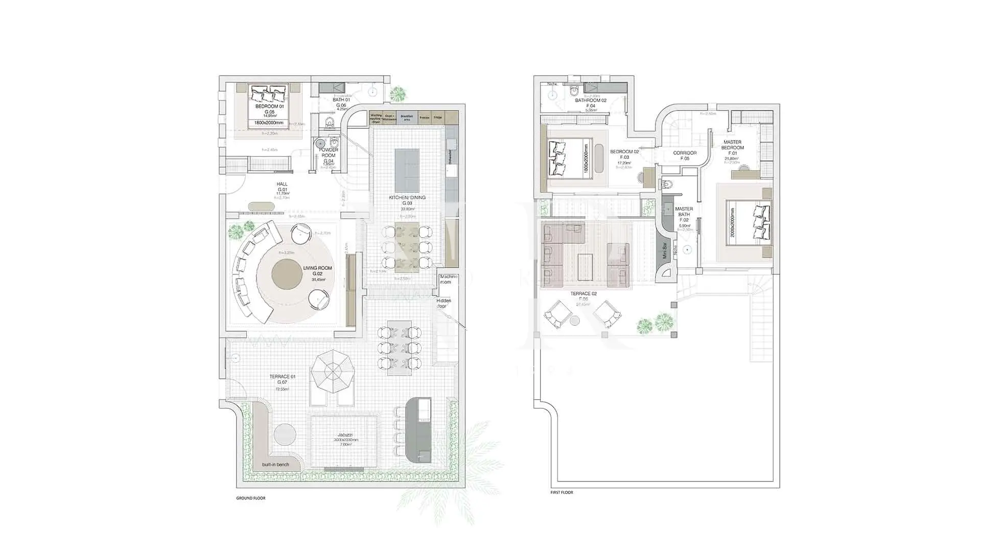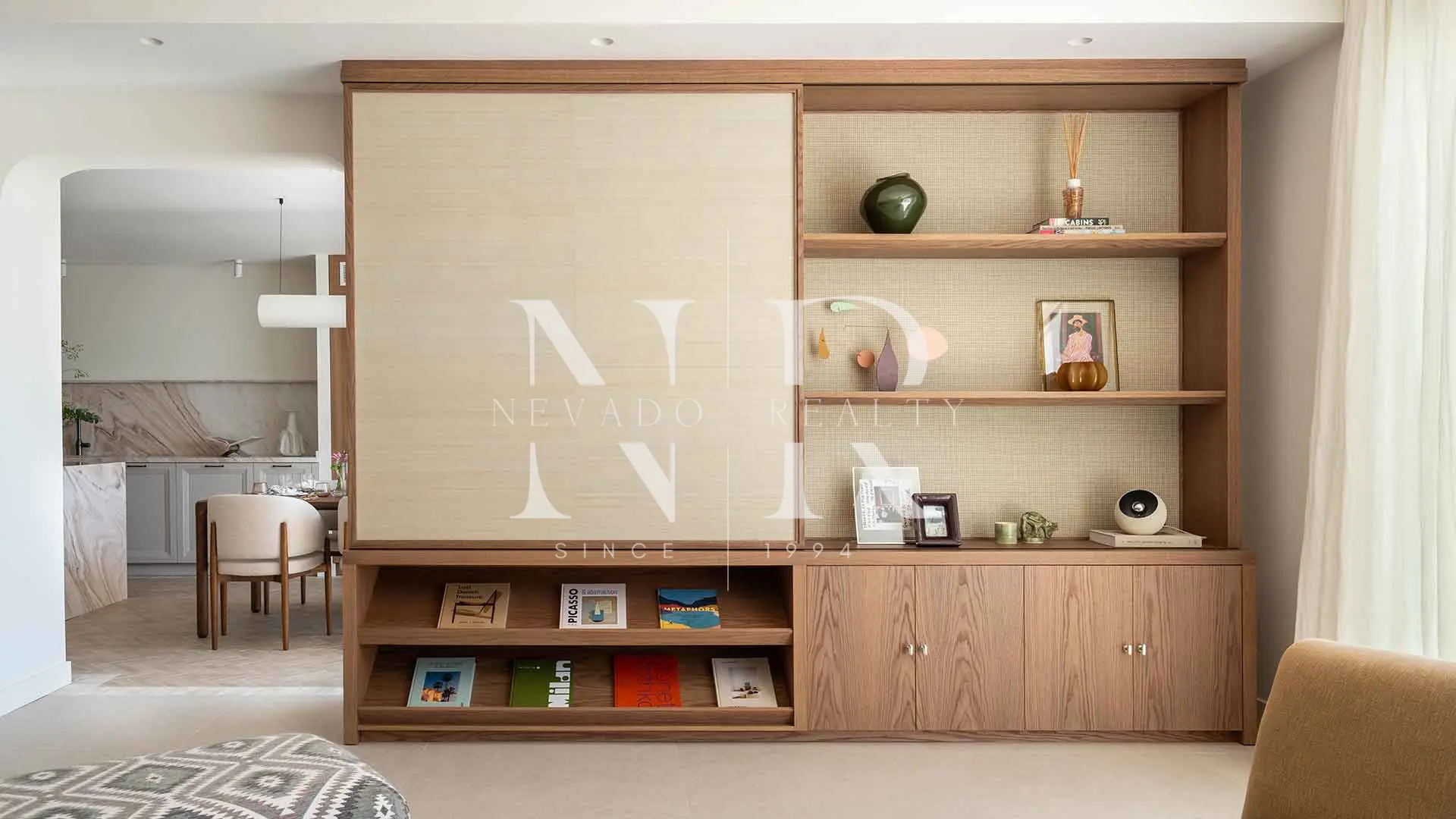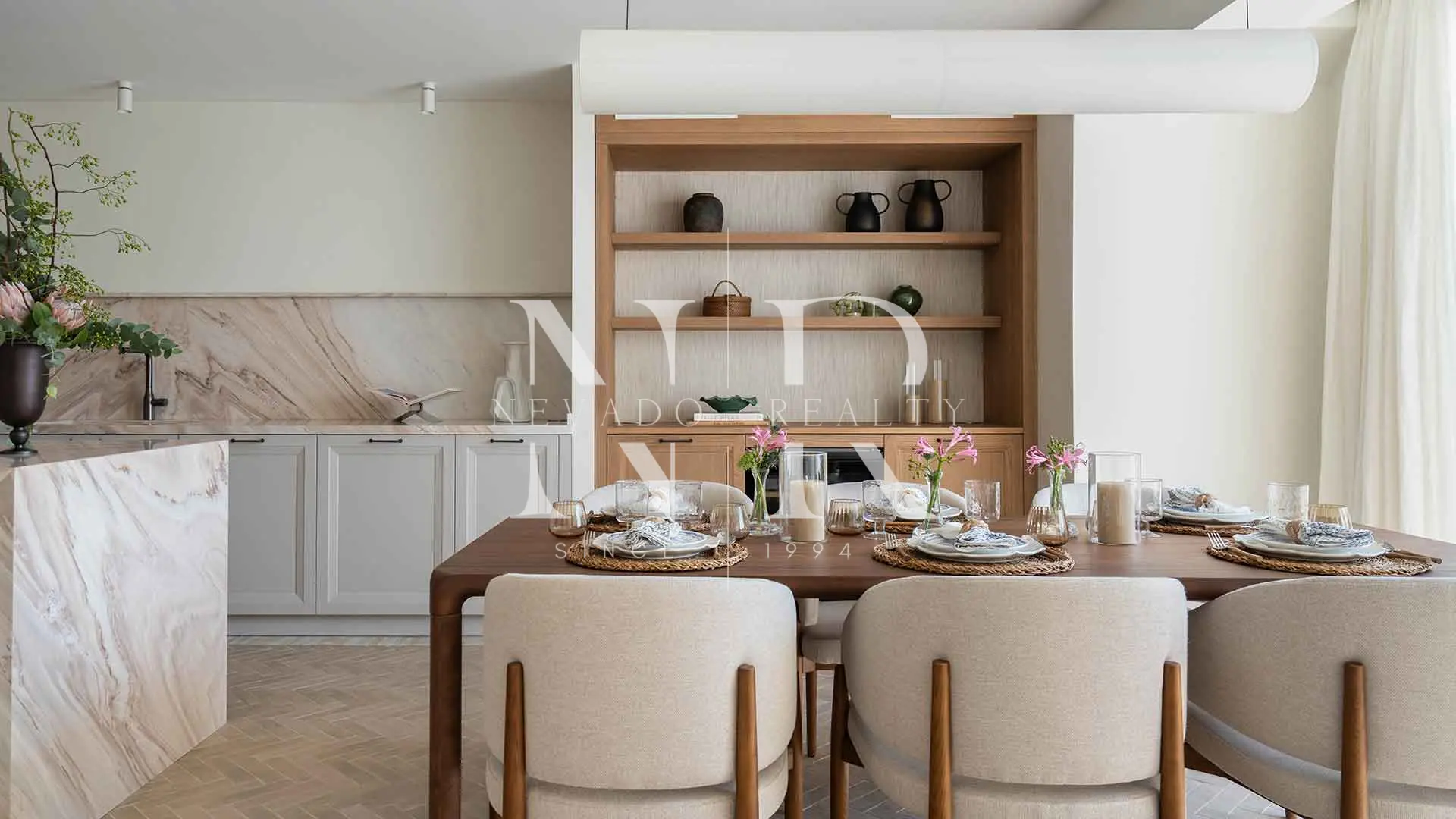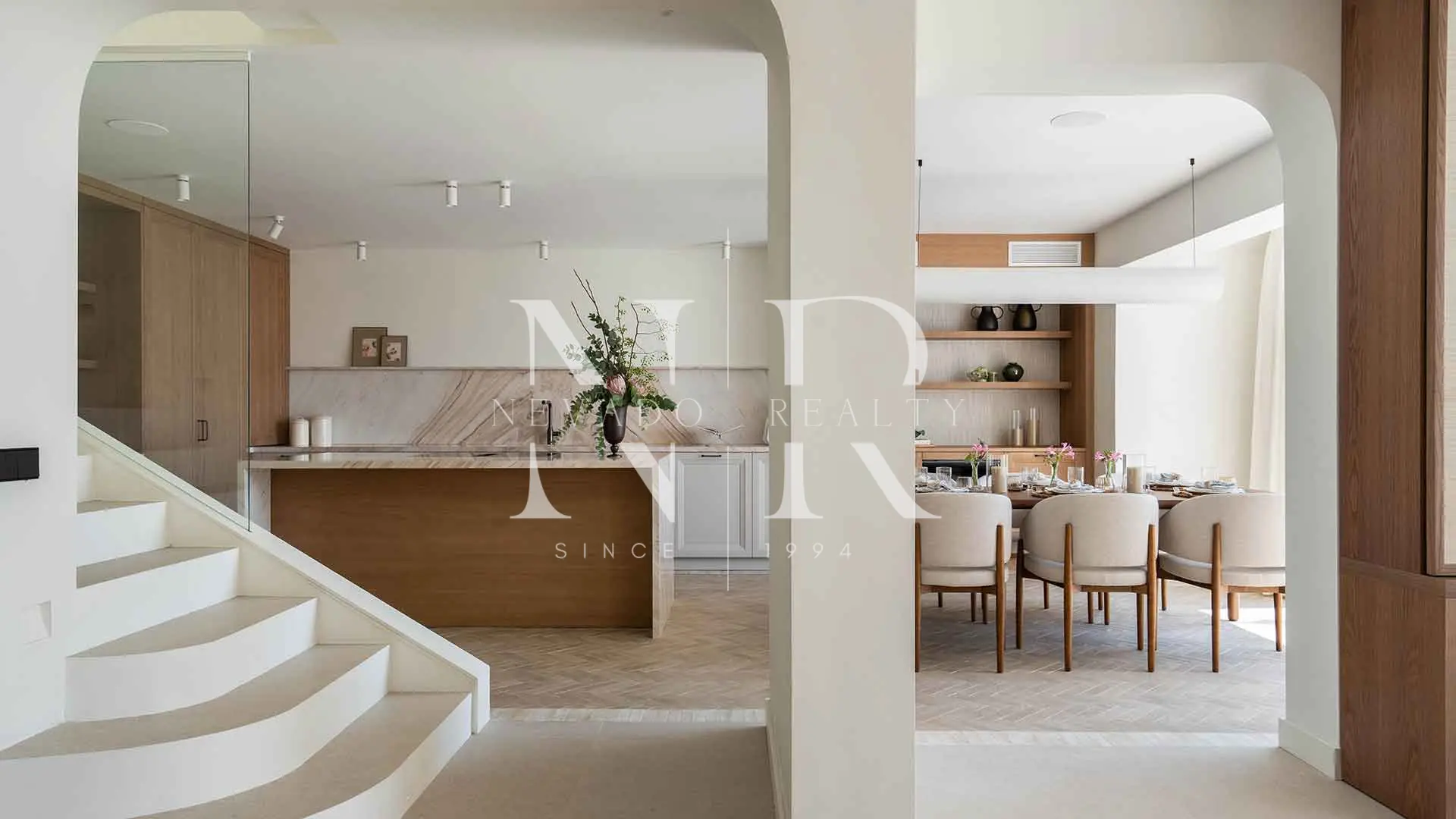 The result is a residence that combines timeless elegance with contemporary comfort, offering a Mediterranean style of life. On the main floor, the natural light shines through every day thanks to the large windows that shade the exterior, creating a perfect connection between the interior areas and the private garden. The living room, expanded and furnished, integrates with the dining room and a modern social kitchen, converting this space into the green heart of the living room.